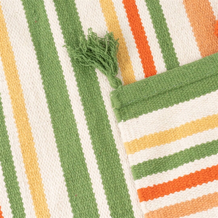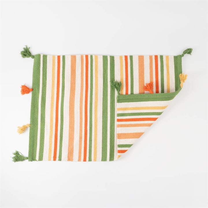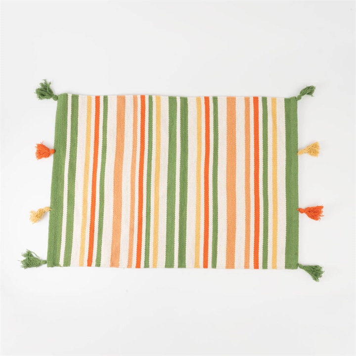 玄関マットや姿見の前など、お部屋のさまざまな場所で使いやすい50×70cmのマットです。1年中お使いいただける綿素材を採用しました。カラフルなマルチボーダーとフリンジはお部屋を明るく見せてくれます。お部屋のアクセントにしたり、子供部屋にもピッタリなデザインです。 ▼オリジナルラグ制作ストーリーはこちら