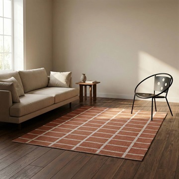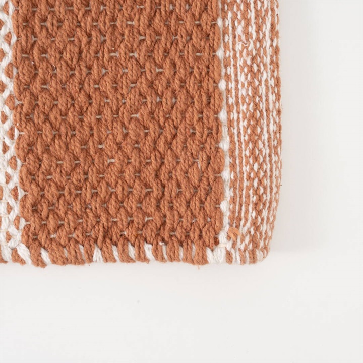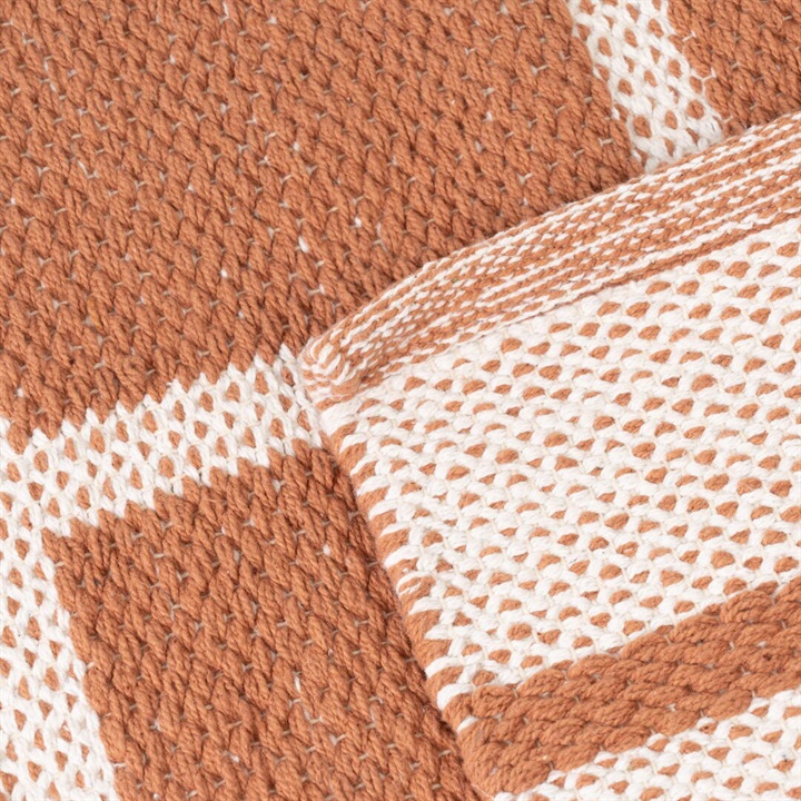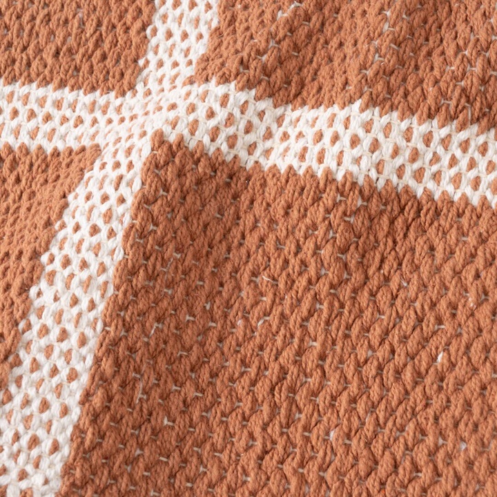 ゆったりとしたくつろぎの空間にぴったりな130×190cmのフロアラグ。ファミリー層のリビングルームやダイニングテーブルの下に敷いて、家族のひと時に活躍します。1年中お使いいただける綿素材を採用しました。落ち着いたカジュアル感と洗練されたモダンテイストを両立したチェック柄。お部屋の雰囲気を垢抜けさせてくれるお洒落なデザインです。テラコッタカラーが温かみのある空間を演出してくれます。長方形のチェックが、ほどよい抜け感のポイントです。 ▼オリジナルラグ制作ストーリーはこちら