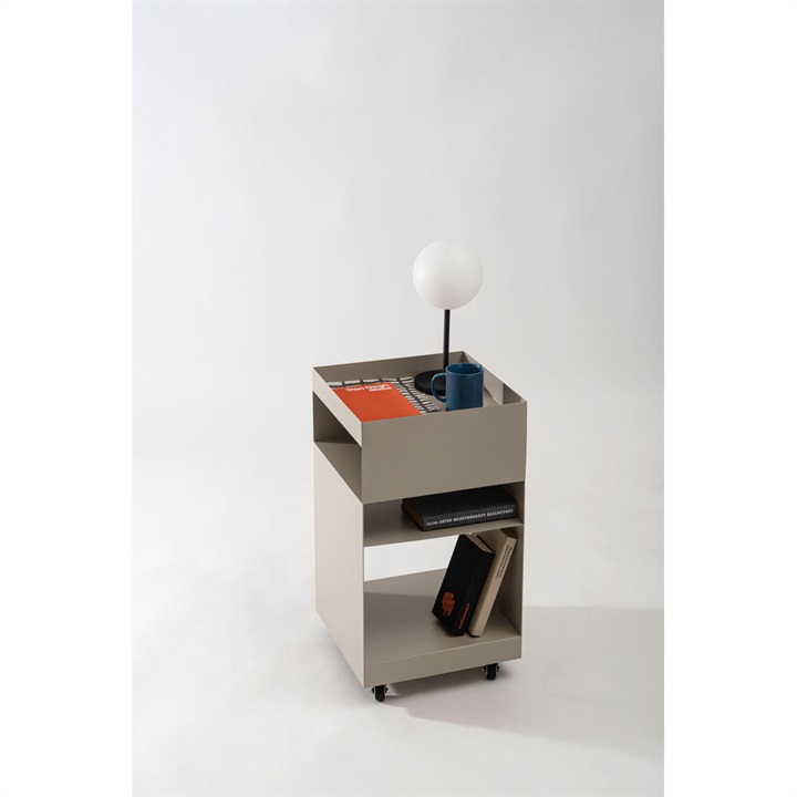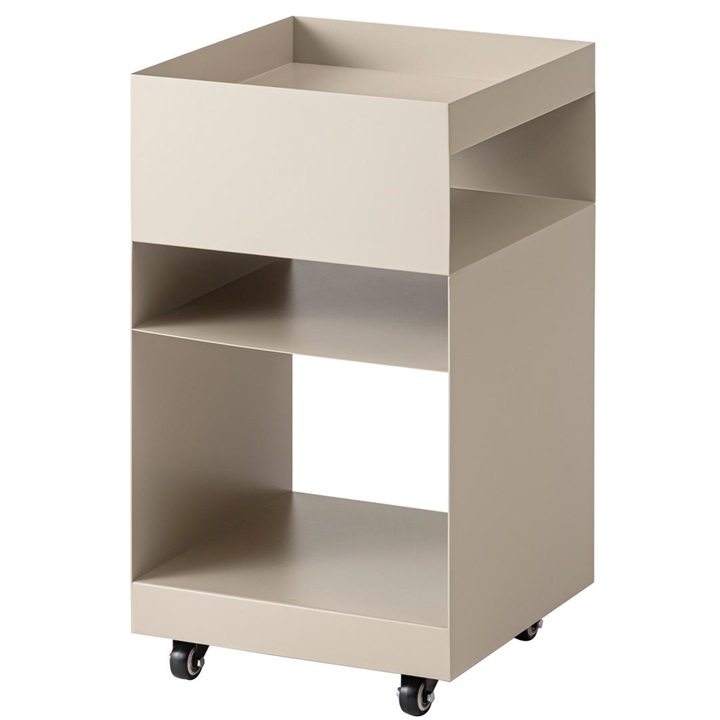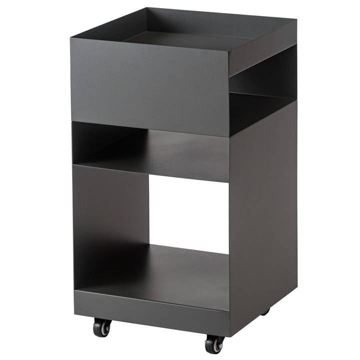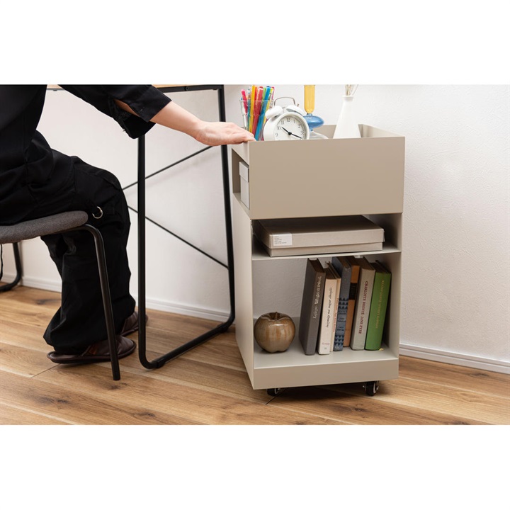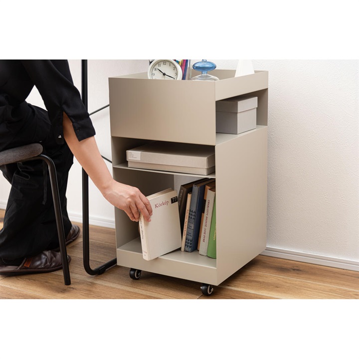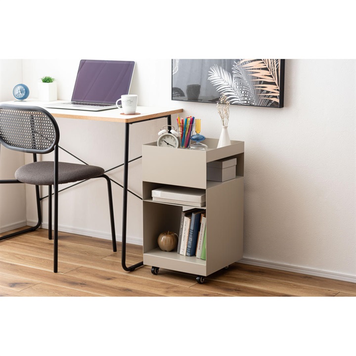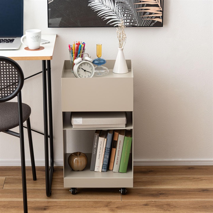 マットな質感と収納力が魅力的なサイドテーブルワゴン。現代アートのような幾何学的デザインが目を引き空間の印象を高めます。キャスター付きなので、室内の移動を楽に行うことができ、ライフスタイルやシーンに合わせて活用していただけます。収納力が高く移動もできるので、サイドテーブルとしてだけでなくデスクサイドやキッチンワゴンとしても活躍。天板部分は囲いが付いているので置いた物が落ちにくい設計なのが嬉しいポイント。汚れてしまっても簡単に拭き取ることができ清潔な状態を保てます。