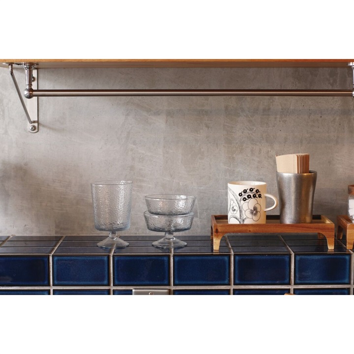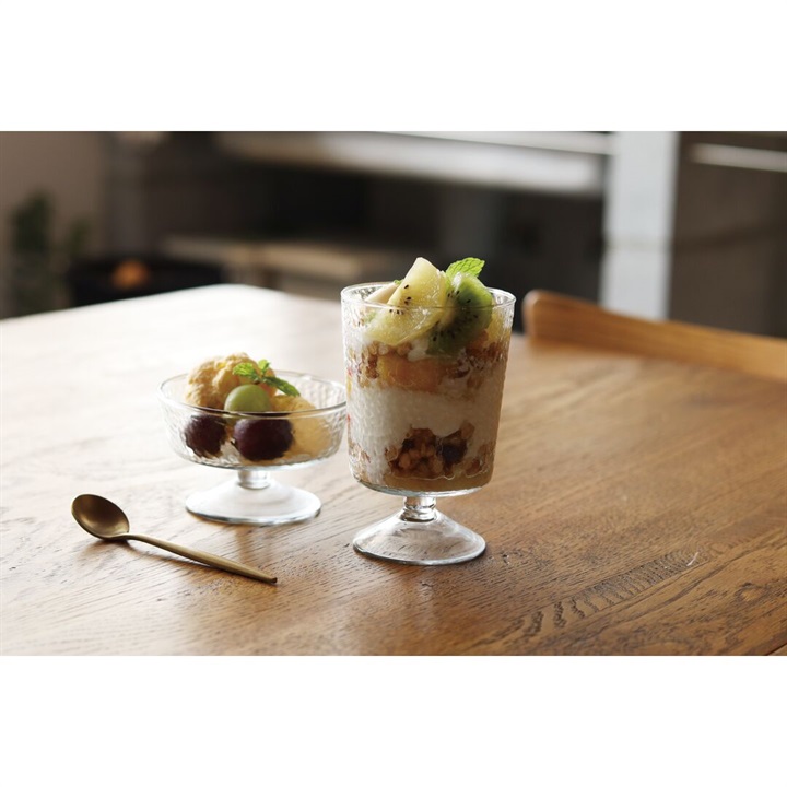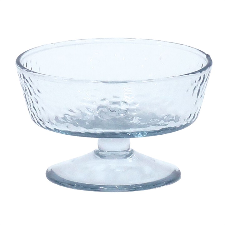 いつものデザートタイムが特別になる、脚付きのアイスクリームグラス。リサイクルガラスで作られており、表面に凹凸が施された美しいデザインです。どこか懐かしい脚付きのレトロな雰囲気はアイスクリームとの相性が抜群です。いつものデザートタイムを特別な気分にさせてくれます。スタッキング可能なので、コンパクトに収納できるのも嬉しいポイント。小さく平らなアイスクリームグラスは容量140ml。アイスクリーム以外にも、フルーツやプリン、ヨーグルト、前菜など 様々なデザートや料理の盛り付けに活躍してくれます。 ▼プレゼント用のラッピングバッグはこちら