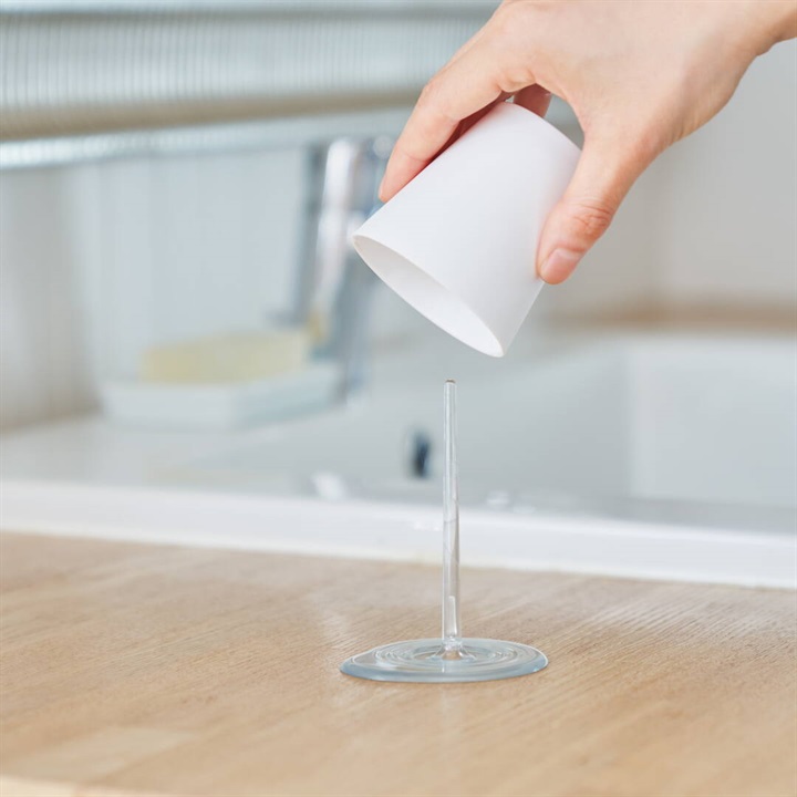 コップをスタンドに被せると、液体がこぼれているように見えるうがいコップとスタンドです。