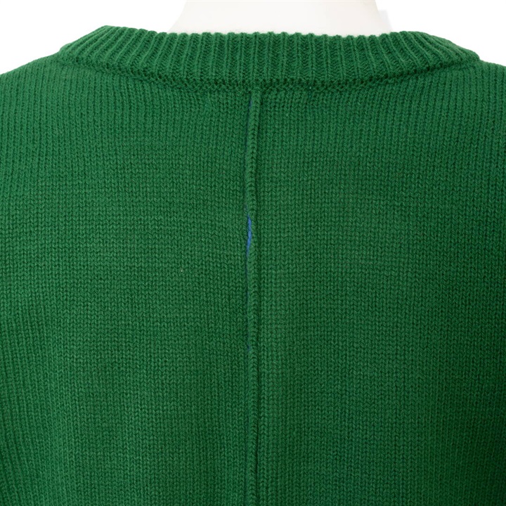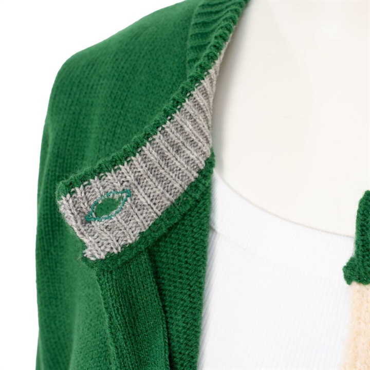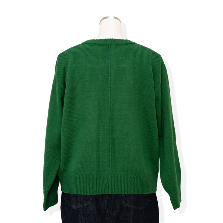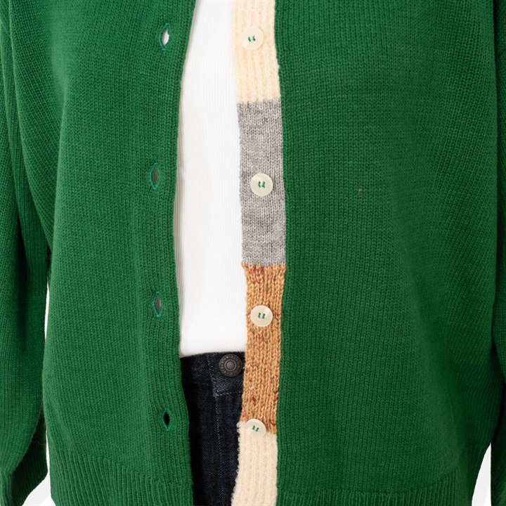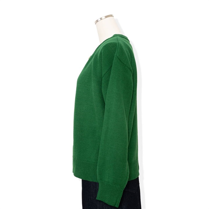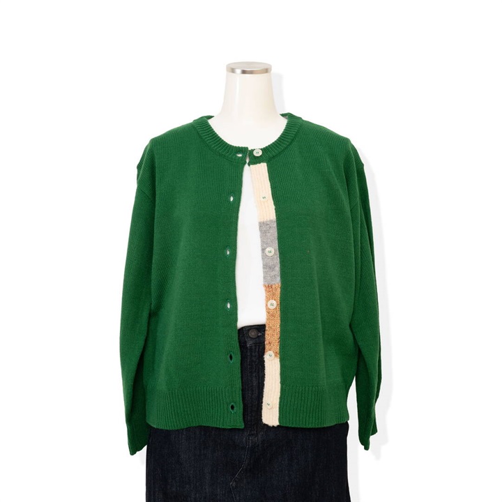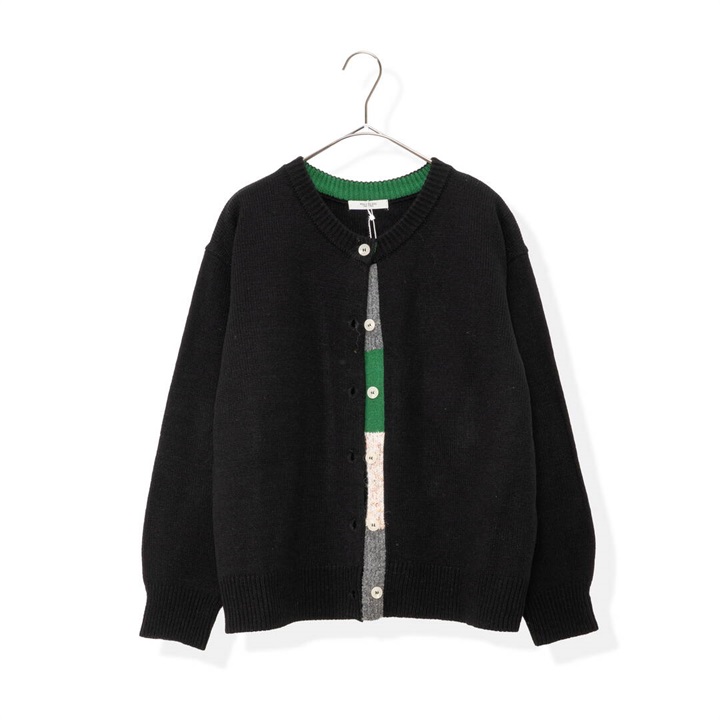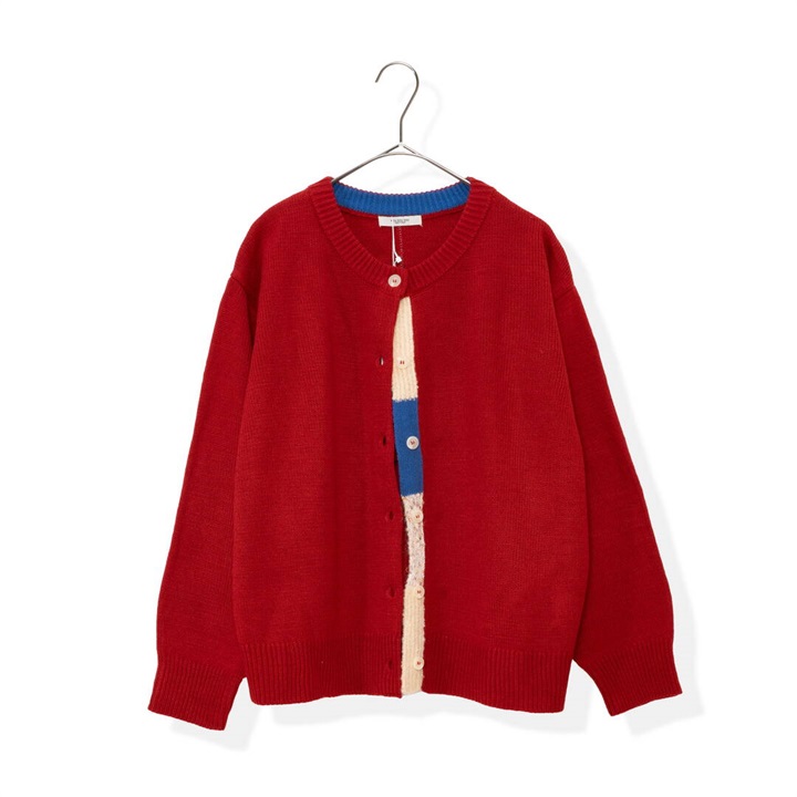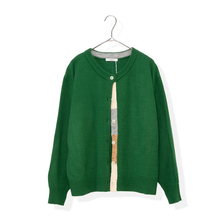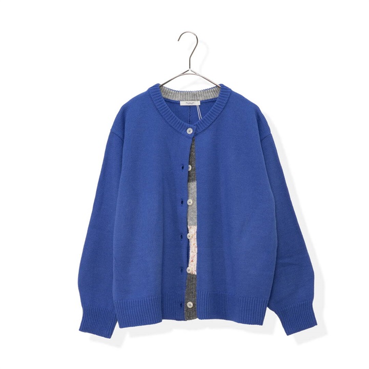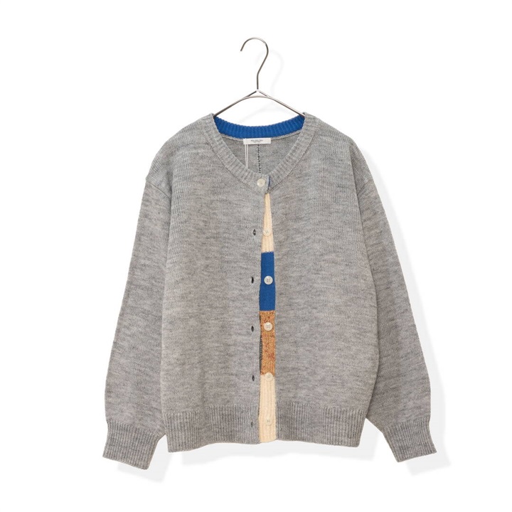 ボタンを開けた時に見える下前立てに異素材を組み合わせ、遊び心を利かせたデザインのPOU DOU DOU定番カーディガン。ウールブレンドの暖かみのある糸で編み立てました。ドロップショルダーにゆとりのある袖巾で、重ね着しやすく重宝する1枚です。