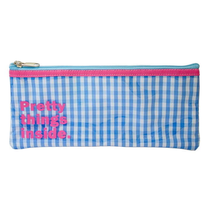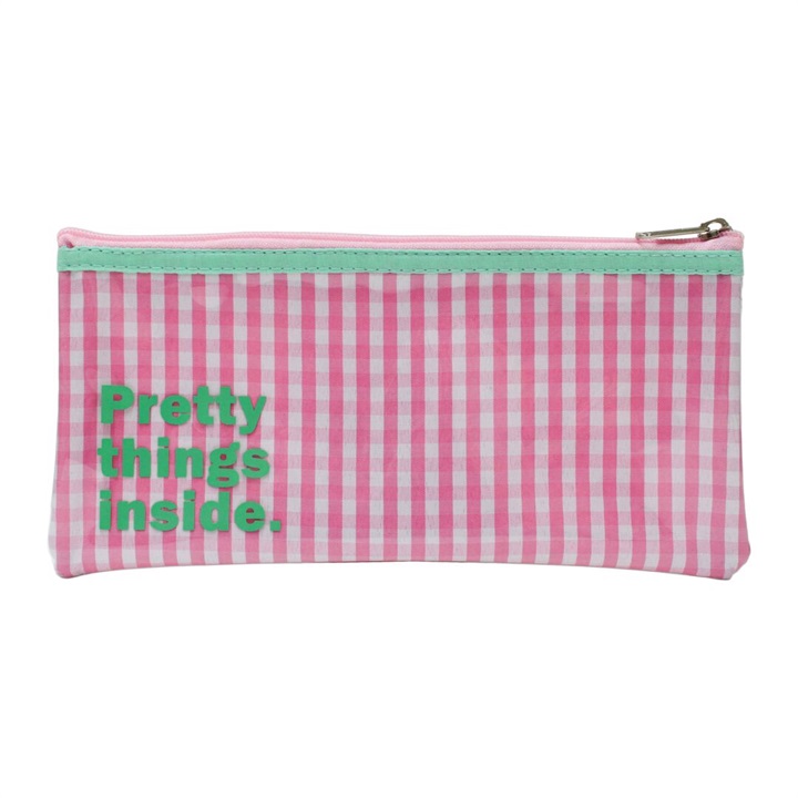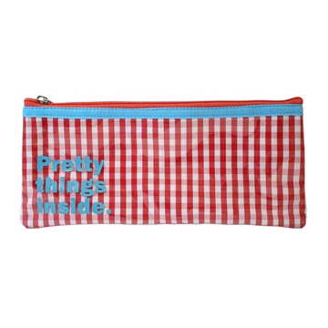 パキッとしたカラーのギンガムチェックが印象的で差し色が可愛いポーチです。ペンポーチやバッグの中の小物をまとめるのにとても便利なサイズです。表面はビニール加工がされているので汚れにくいのも嬉しいポイント。 ▼プレゼント用のラッピングバッグはこちら