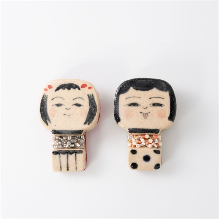 陶器とビーズの組み合わせがレトロで可愛いブローチ。ワンピースやバックにつけて一緒にお出かけを楽しんでください。青森こけし風:青森県のこけし工人「阿保六知秀さん」の作品がモデルになっています。鳴子こけし風:まんまるな目元が可愛らしい宮城県の鳴子風のこけしです。 ▼プレゼント用のラッピングバッグはこちら