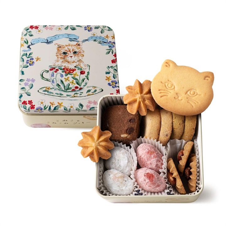 こねこがこねこねいっしょうけんめいつくったような、まるくてかわいらしいクッキーをたくさんカンのなかにつめあわせました。サクほろ食感のクッキーを詰め合わせたおすすめギフト缶です。8種類のクッキー、2種類のスノーボールクッキーが入ったバラエティ豊かな食感、フレーバーをお楽しみいただけます。〈利光 春華さんとのコラボパッケージ〉水彩やアクリル画を使用した、カラフルで優しいタッチの表現から生まれる猫のイラストが印象的。