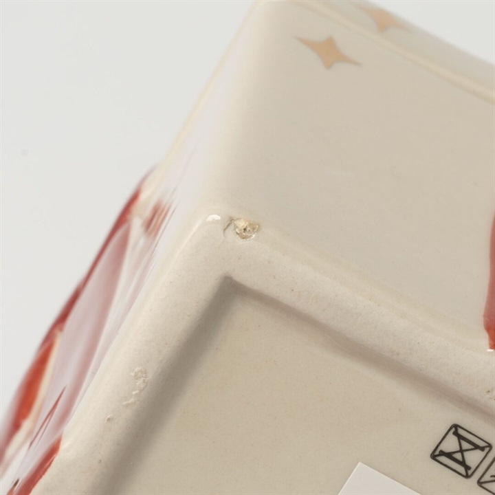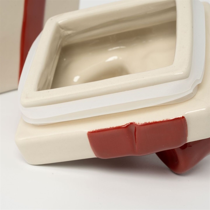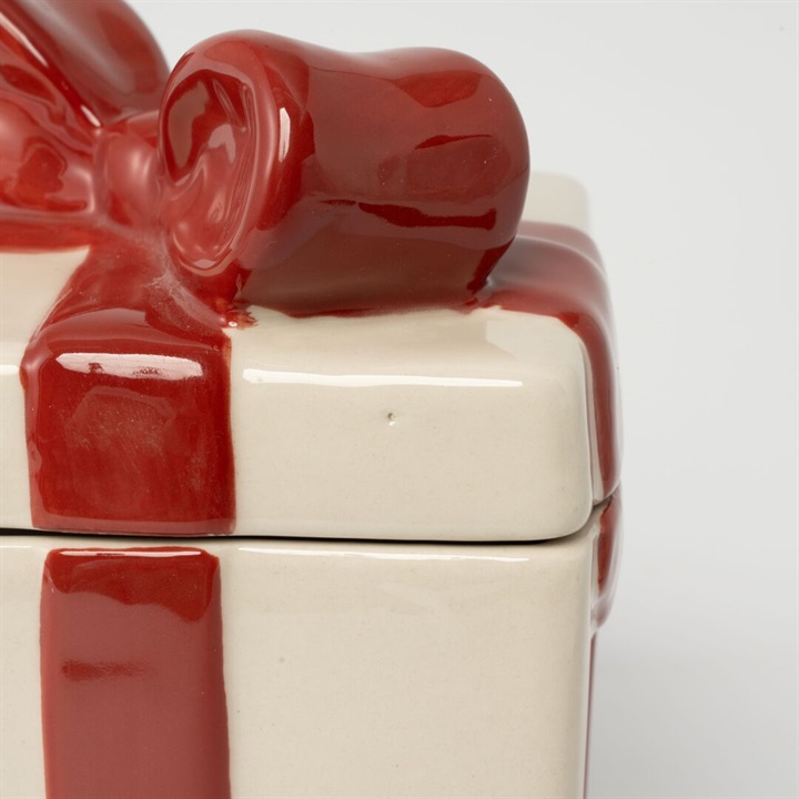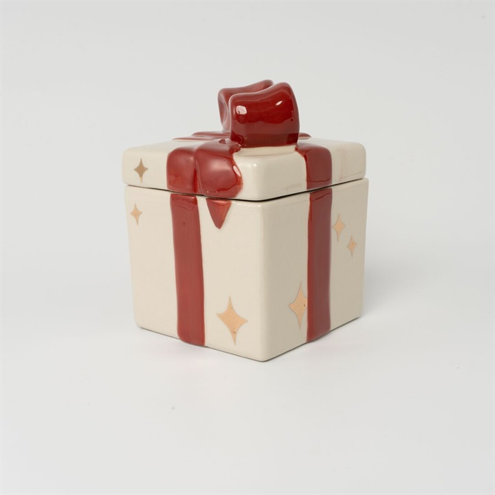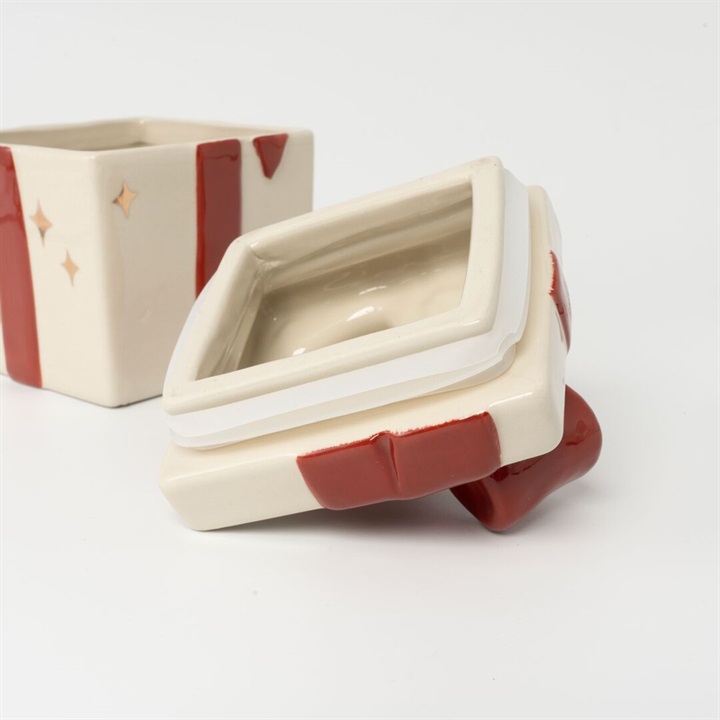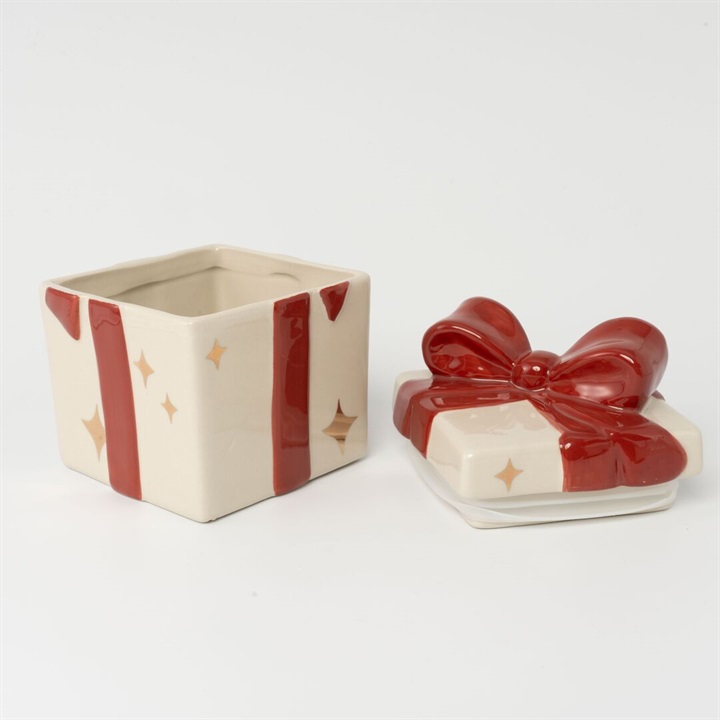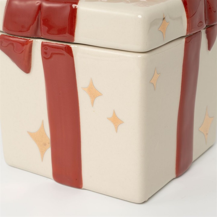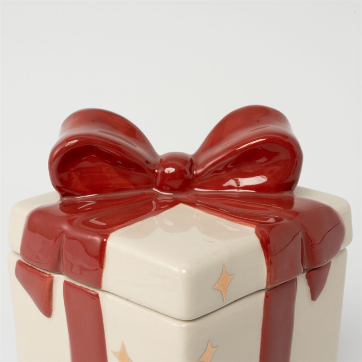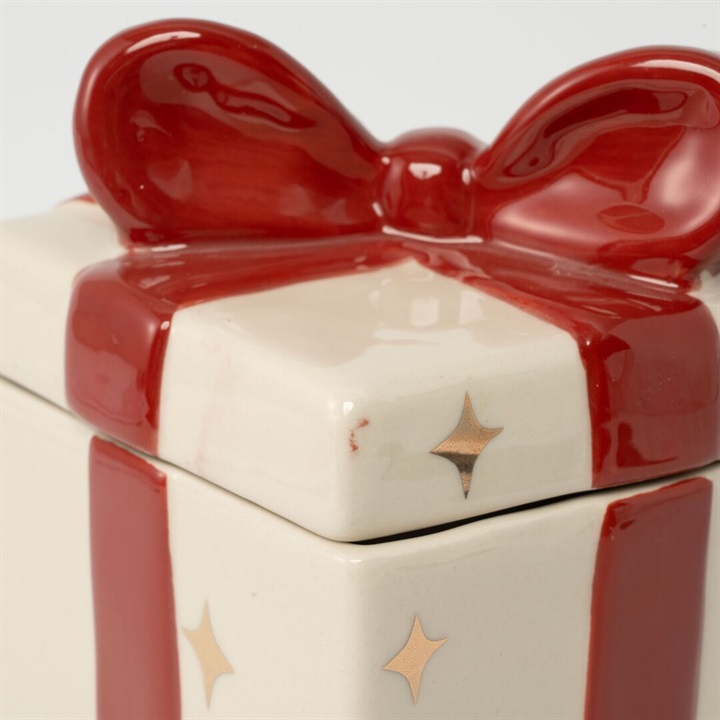 金色の星と、上部のリボンを形成する光沢のある赤いリボンで飾られたデザインは、小物の収納や休日の装飾アクセントとして最適です。