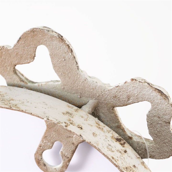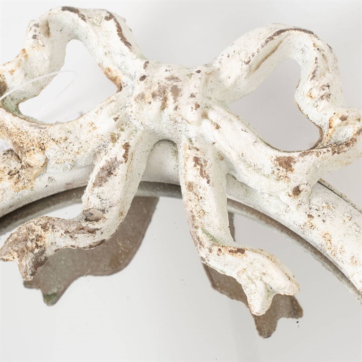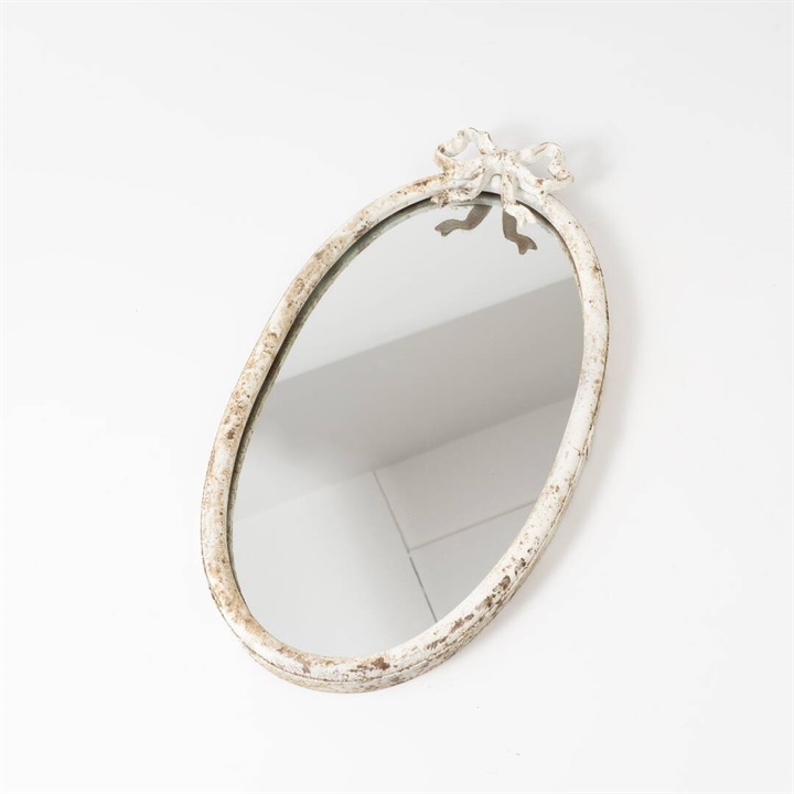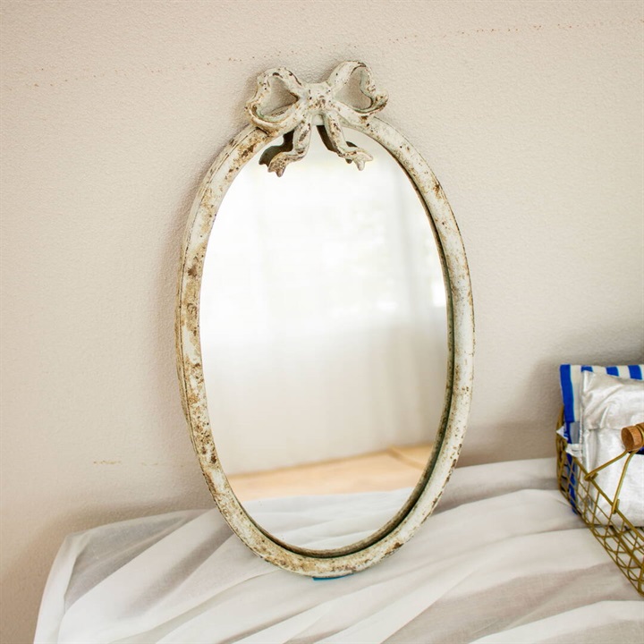 アンティーク調のミラーです。まるで森でゆっくりと時間を重ねてきたような雰囲気。暮らしに自然と馴染ながら、空間に小さな物語を添えてくれます。さりげなく置くだけで、ナチュラルであたたかな雰囲気に。トップとリボンがデザインのポイント。
