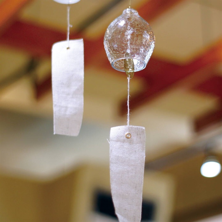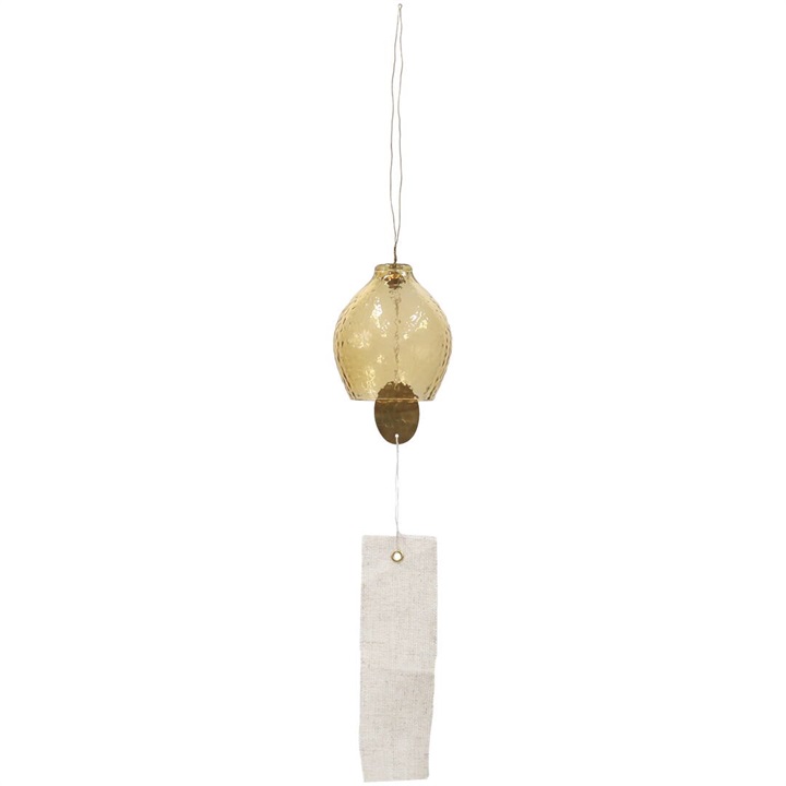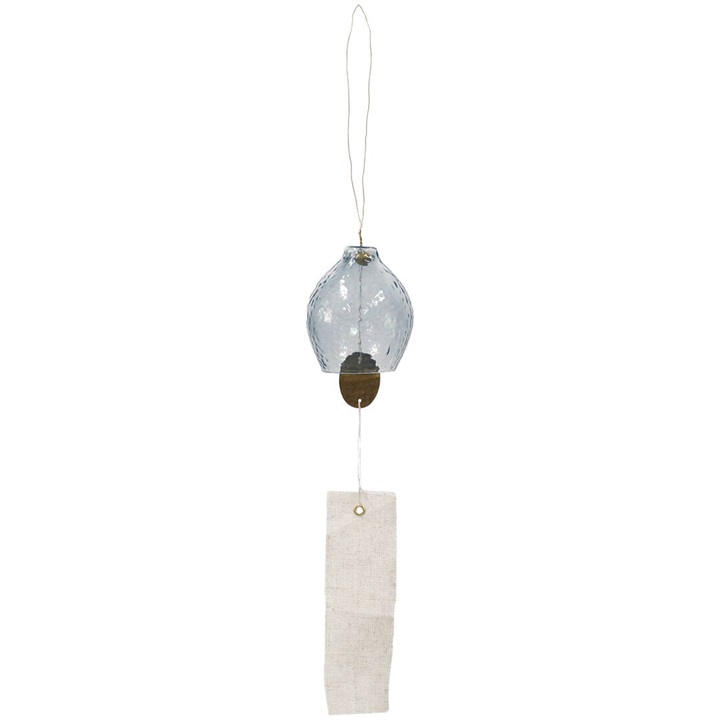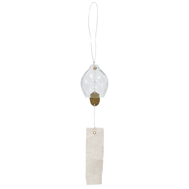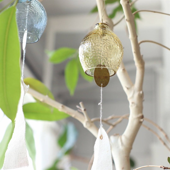 インドのリサイクルガラスを使用したハンドメイドの趣のある風鈴。レモンのような形が魅力的なデザインで、毎年大人気の清涼感たっぷりのクリアの他、新色のイエローとブルーグレーの3色からお選び頂けます。内側のパーツには槌目(つちめ)加工を施した真鍮を使用しており、コットンリネン製の短冊は、あえて端の縫製処理をしないことで素材の持つ清涼感が際立ちます。ガラス部分に真鍮のパーツが当たることで澄んだ綺麗な音色が空間に響きます。主張しすぎないシンプルなデザイン&カラーなので、色々なテイストのお部屋に合わせやすい風鈴です。