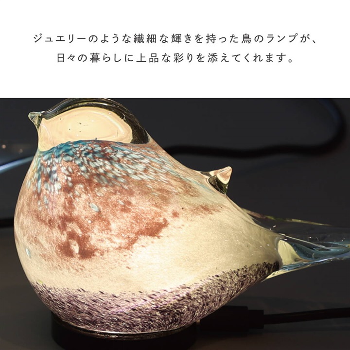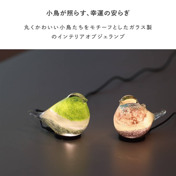大人気の「HEALING BIRD」に、ちょこんとしたサイズ感が可愛いLITTLEが登場しました!丸くかわいい鳥たちをモチーフとしたガラス製のインテリアオブジェランプです。ガラスから心を落ち着かせてくれるような優しい光が漏れ出し、あたりを柔らかく照らします。ガラスは職人が手作りしているため、個体毎に色味や模様などの、ガラスの表情が異なる特徴があります。個体ごとの個性としてお楽しみください。