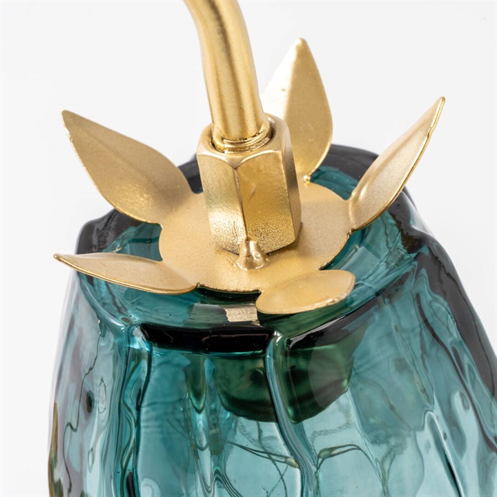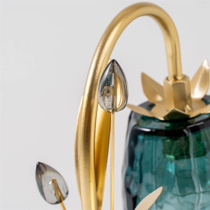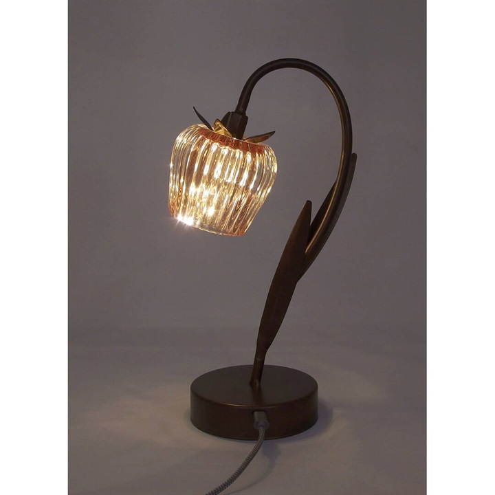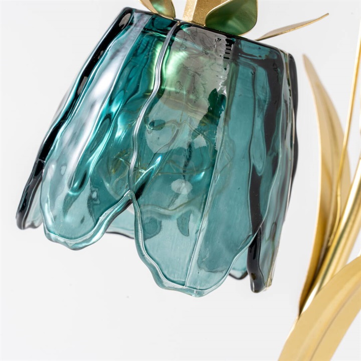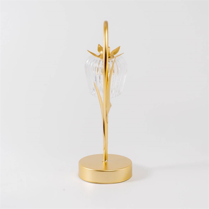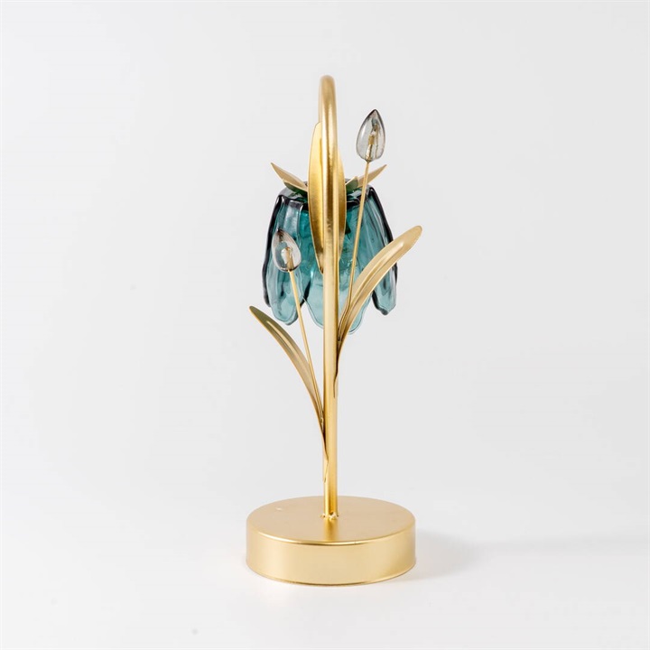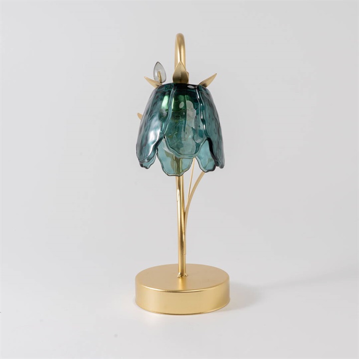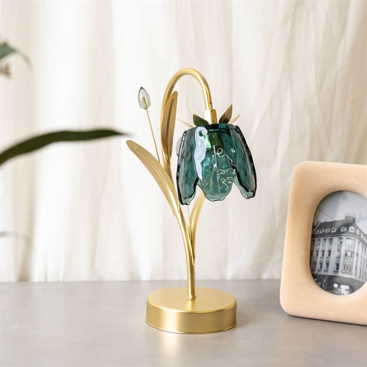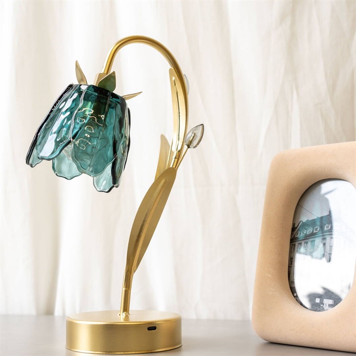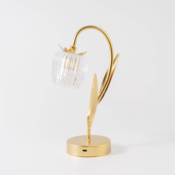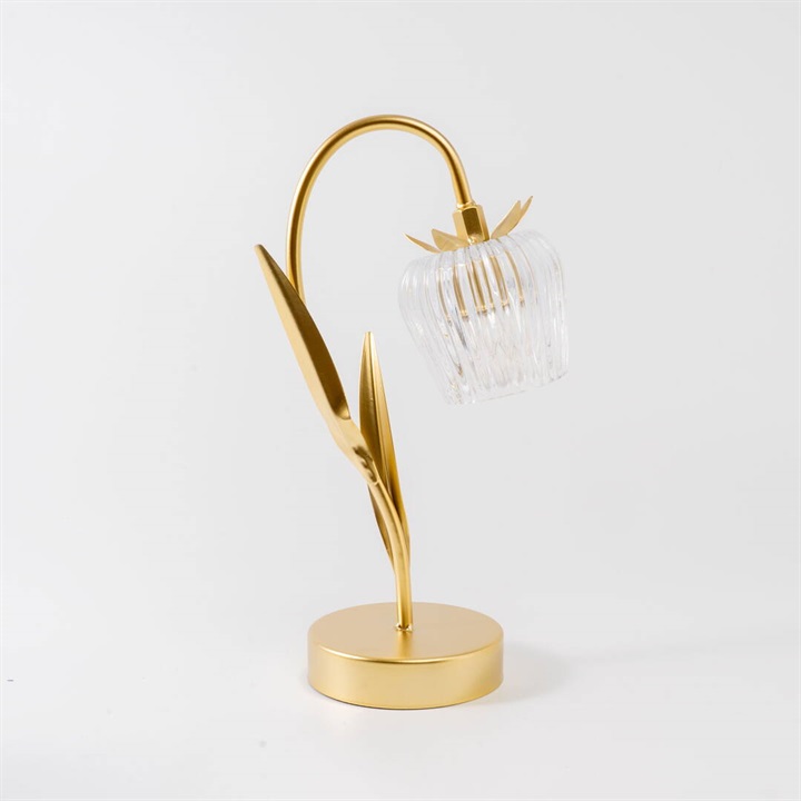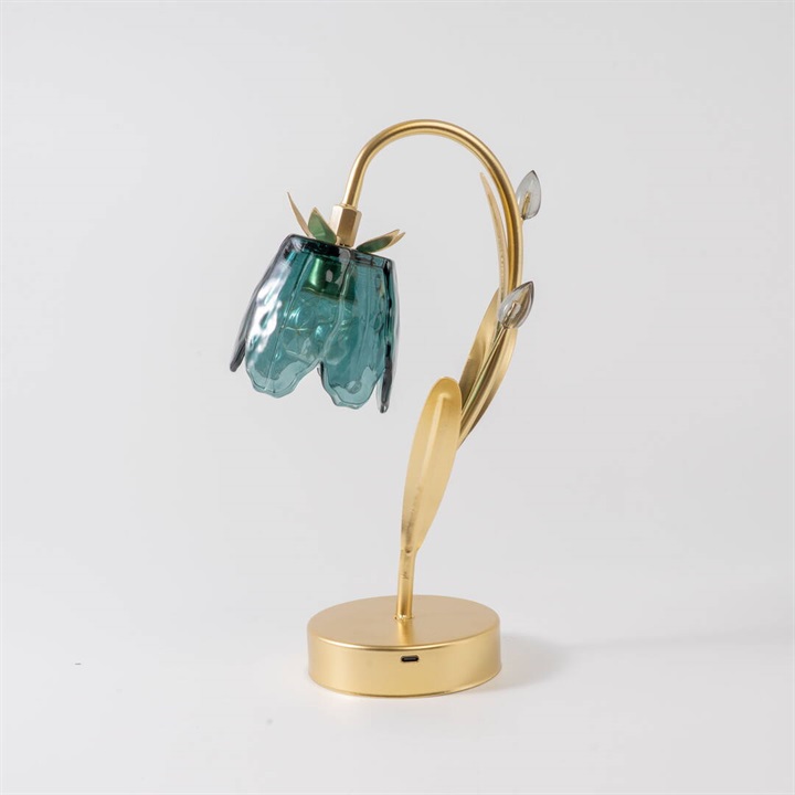 ガラスの花びらが繊細にきらめくテーブルライト。柔らかな光が空間を包み、上品でロマンチックな雰囲気を演出します。カラーごとにお花と葉のデザインが違うので、選ぶのも楽しいです。ゴールドカラーとブラウンカラーがお部屋に重厚感を与えるヴィンテージ品のような佇まい。電池とUSB(共に付属なし)の両方に対応した仕様なので、お好きな場所でお使いいただけます。