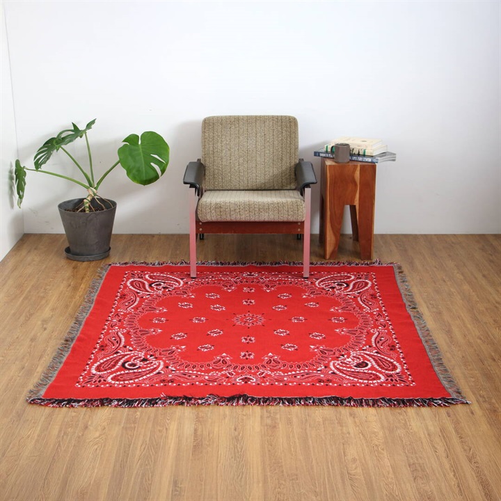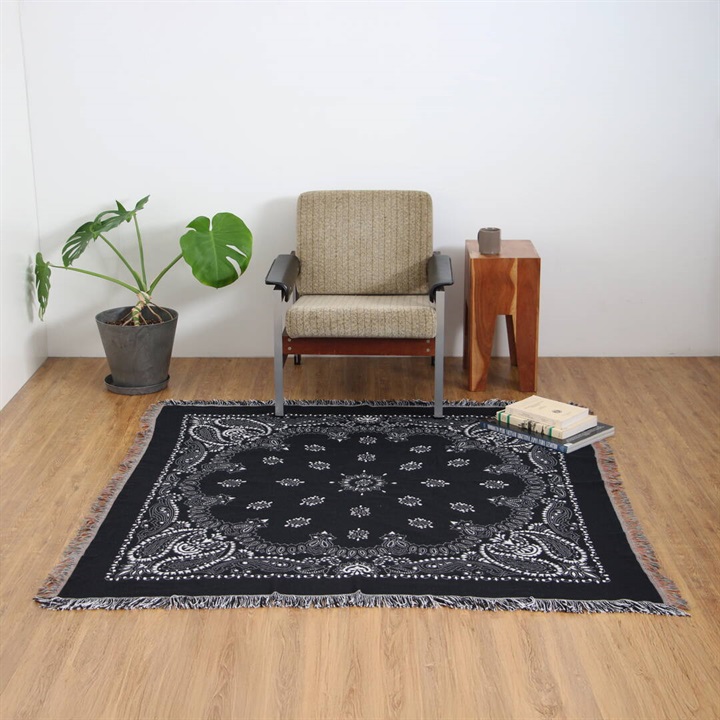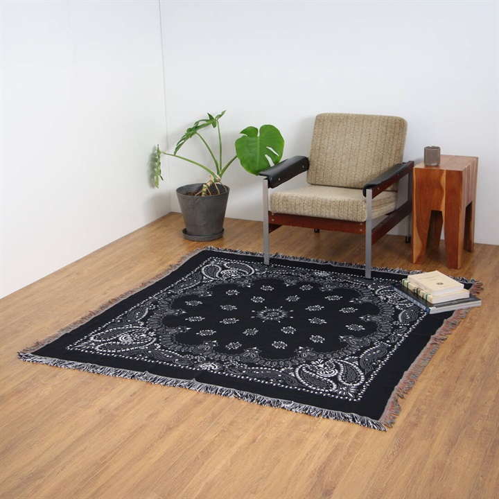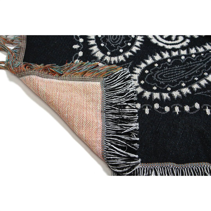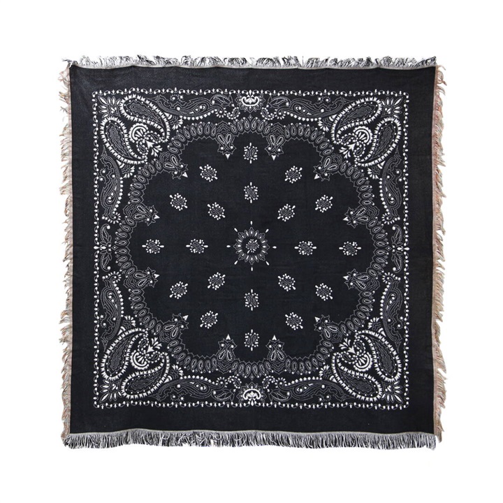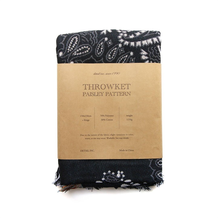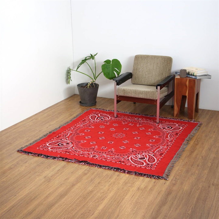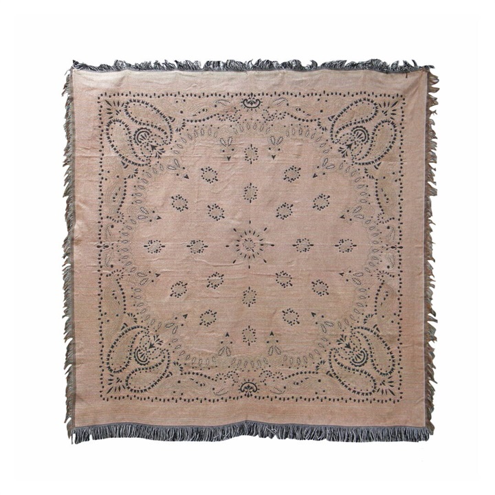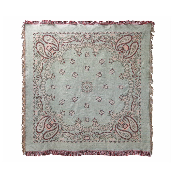 70~80年代によく見られた「ペイズリー」パターンデザインを施したスローケット。さらりとした触り心地で、通年お使いいただけます。150×150と通常のスローケットより大伴サイズなのでさまざまなシーンで活躍します。床に敷いてラグマットにしたり、ブランケットのように羽織ったり、ソファやベットに掛けて使用するのはもちろん、テーブルクロスとしてや壁面に吊ってタペストリーのようにアートとしても楽しめます。前面と裏面で色味が異なるので、気分で使い分けるのも楽しい!