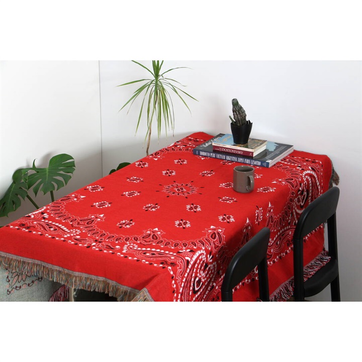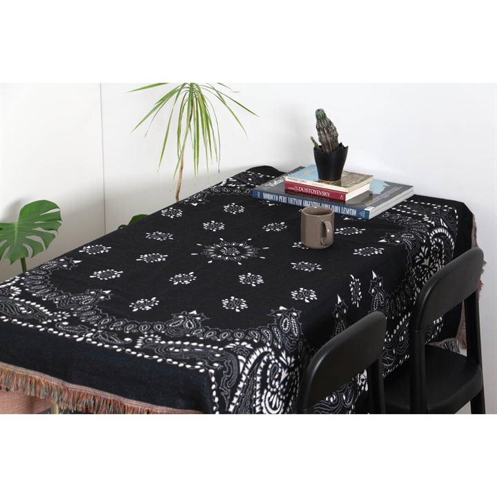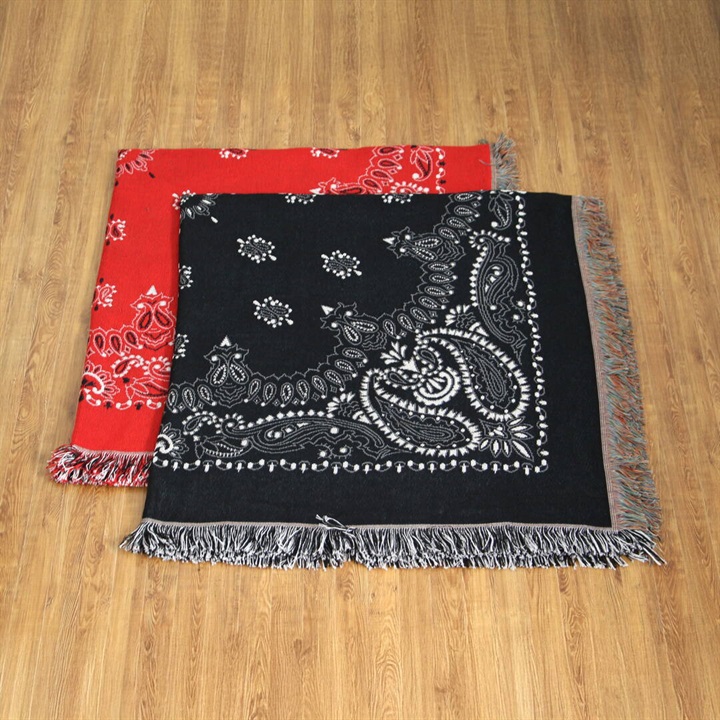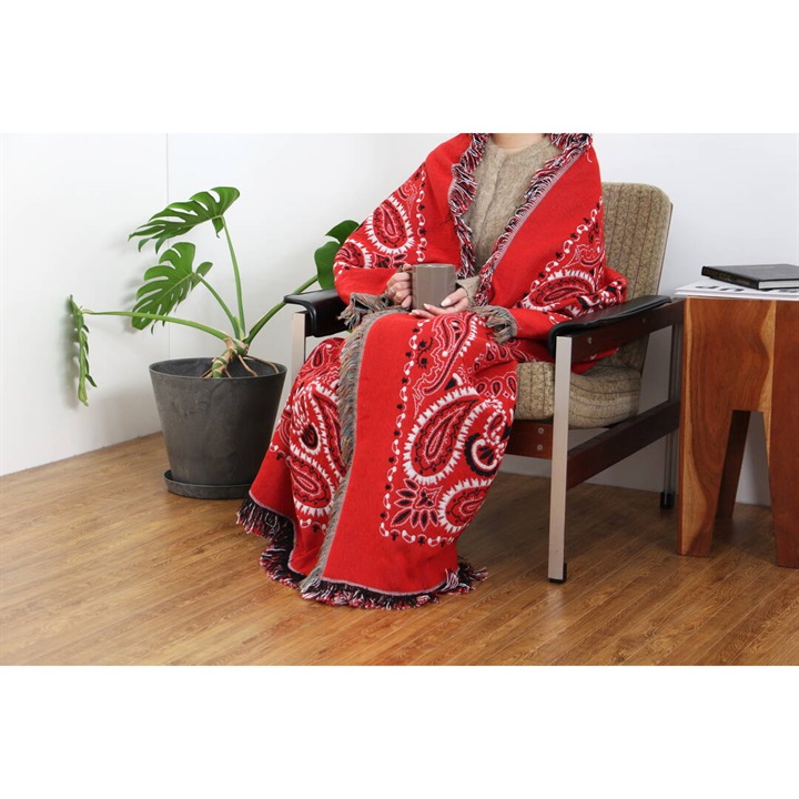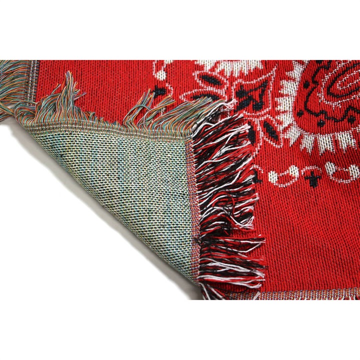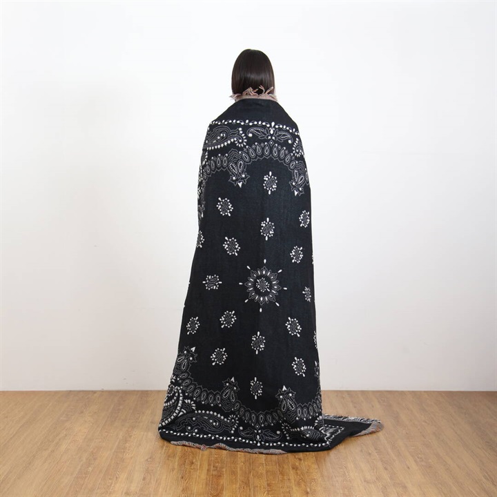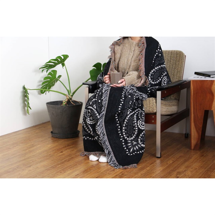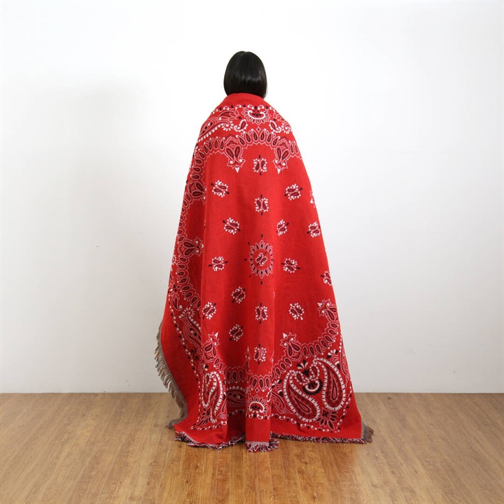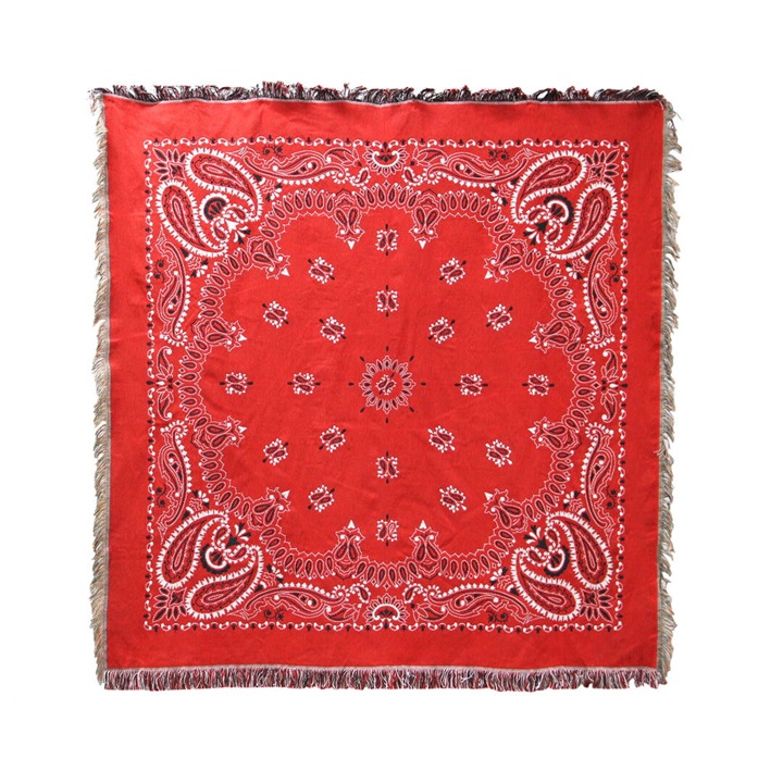 70~80年代によく見られた「ペイズリー」パターンデザインを施したスローケット。さらりとした触り心地で、通年お使いいただけます。150×150と通常のスローケットより大伴サイズなのでさまざまなシーンで活躍します。床に敷いてラグマットにしたり、ブランケットのように羽織ったり、ソファやベットに掛けて使用するのはもちろん、テーブルクロスとしてや壁面に吊ってタペストリーのようにアートとしても楽しめます。前面と裏面で色味が異なるので、気分で使い分けるのも楽しい!