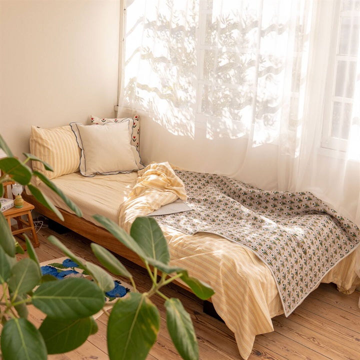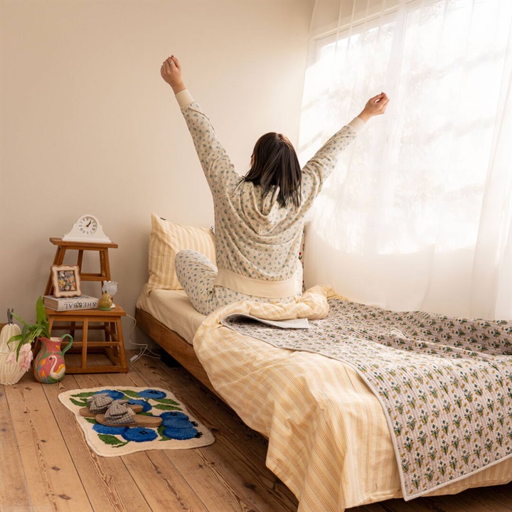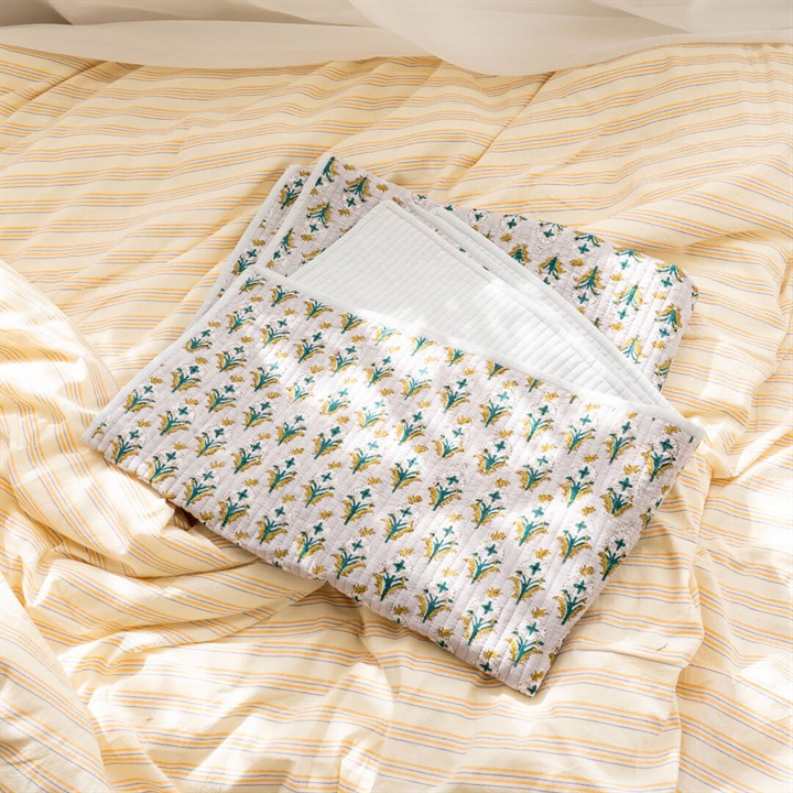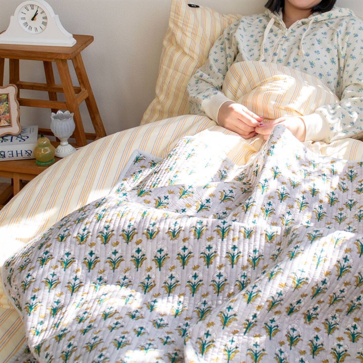 立体感のあるキルトステッチが心地よく、薄手なので夏の肌掛け代わりに使ったり、ソファやベッドのマルチカバーとしてもおススメです。
