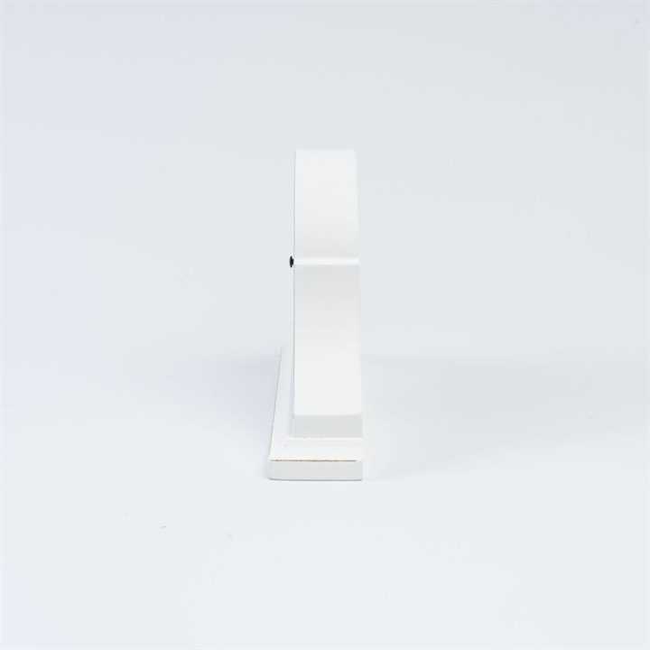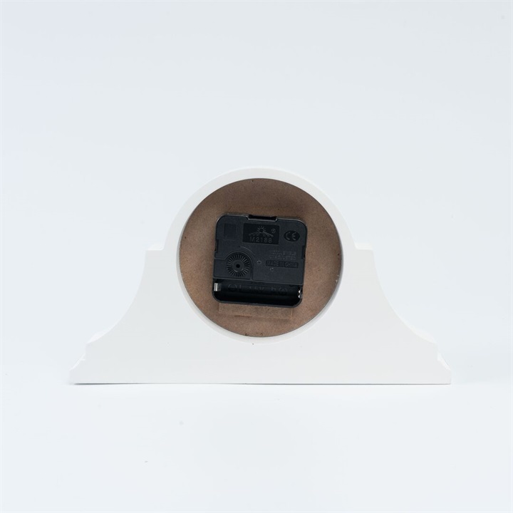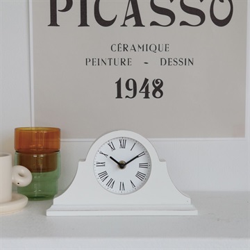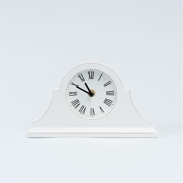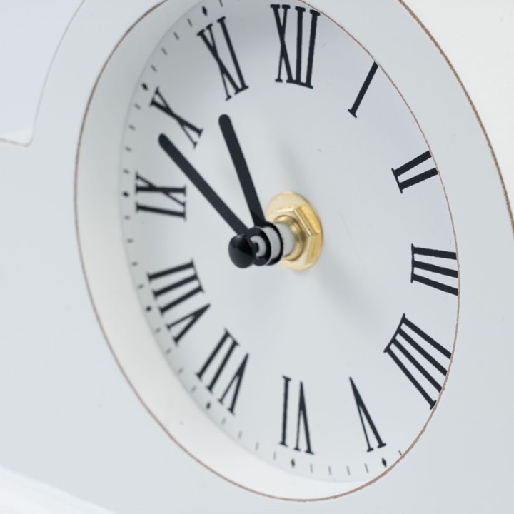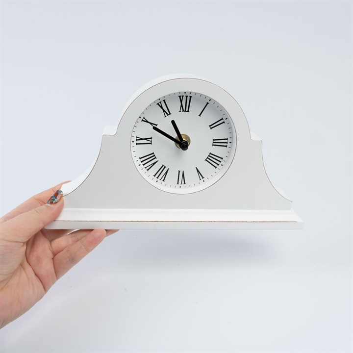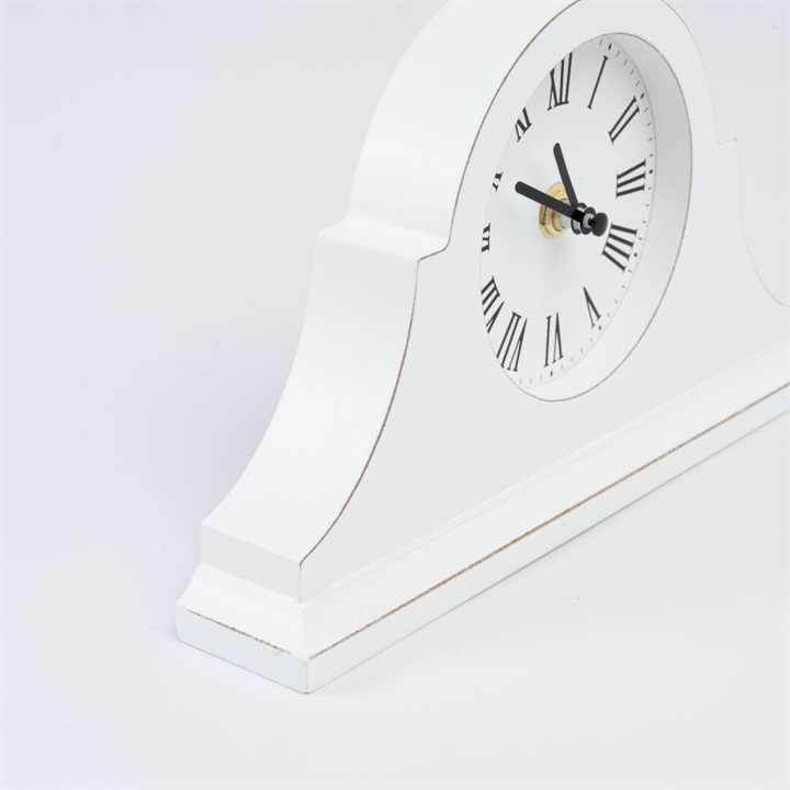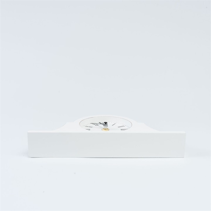 モダンなフォルムの置時計。ホワイトで塗られたお洒落なフォルムです。数字はローマ数字が採用されているので、ヴィンテージライクや海外風のお部屋の雰囲気にも馴染みます。枕元はもちろん、キャビネットやテーブルなどにオブジェ感覚で飾っていただける時計です。