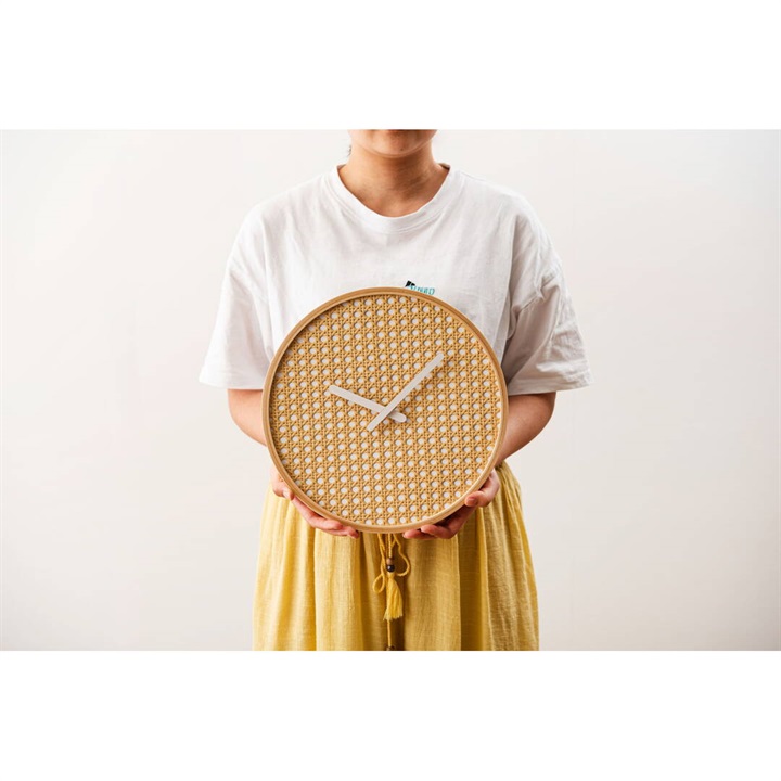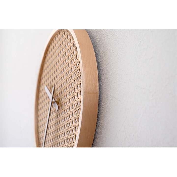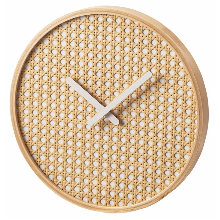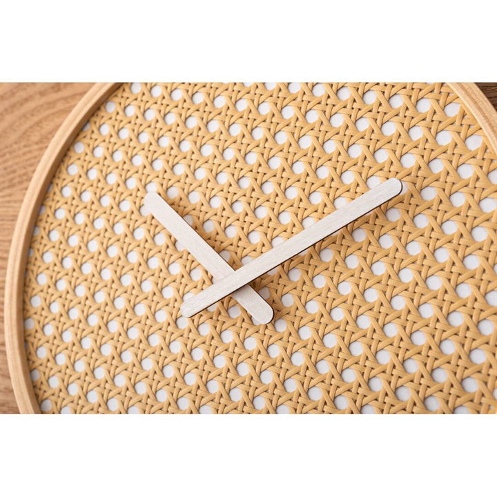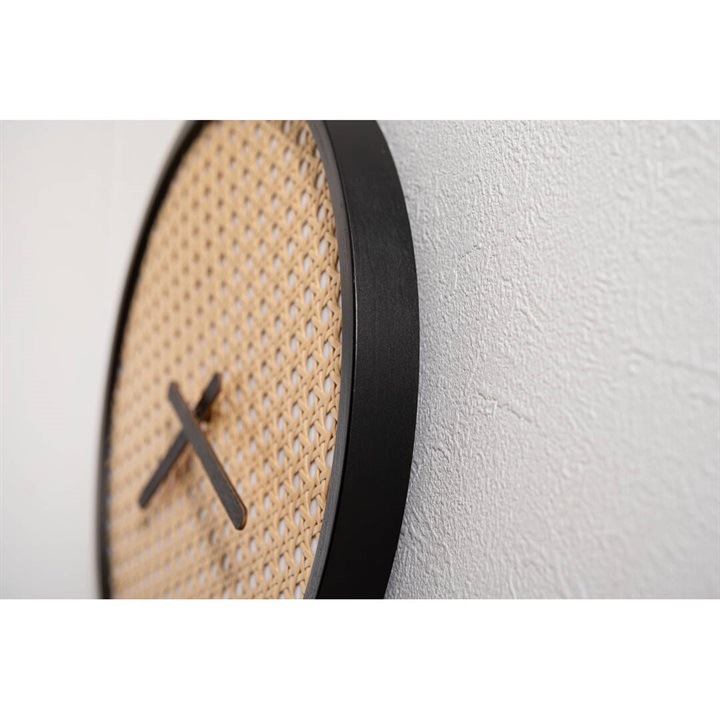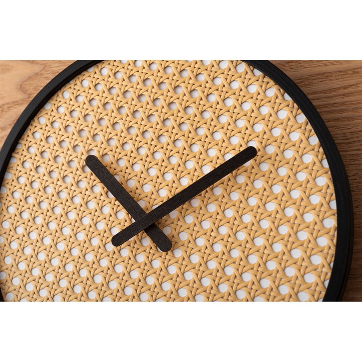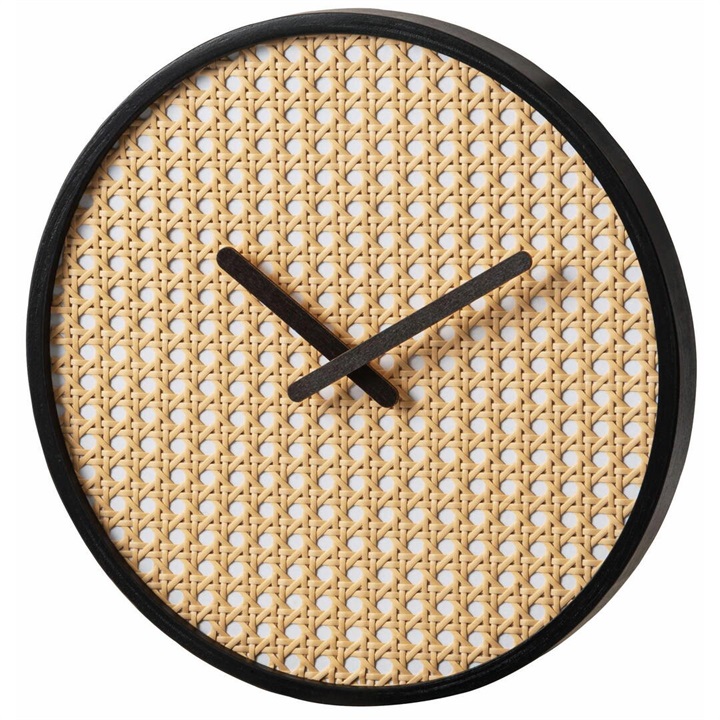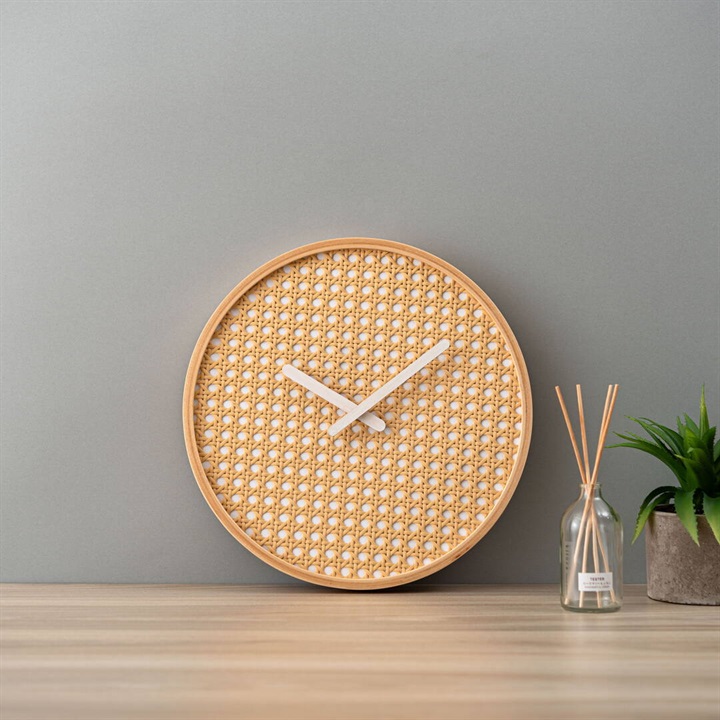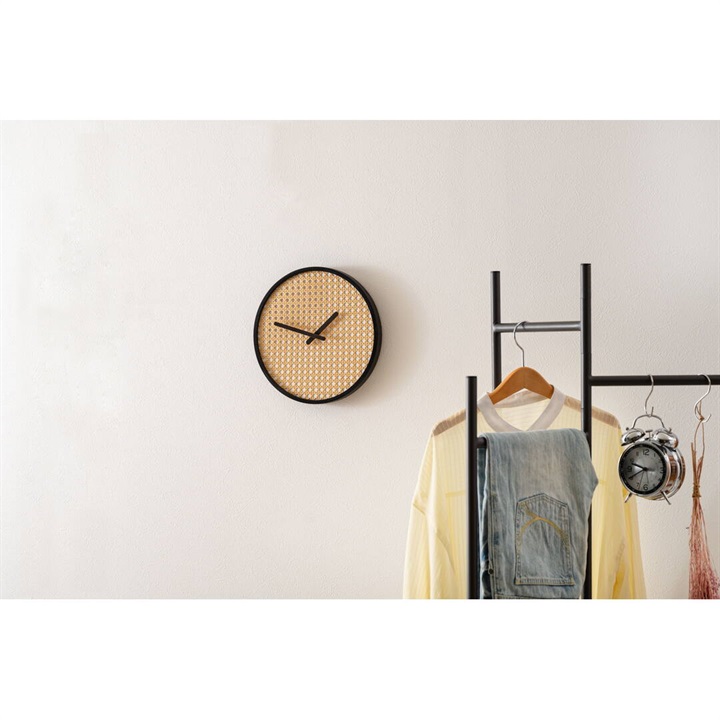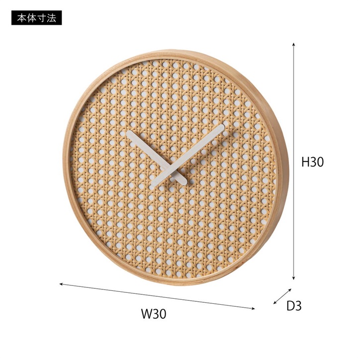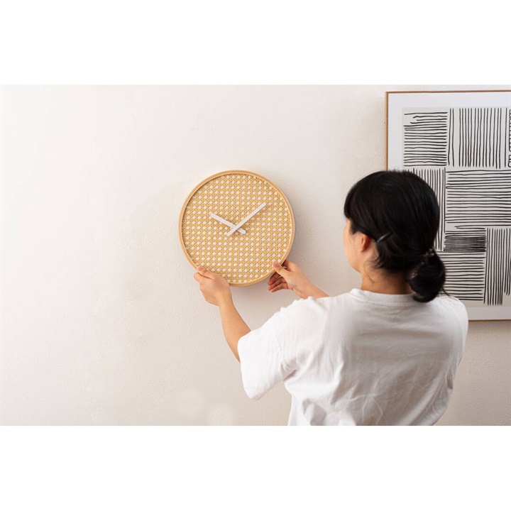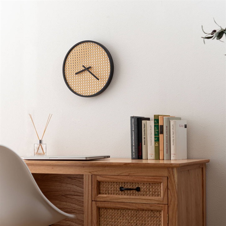 暮らしになじむ、素材の個性と調和。それぞれの素材が持つ美しさを活かしたウォールクロックです。ラタン調のやさしい風合いに、親しみのある天然木フレームと洗練されたメタルを合わせた、異素材ミックスのデザイン。空間になじみながらも、しっかりとした存在感でインテリアを引き立ててくれます。針の音が気にならない静音タイプなので、書斎や寝室にもおすすめです。