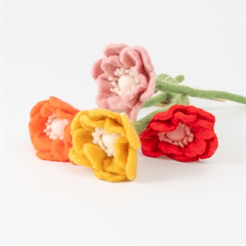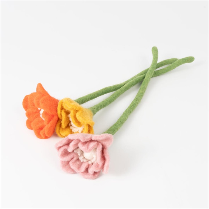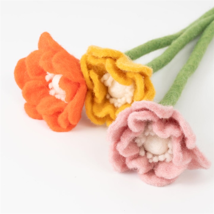 ほっこりとした温かみのあるフェルト素材で作ったお花シリーズ。いくつか組み合わせて花瓶に飾ったり、まとめて花束にしても素敵です。フェルトの柔らかな雰囲気や優しい色味がお部屋を華やかに彩る、ハンドメイドのディスプレイ用フラワー&グリーンです。