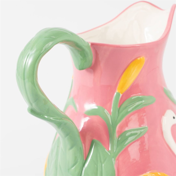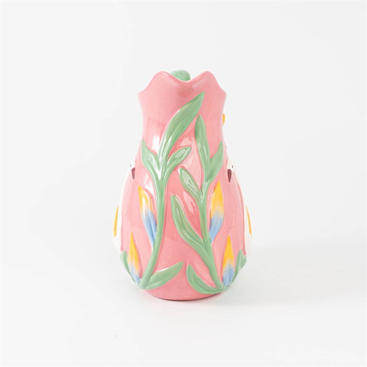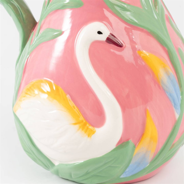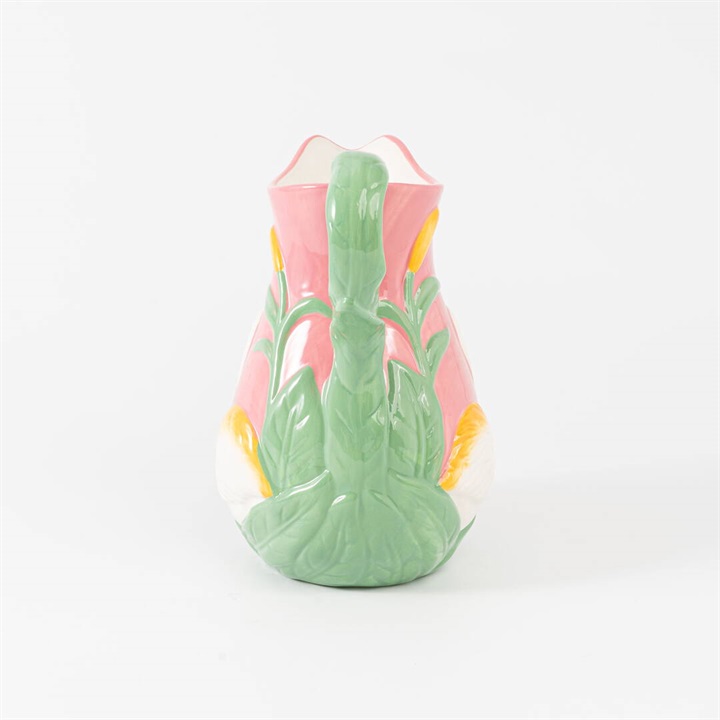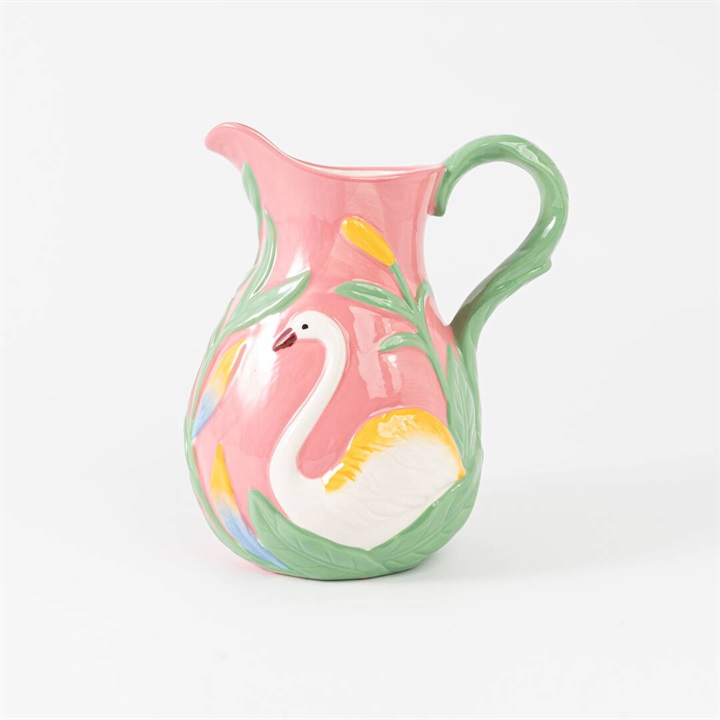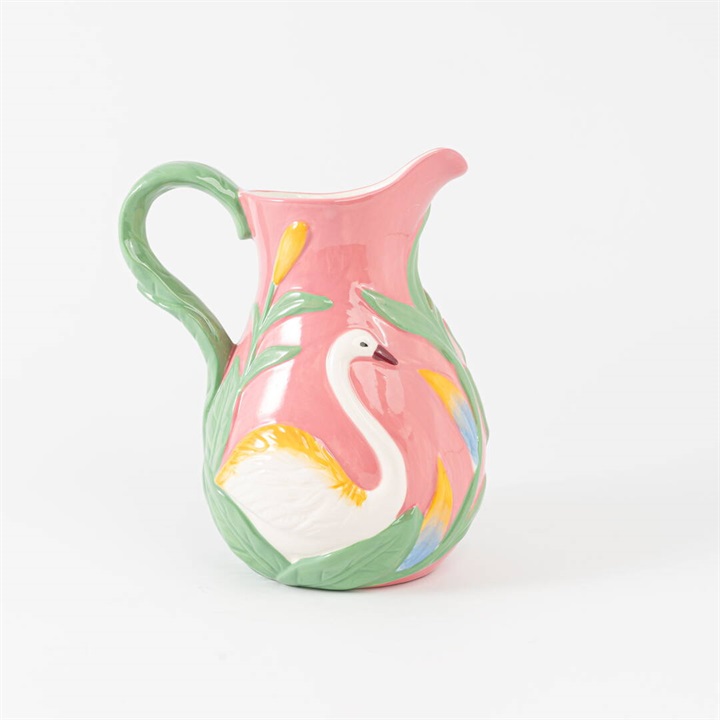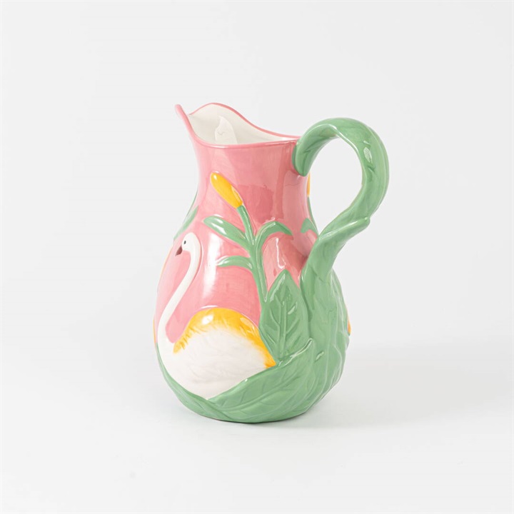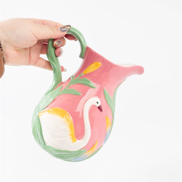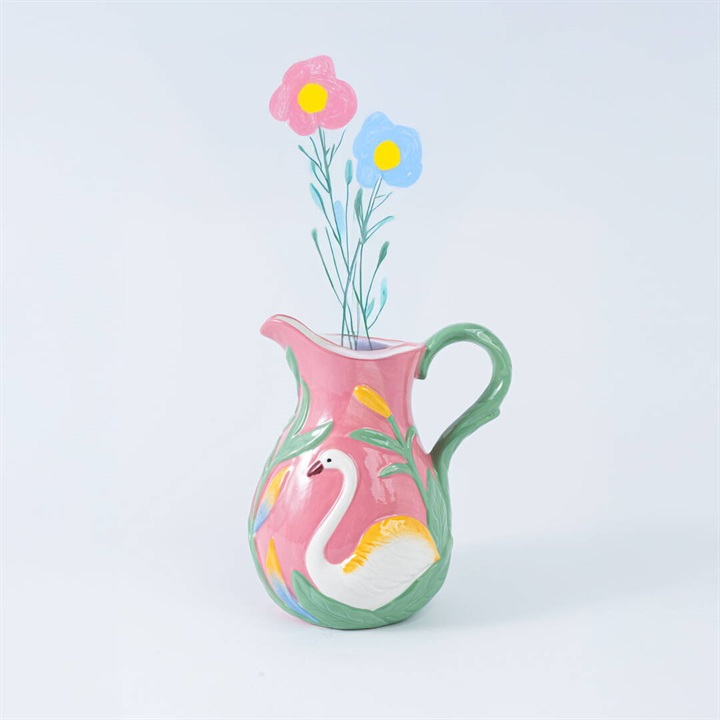 美しいスワンがデザインされたフラワーベースです。ピッチャーの形になっており、お花をバサッと入れるだけでいい具合のバランスに。スワンやお花のモチーフは半立体で、細かなディテールが上品さも兼ね備えています。持ち手の部分は草のツタになっていて、ここもポイントです。