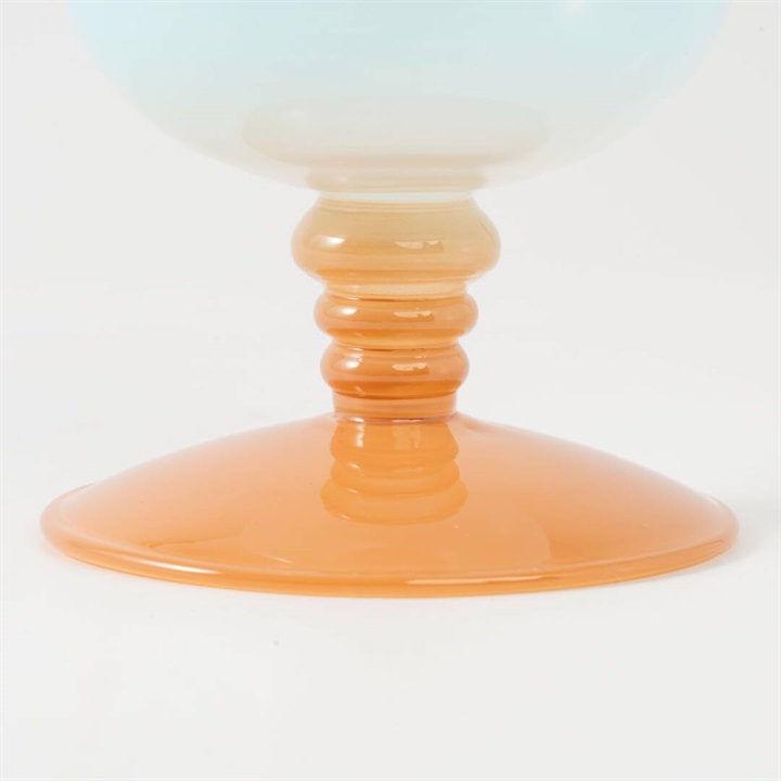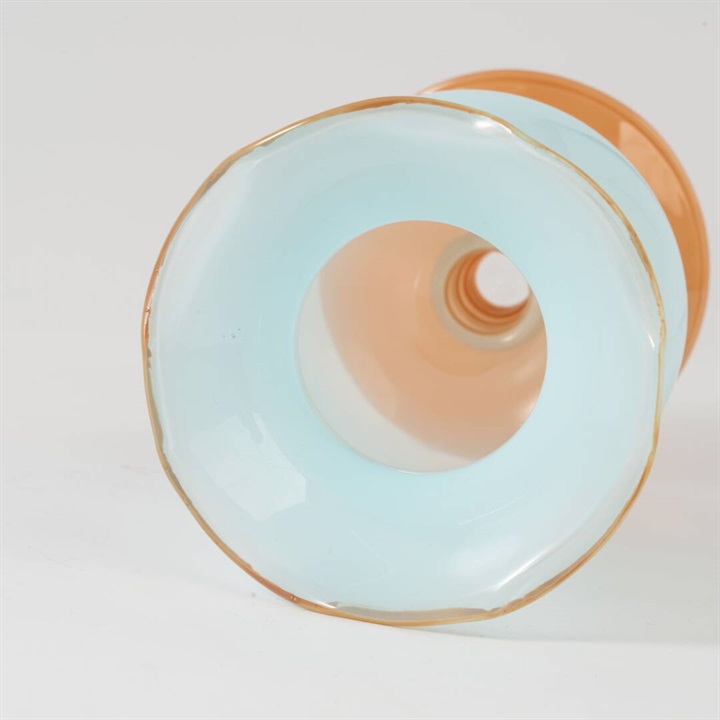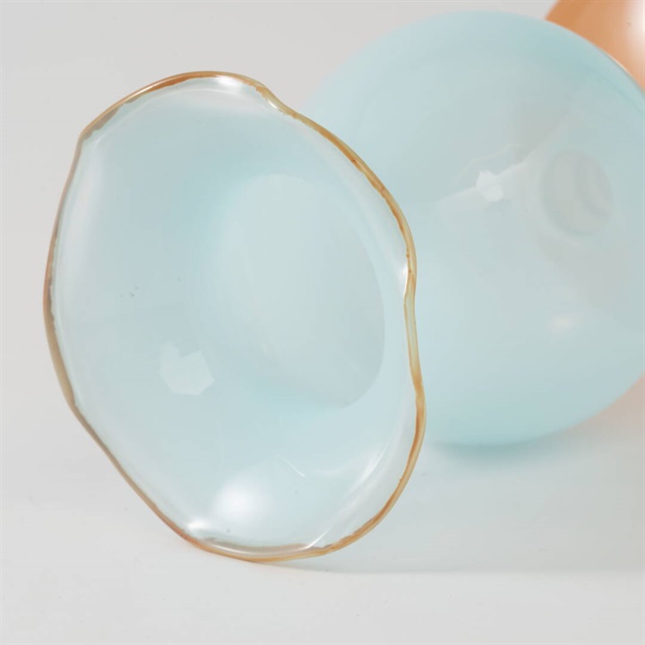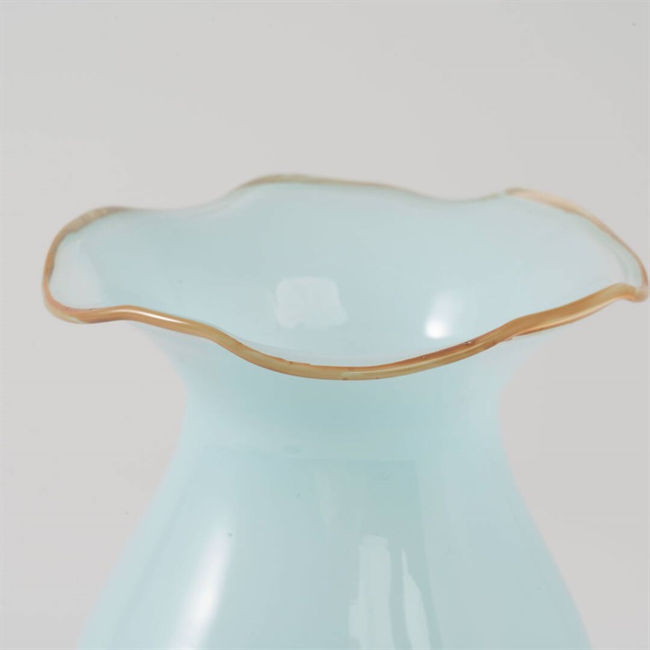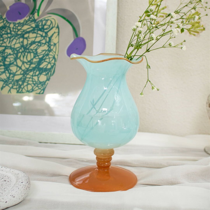 お部屋のほどよいポイントになるフラワーベースです。水色とブラウンの配色が、トレンド感をプラス。フリル状の口元とアンティーク調の脚部デザインがアクセントとなり、飾るだけでお部屋をぐっとおしゃれに演出します。お気に入りのお花をさりげなく引き立てる、ほどよい存在感が魅力です。