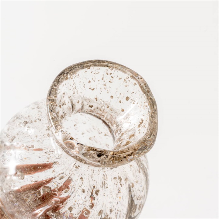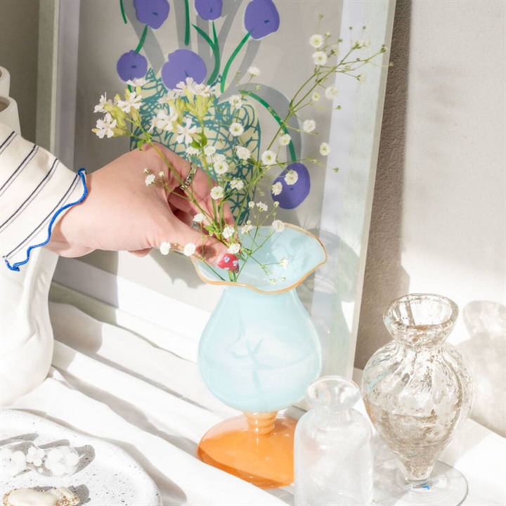 インドの職人がひとつひとつ仕上げたガラスフラワーベース。リサイクルガラスの炭酸のような気泡が清涼感ある瑞々しいアイテムです。光があたると、気泡がキラキラと反射し、眺めるだけで心が落ち着く時間が生まれます。花をさりげなく引き立てながら空間に自然な温度を添えてくれます。