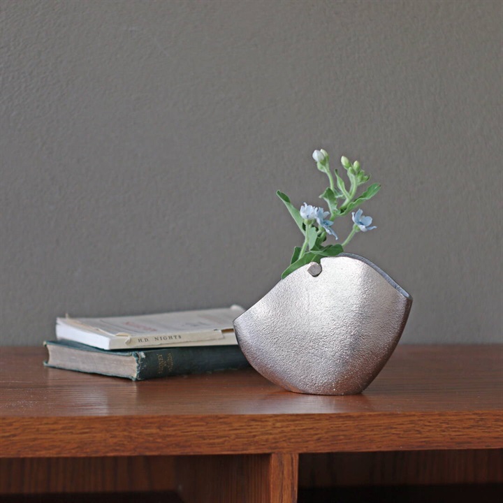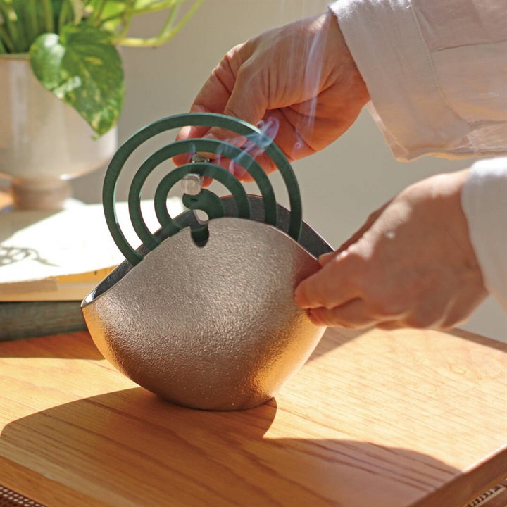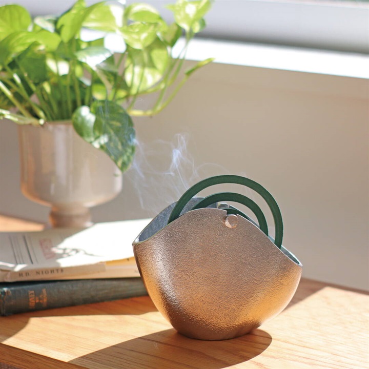 デザイン性のあるオブジェのような蚊遣り。アルミ製のシルバーがスタイリッシュ。柔らかな曲線を描くフォルムがお洒落。蚊遣りだけでなく、ちょっとしたお花を飾るのにも使いやすいサイズ感。使わない時はそのまま部屋に置いてもインテリアに馴染んでくれるのが嬉しいポイントです。