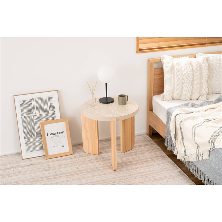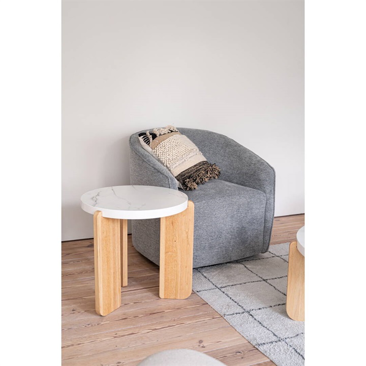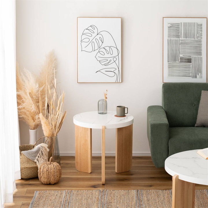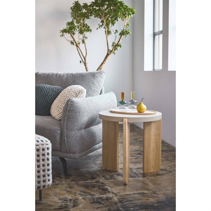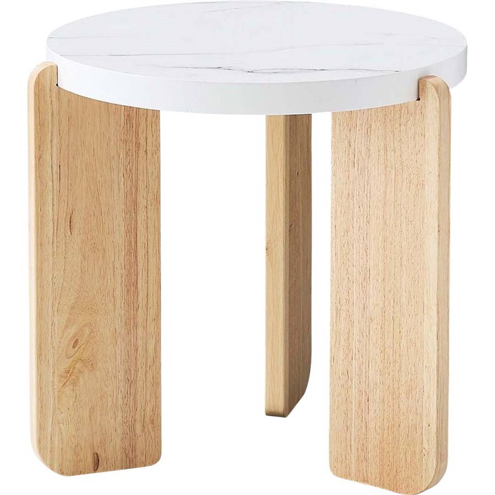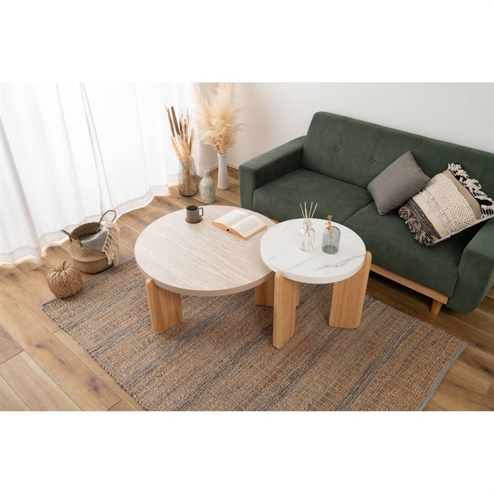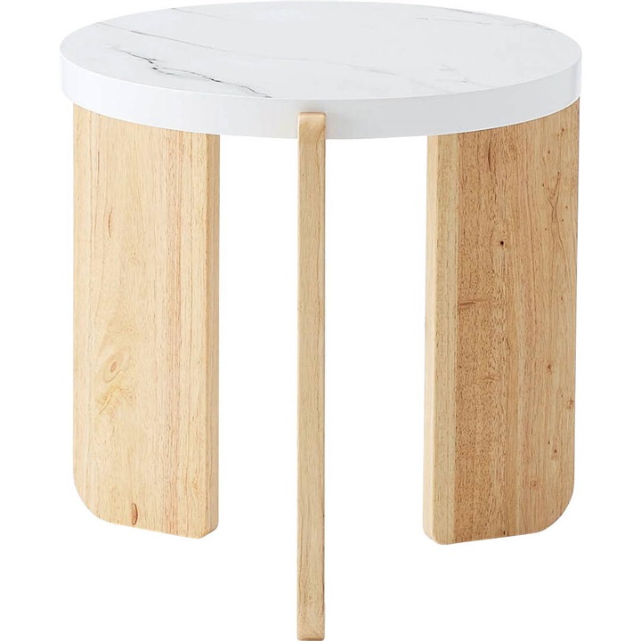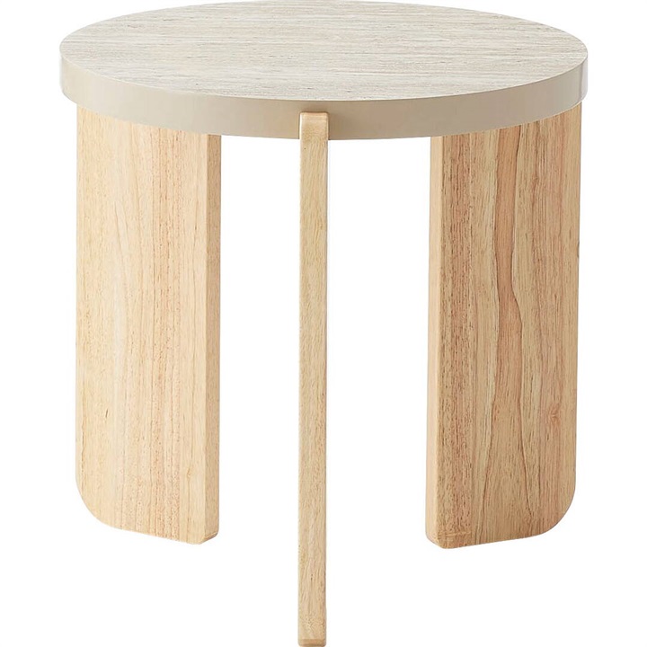 大理石調天板と天然木を組み合わせたラウンドテーブル。優しい色味と角の丸いフォルムが特徴的な、シンプルで落ち着いた雰囲気。大理石調の天板と天然木の脚部は異素材がMIXされたデザインですが、凹凸を抑えた大理石調の天板はシックで目を引く上品な佇まいです。Lサイズと組み合わせてネストテーブルとしてもお使いいただけます。