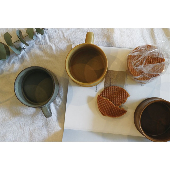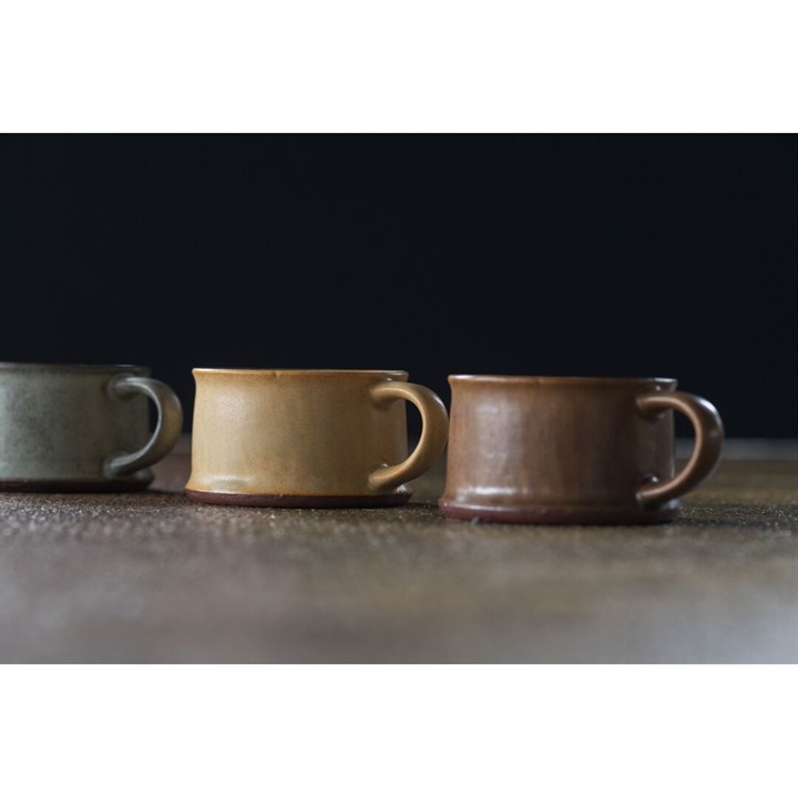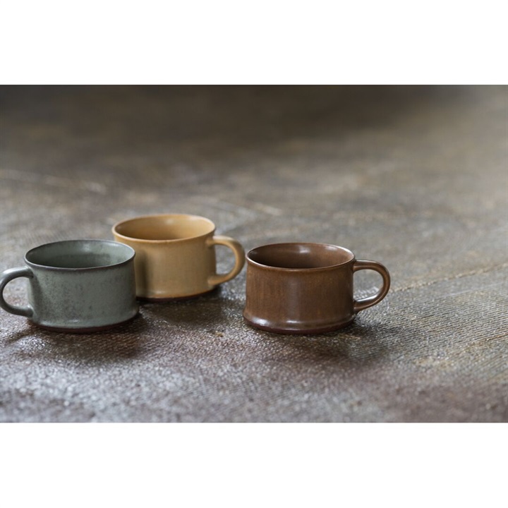 シンプルながら平らなフォルムが印象的なマグカップ。落ち着いた色合いで普段使いにぴったりです。