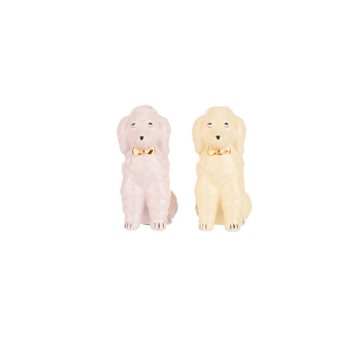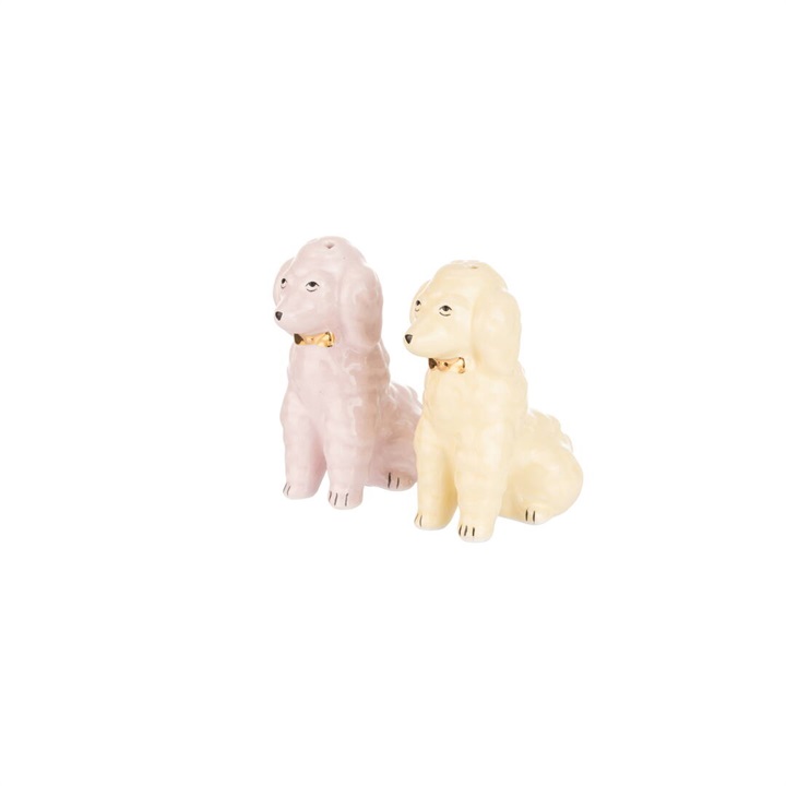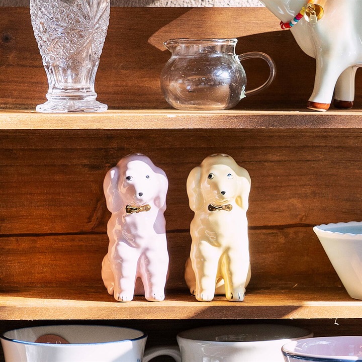 プードル型のソルト&ペッパーシェイカー。ゴールドの首輪が華やかな印象。キッチン周りを明るくしてくれます。ギフトボックス入りなので、新居祝いなどにもぴったり!