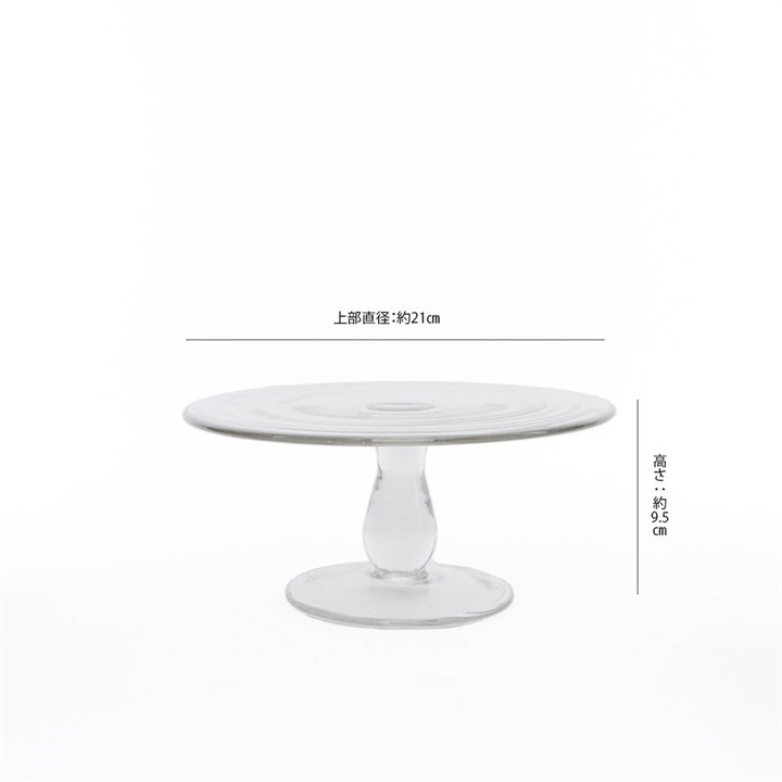 涼しげな佇まいのガラスケーキスタンド。シンプルなデザインでスイーツ以外のどんなものにも馴染み、引き立ててくれる存在感。再生ガラスを利用して作られた、環境にもやさしいアイテムです。脚部分は、すこしぽってりとしたフォルムに仕上げ、どこか温かみのある雰囲気。使わないときも、その佇まいがインテリアのアクセントになります。アクセサリートレイやディスプレイスタンドとしてのご使用もおすすめ。ケーキは6号サイズのホールケーキが丁度良い大きさです。 ▼プレゼント用のラッピングバッグはこちら