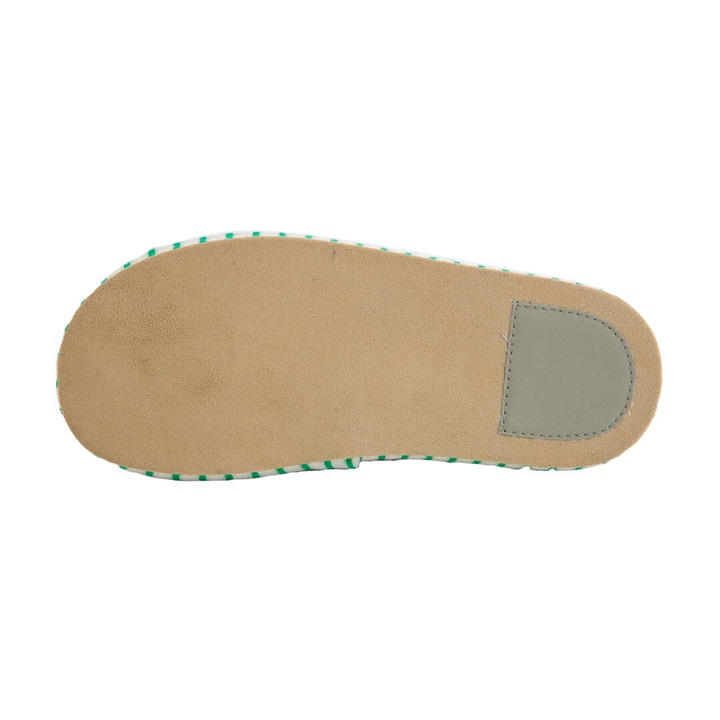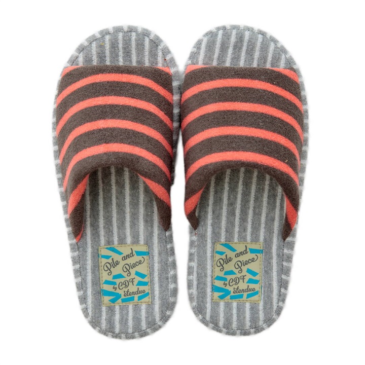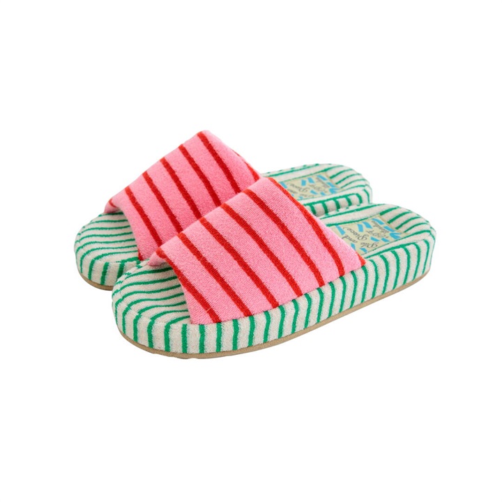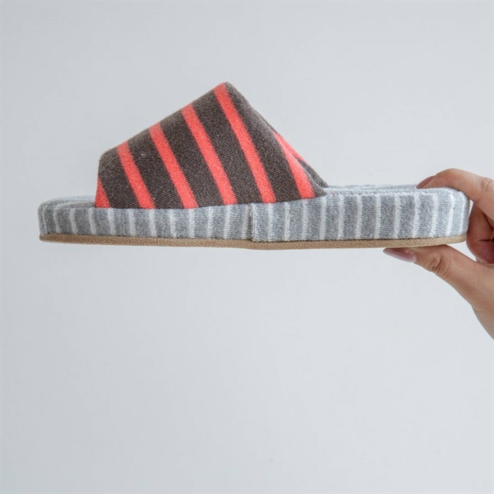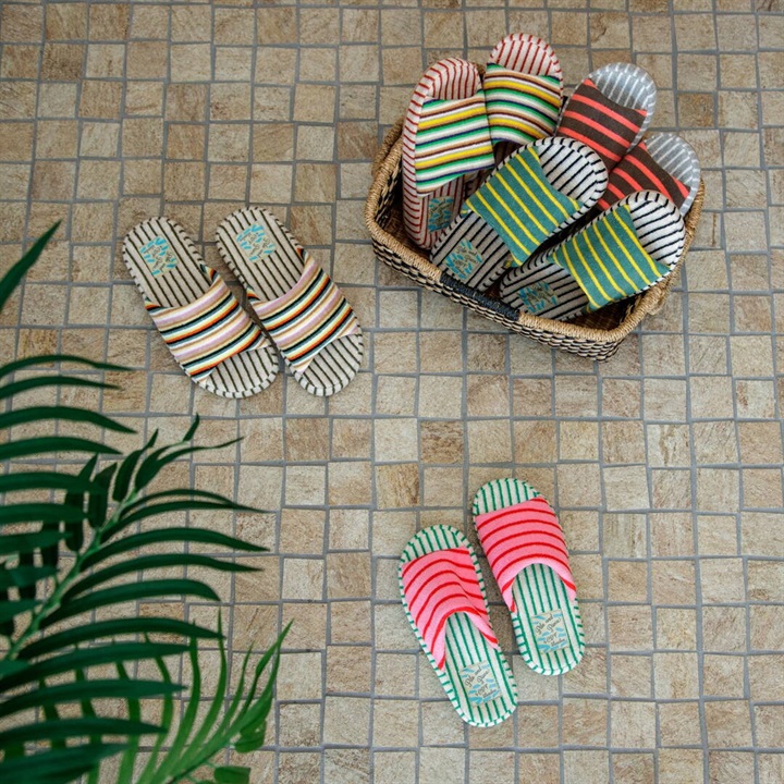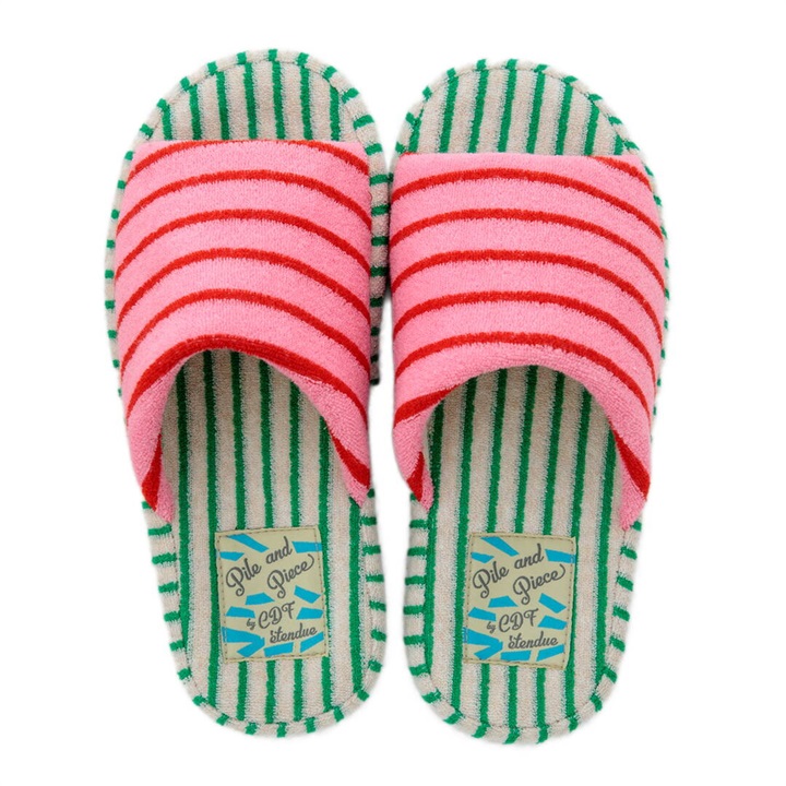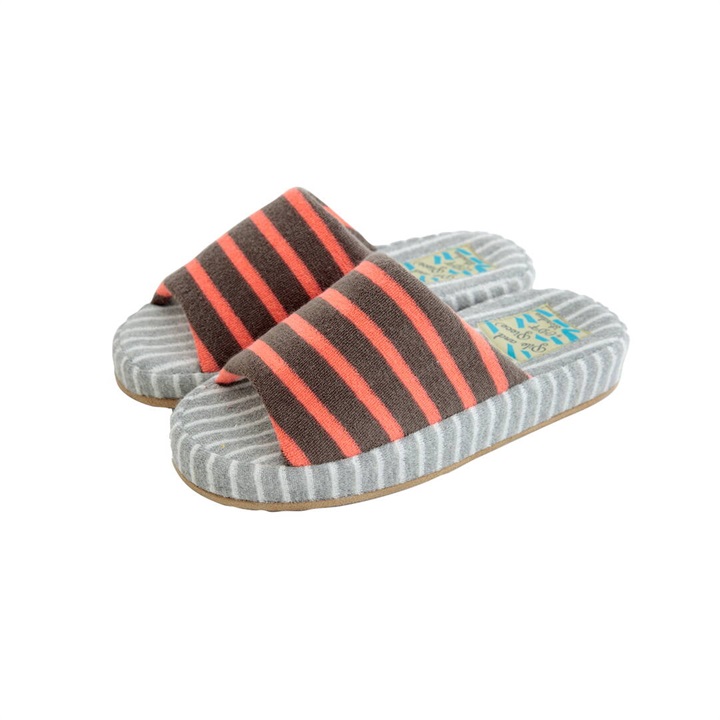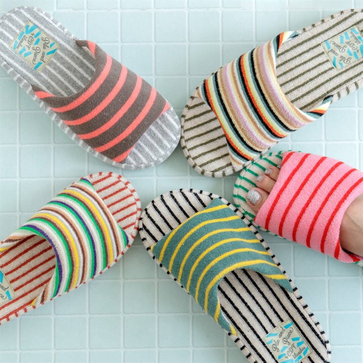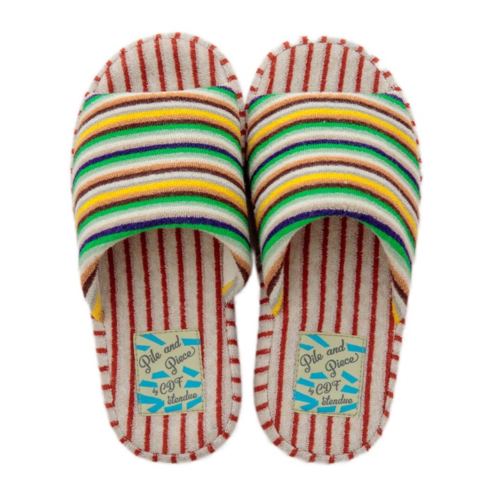 絶妙なカラーバランスのしましま生地のアッパーとインソールを組み合わせた、カジュアルでポップなデザインのスリッパ。パイル生地ならではの心地よい脚触りと、発色の良さが足元を明るく彩り特別な一足に。是非素足で履いていただきたいスリッパです。足裏に沿った凹凸形状の厚底ソールは、中材が低反発素材になっており長時間履きに適しています。2サイズ展開ですので、カップルや家族で色違いにできます。