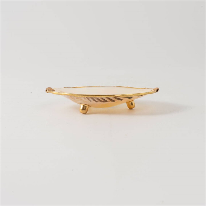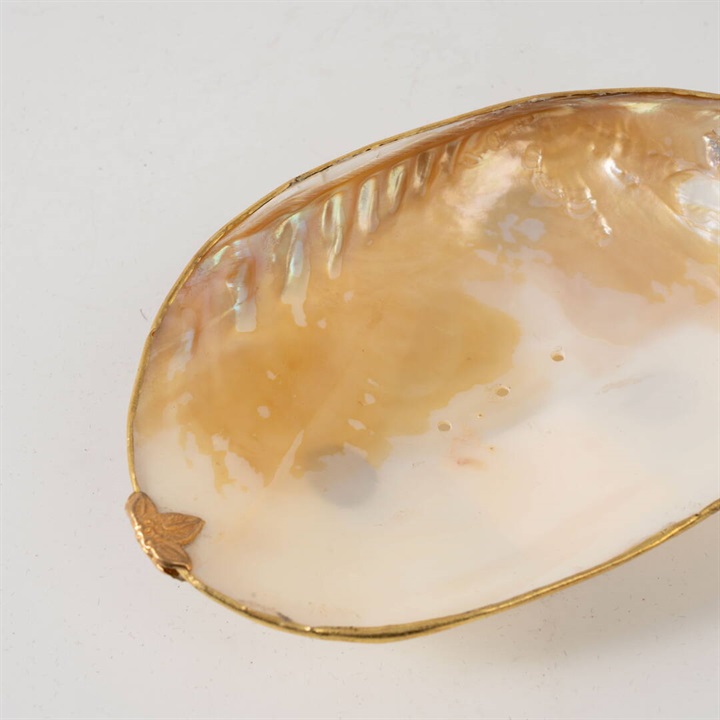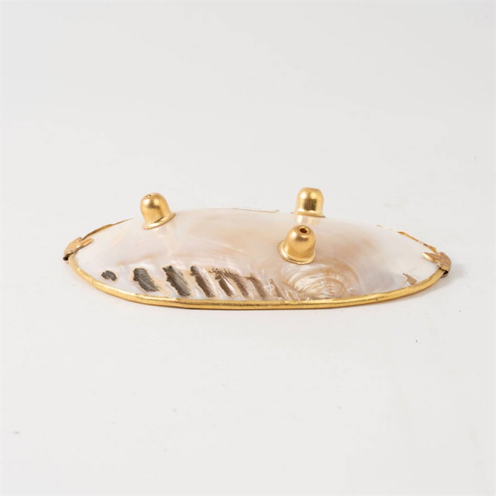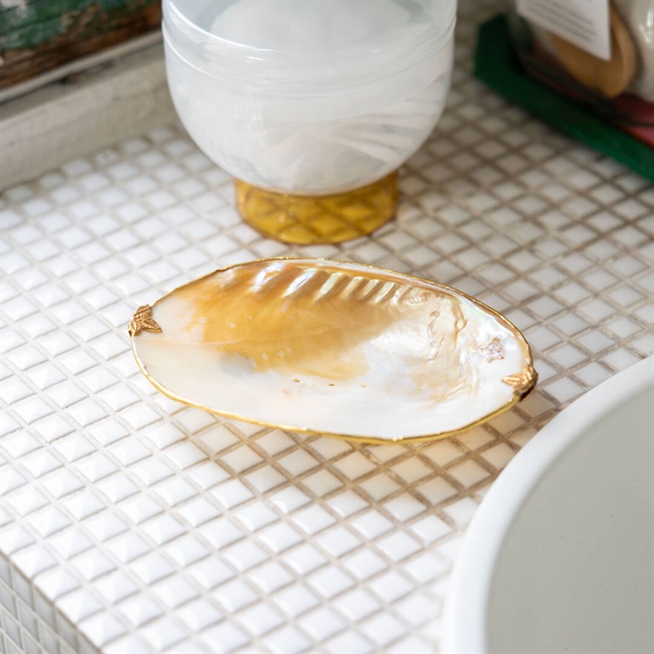 廃棄される貝を磨き上げて生まれた、繊細なシェルソープデッシュ。滑らかな光を映す艶やかな光沢と、金の縁取りが品の良いアイテム。自然素材の柔らかな形と、無理のない循環の中で生まれた静かな美しさが暮らしに潤いを与えてくれます。裏面には鋲が付いており、ゴールド塗装でどこまでも上品なディテールです。
