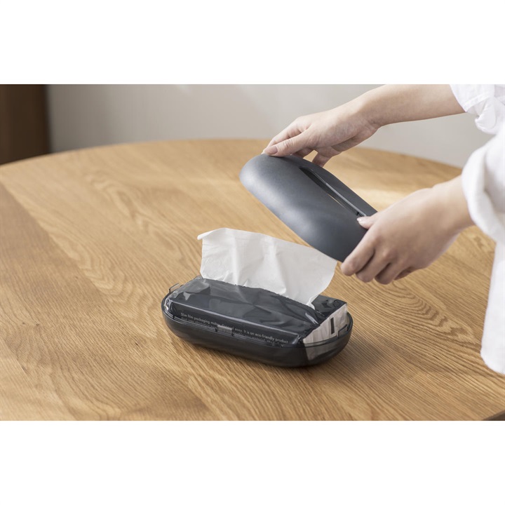 - ①上の蓋を外して、袋入りティッシュを入れます。