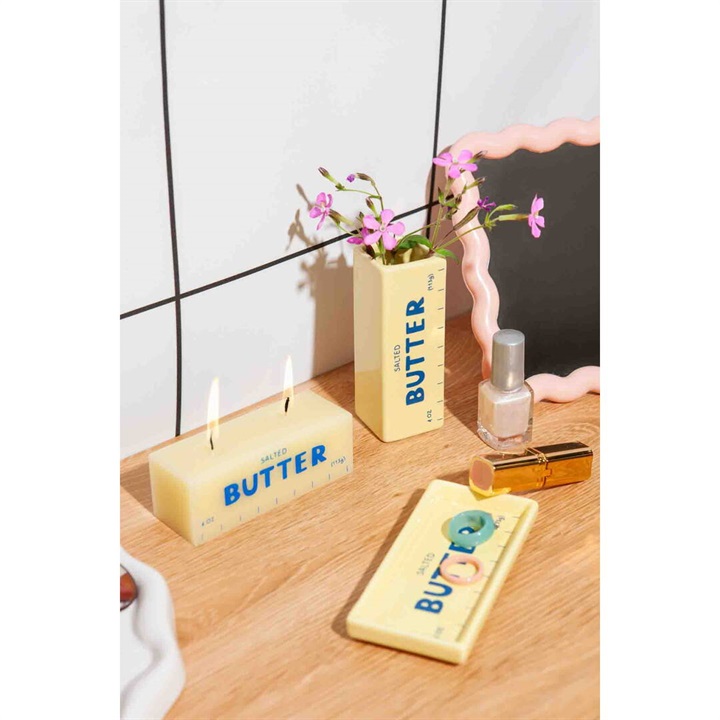 有塩バターにインスピレーションを受け、デザインされた小物トレイ。指輪や鍵など、ちょっとした小物を飾るのにぴったりなアイテムです。柔らかなバターイエローに、ビビットなブルーが映えます。 ▼プレゼント用のラッピングバッグはこちら