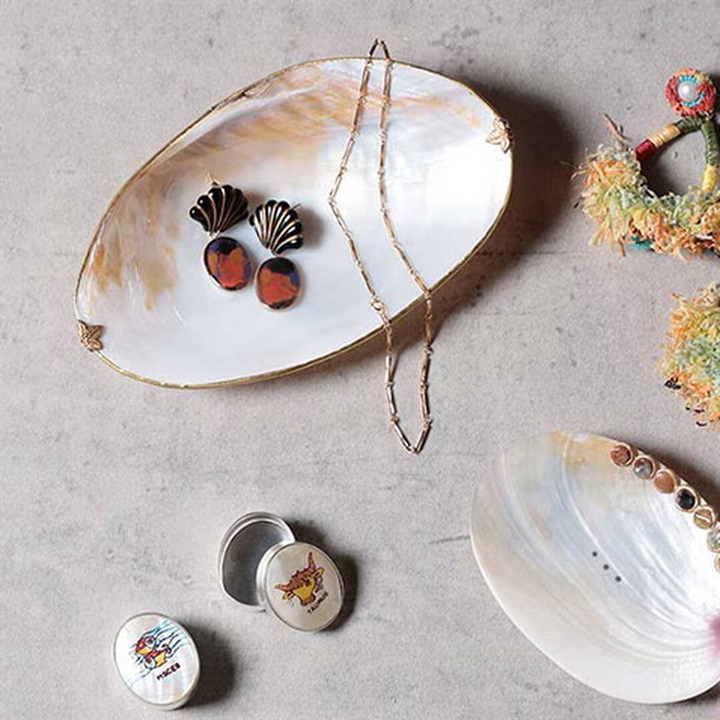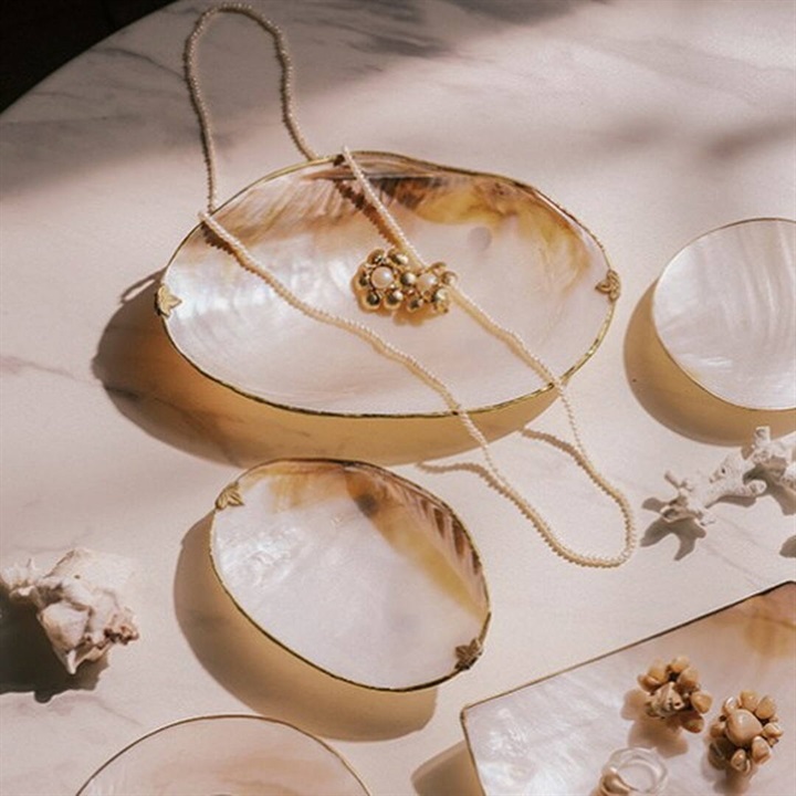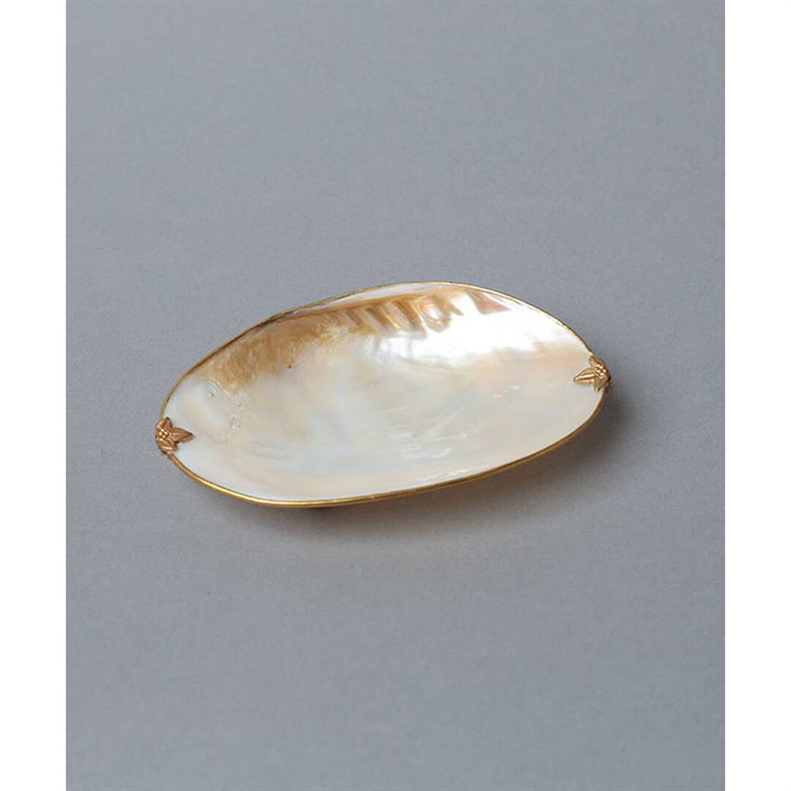 廃棄される貝を磨き上げて生まれた、繊細なシェルのトレー。滑らかな光を映す艶やかな光沢と、金の縁取りが品の良いアイテムです。自然素材の柔らかな形と、無理のない循環の中で生まれた静かな美しさが暮らしに潤いを与えてくれます。裏面には鋲が付いており、ゴールド塗装でどこまでも上品なディテールです。
