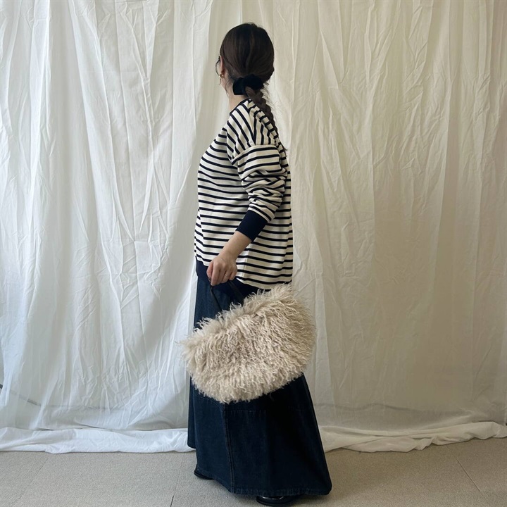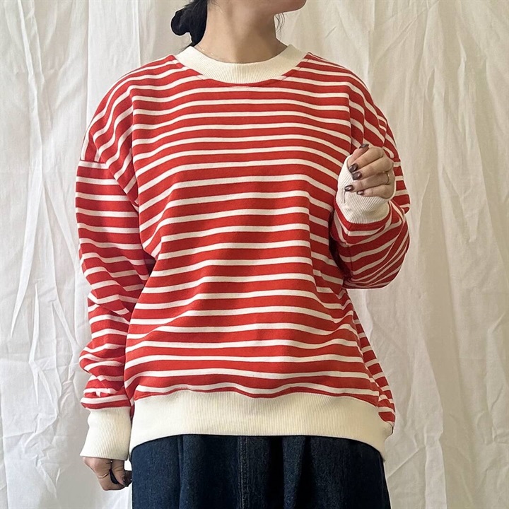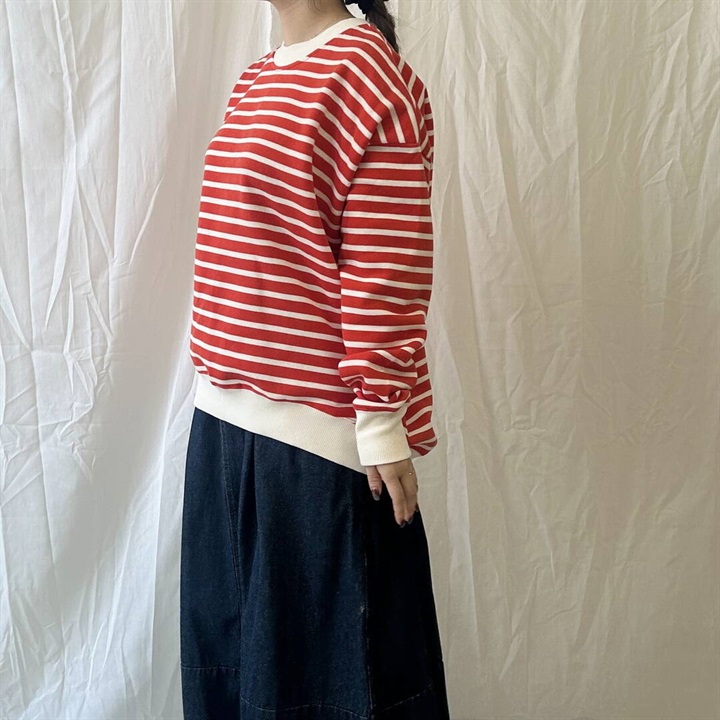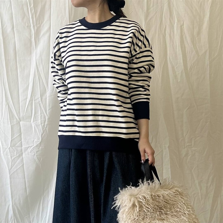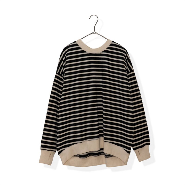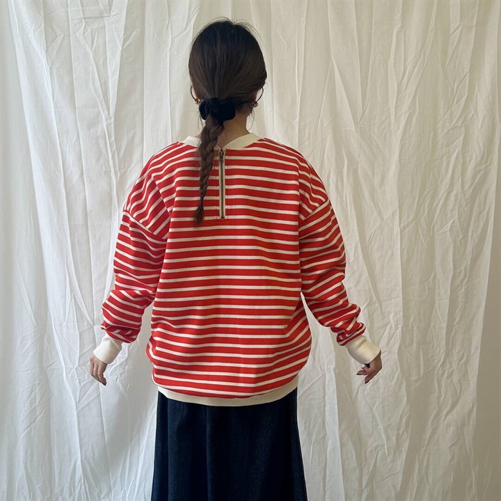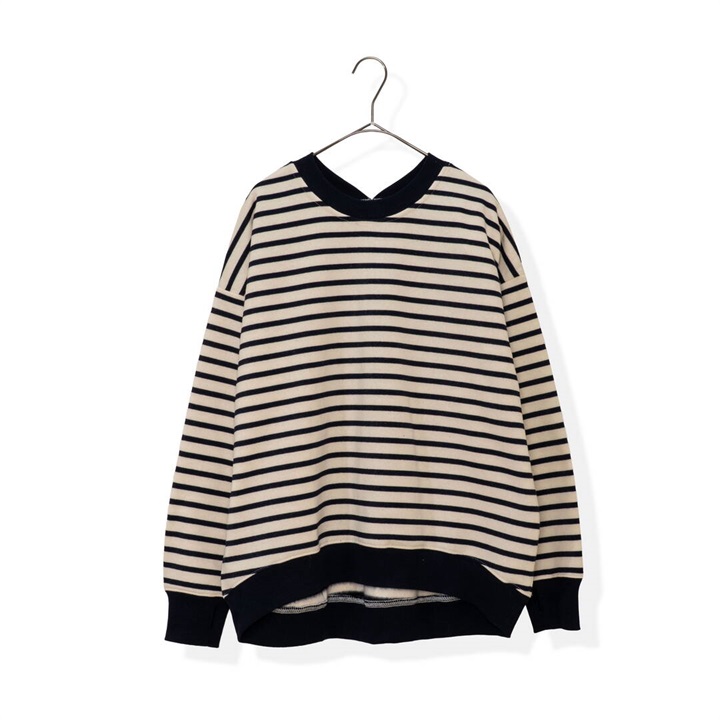 ふんわりと暖かい、裏起毛素材のボーダー柄プルオーバー。CVC(コットン×ポリエステル混紡)生地を使用し、やさしい肌触りと型崩れしにくい丈夫さを両立しました。背中のジップアップがさりげないアクセントになり、後ろ姿まで抜かりなくスタイリッシュ。ゆったりとしたシルエットで、体型を選ばずリラックス感のある着心地です。おうち時間はもちろん、ちょっとしたお出かけやワンマイルウェアにもおすすめ。洗濯機で簡単にお手入れが出来るのも嬉しいポイントです。着用モデル153cmです。 ▼プレゼント用のラッピングバッグはこちら
