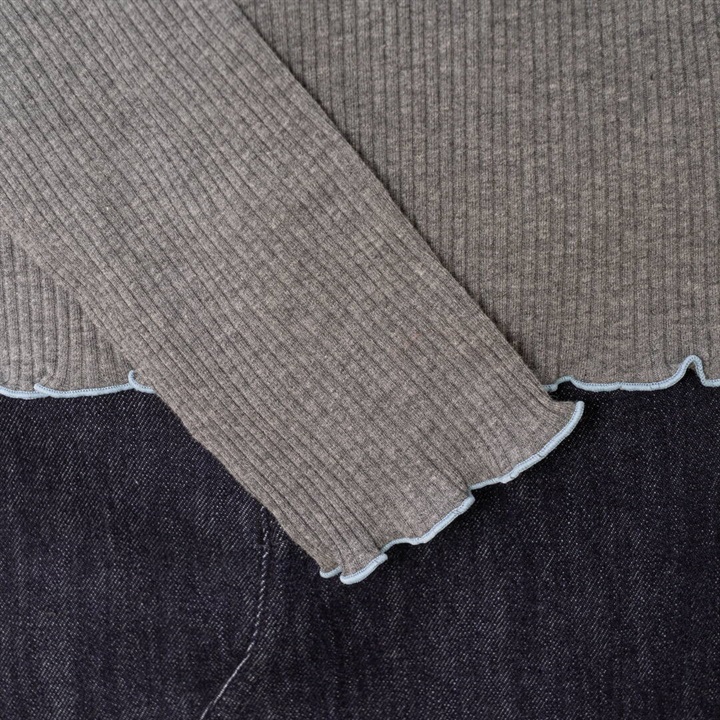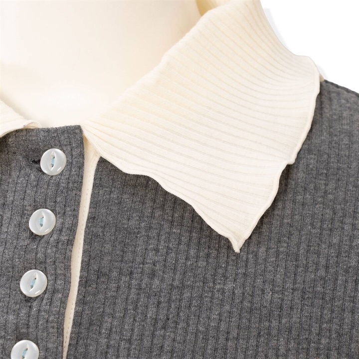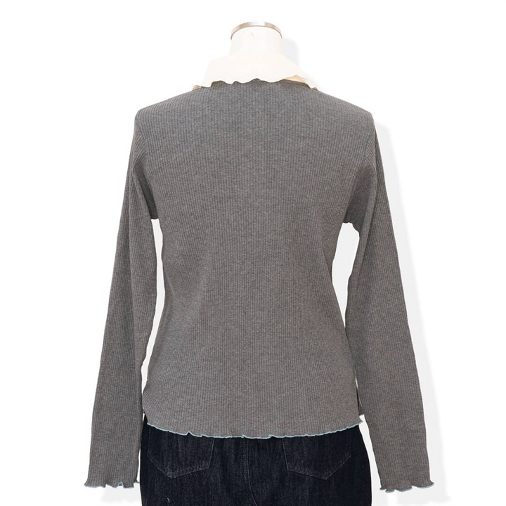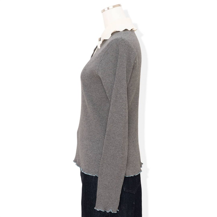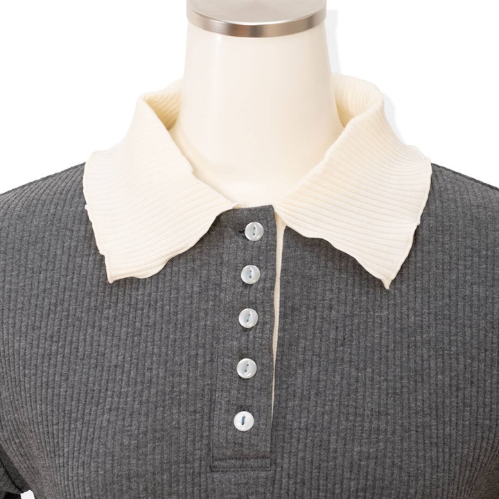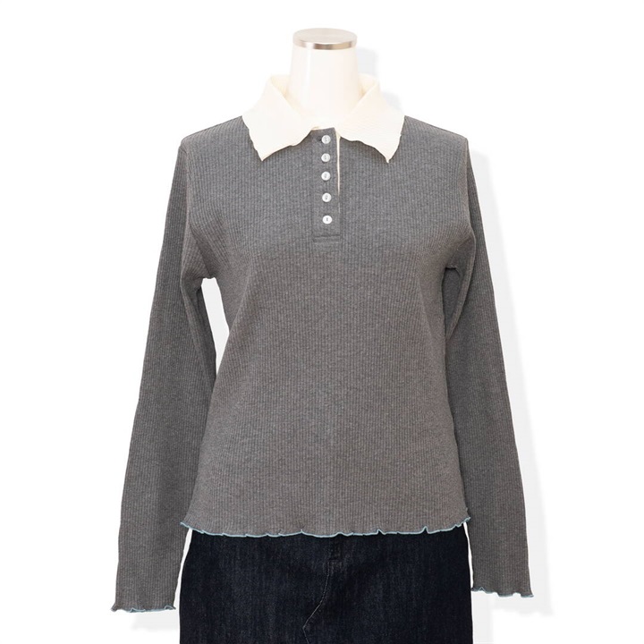 衿付ポロシャツ風のプルオーバー。袖口、裾、衿にメロウ加工でフェミニン感もプラスされています。シャツとレイヤードしたダブル衿合わせコーデもお楽しみいただけます。