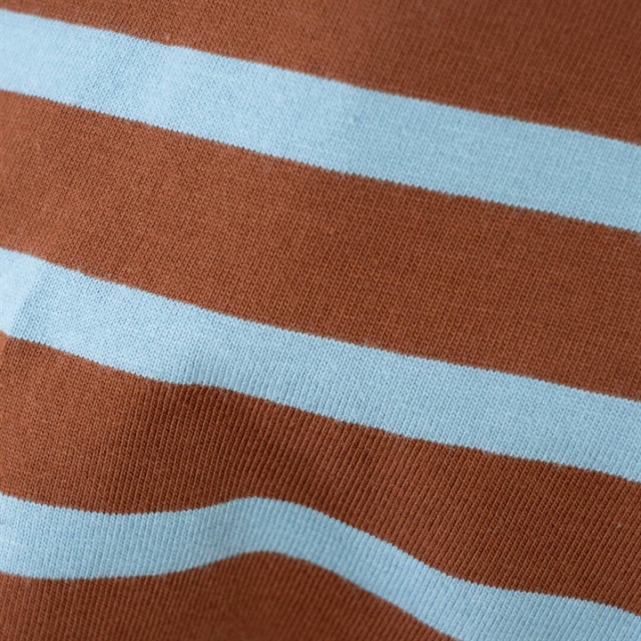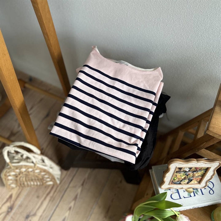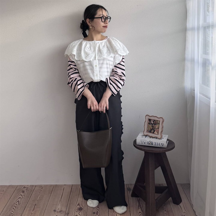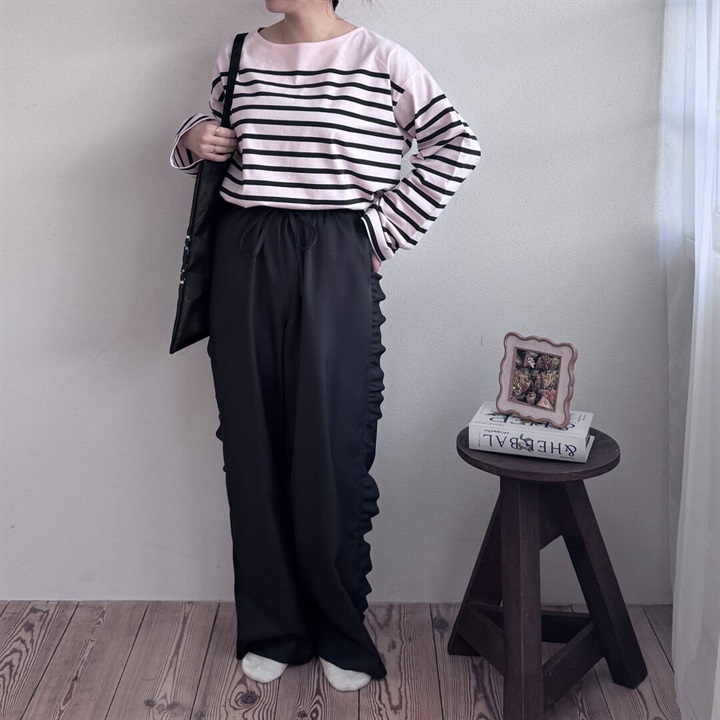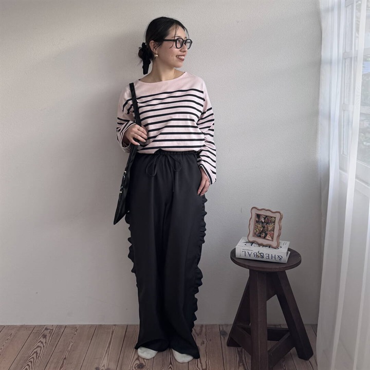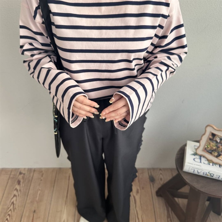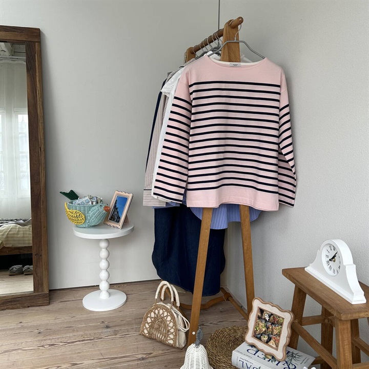1枚でコーディネートが完成するパネルボーダープルオーバー。首元が無地なのですっきり明るい印象です。幅広いコーディネートに活躍するアイテムです。