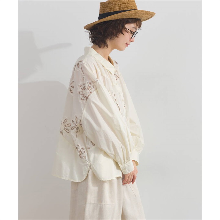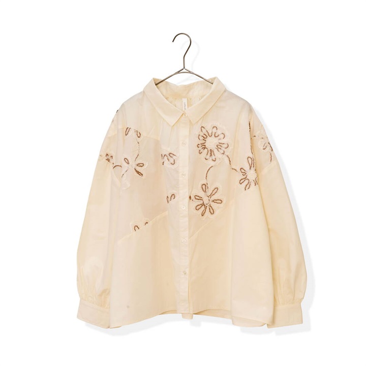 オーバーサイズのシャツにフラワーモチーフがポイントのシャツ。立体的な花柄デザインが目を引きます。首元や袖口にはギャザーが施されこなれた印象に。サイドスリット入りでオーバーシルエットながらすっきり見え◎花柄ですが甘くなりすぎないアイテムです。