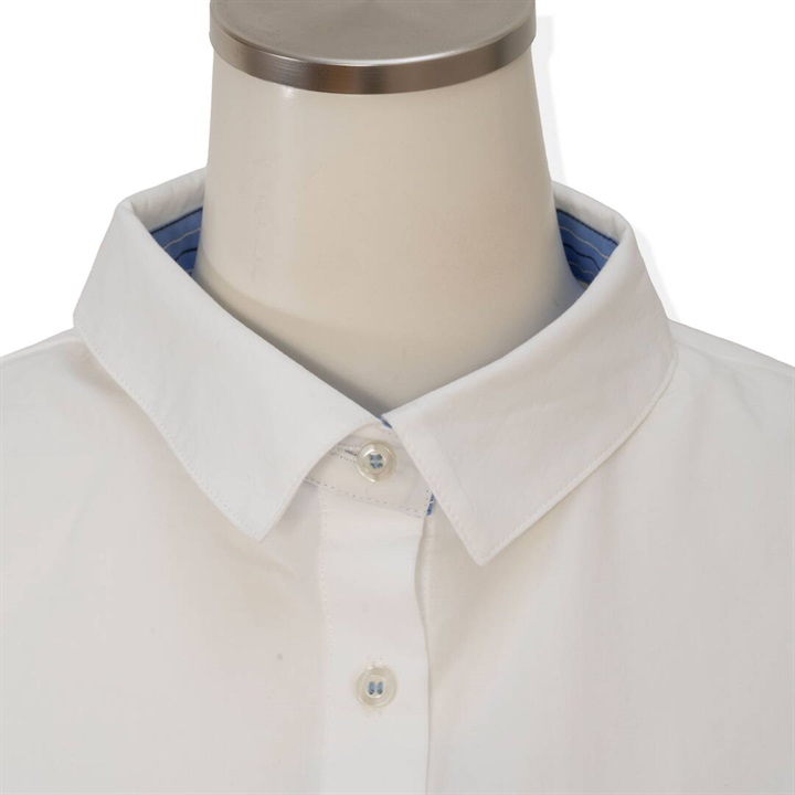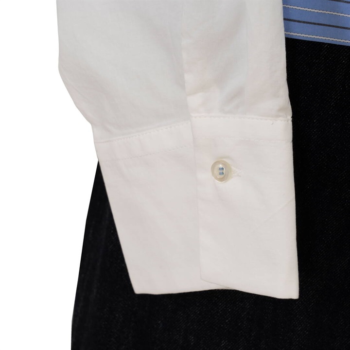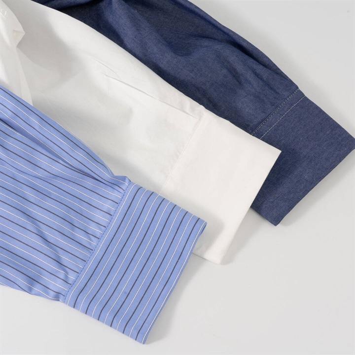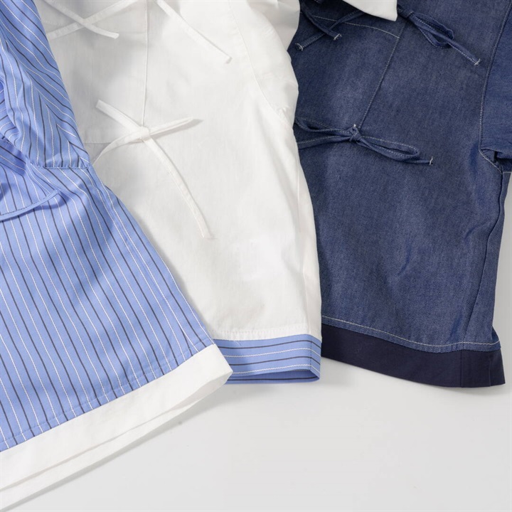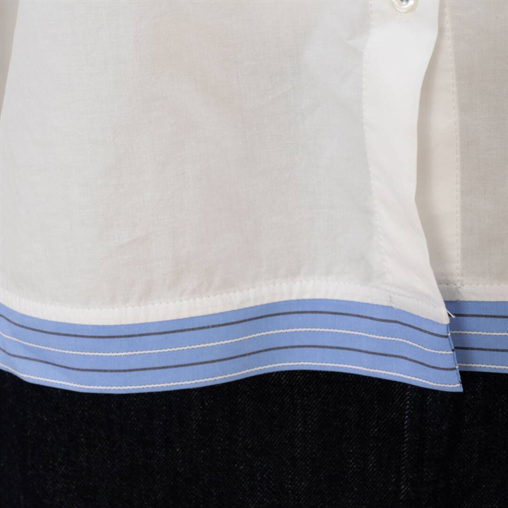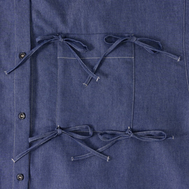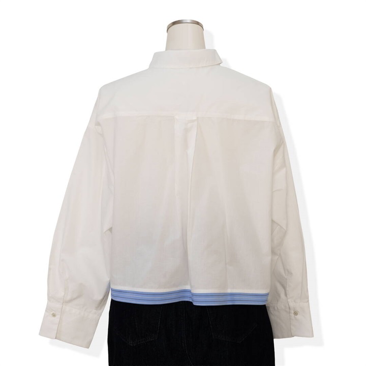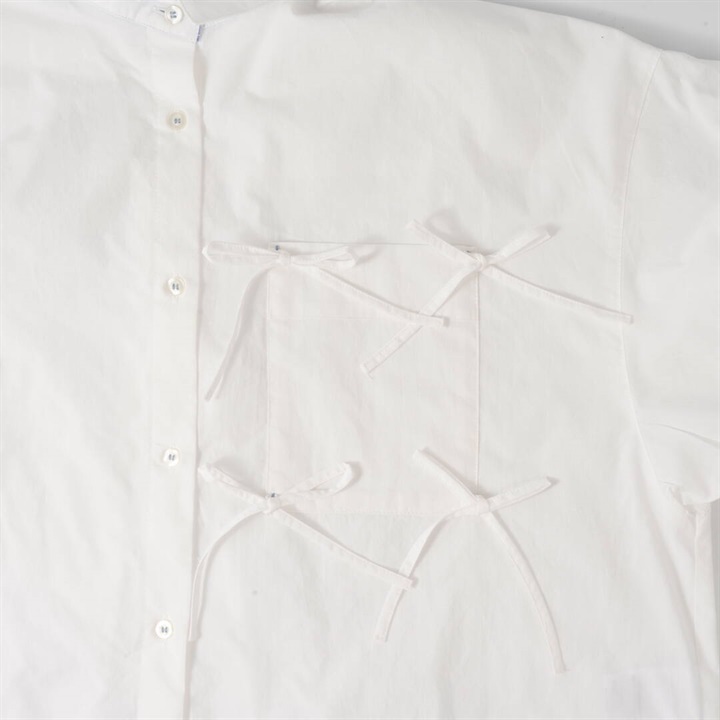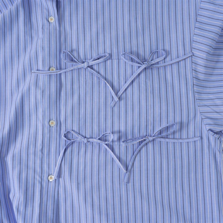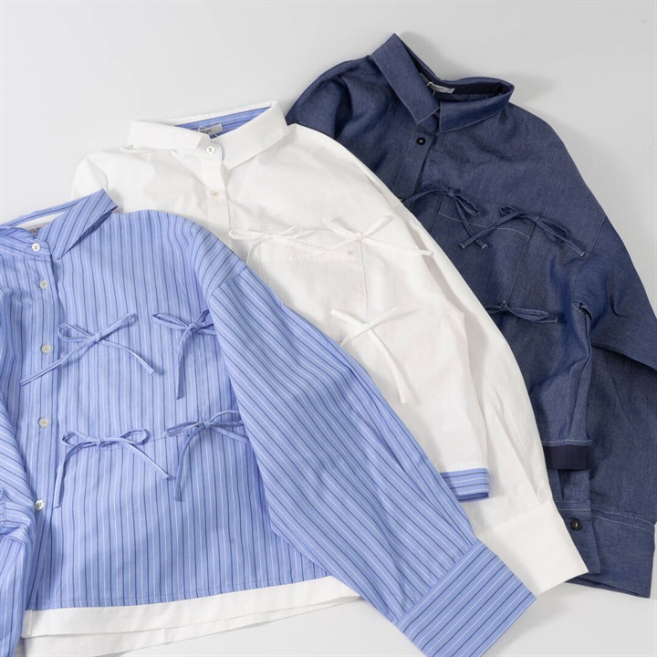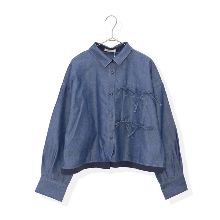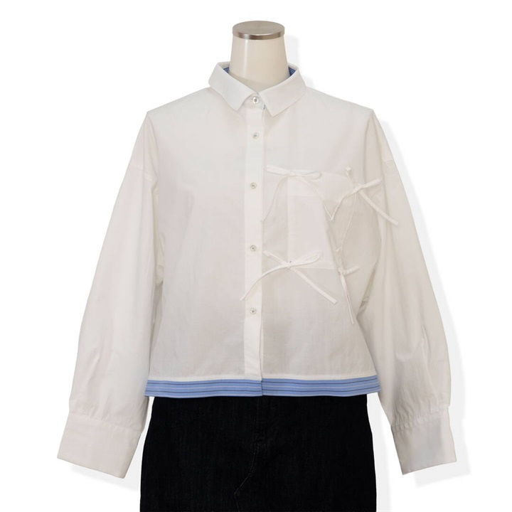 リボンがたくさんついた遊び心のあるシャツ。かっちりしたシャツを今っぽくアレンジ。さらにダブルヘムも付いて甘さときちんと感をバランスよく楽しめる万能シャツです。