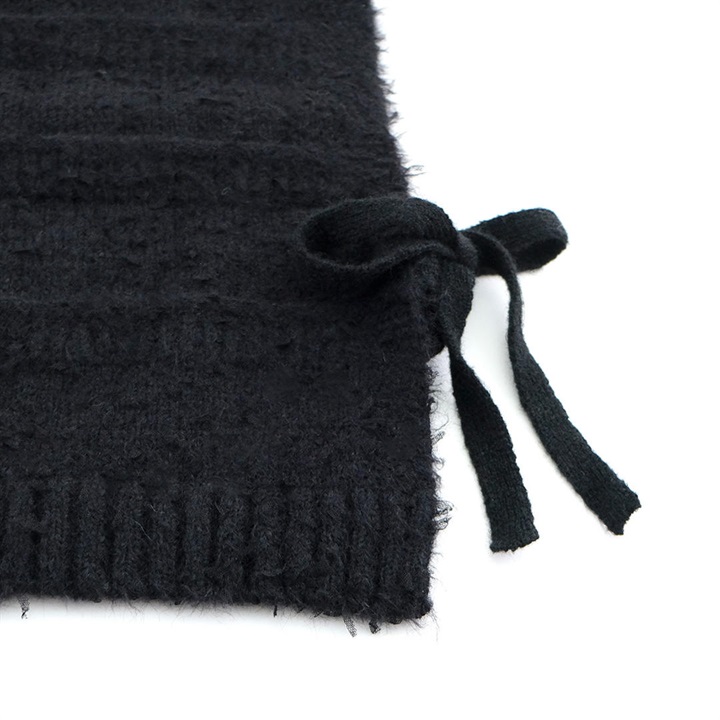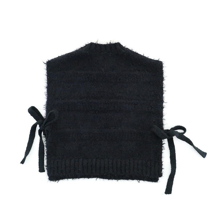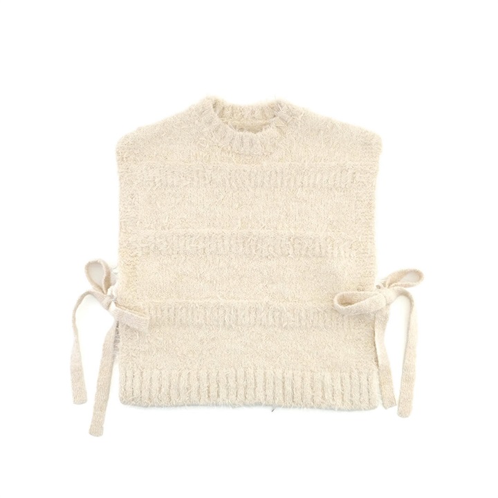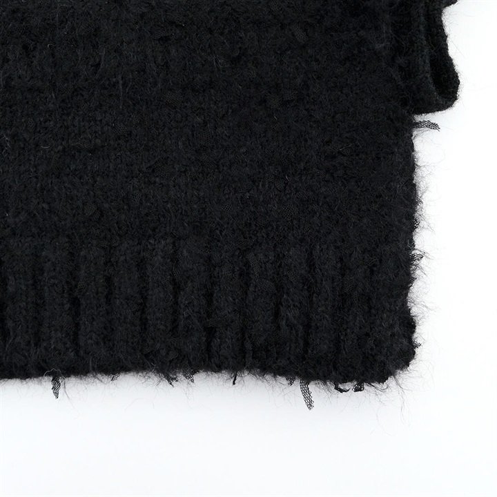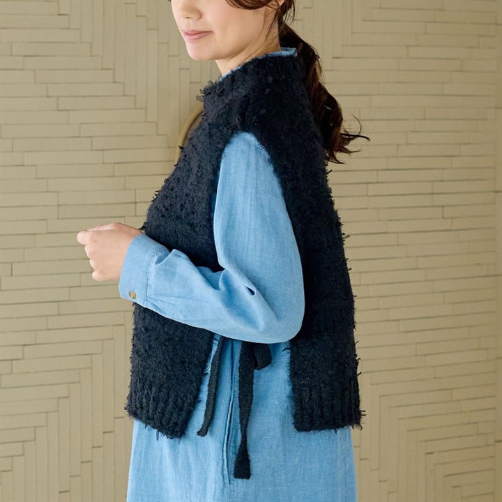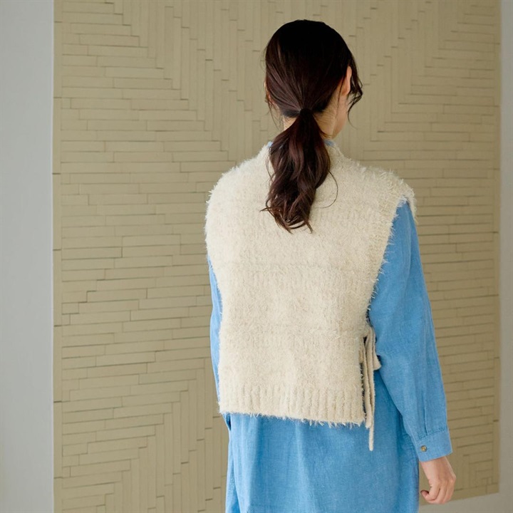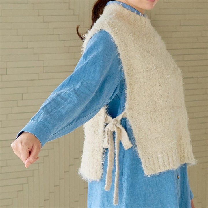 チュールのテープ糸を使用したリボンヤーン素材で、ツイード調に仕上げたニットベスト。