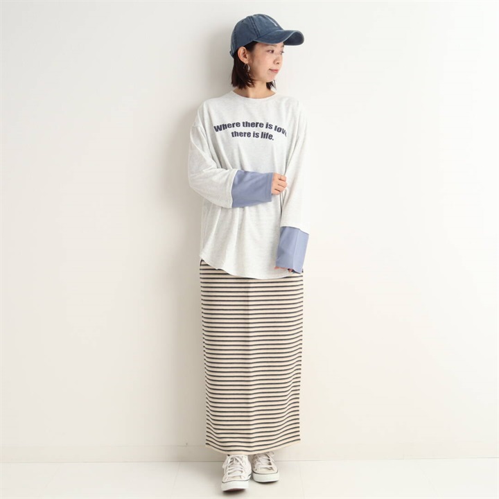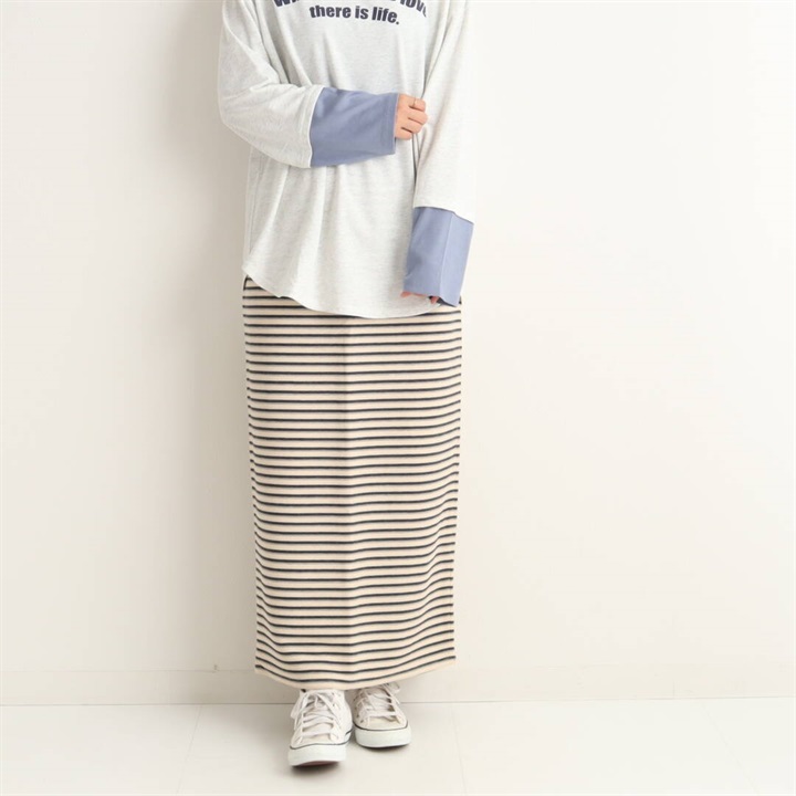 細かいピッチのボーダーナロースカート。ナローシルエットが上品な大人の女性らしさを演出。楽ちんな履き心地ながら、程よくタイトなラインが細見えするデザインです。ロング丈でも裾にスリットが入っているので、足さばきも◎スタイリングの主役になるアイテムです。