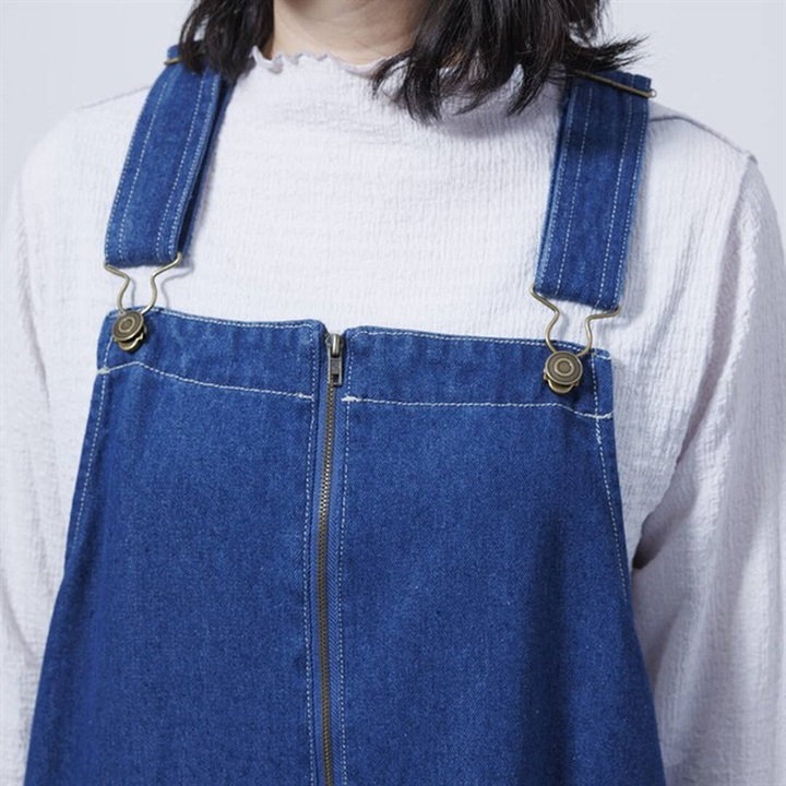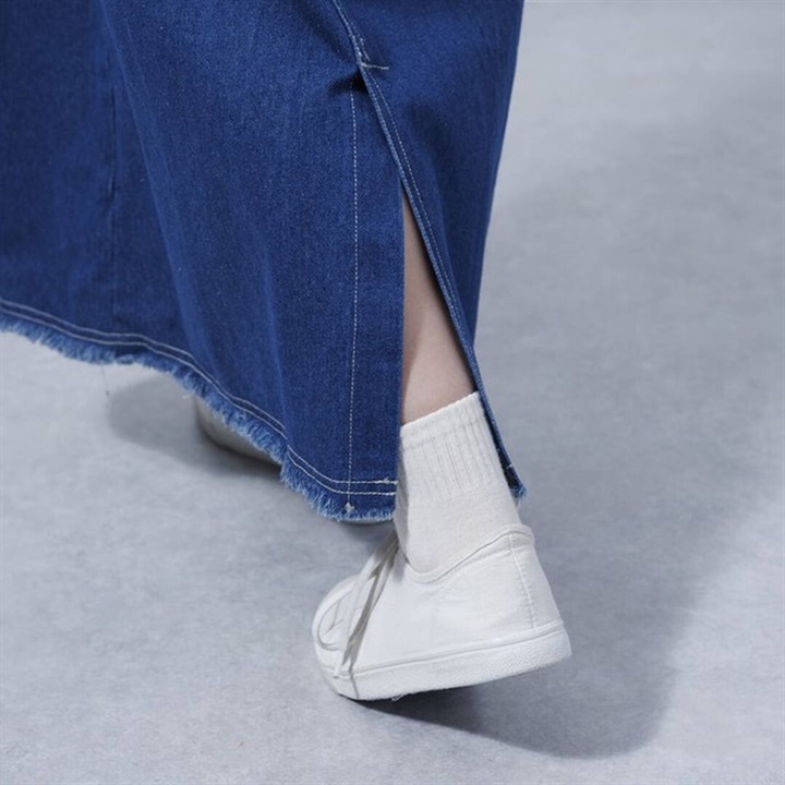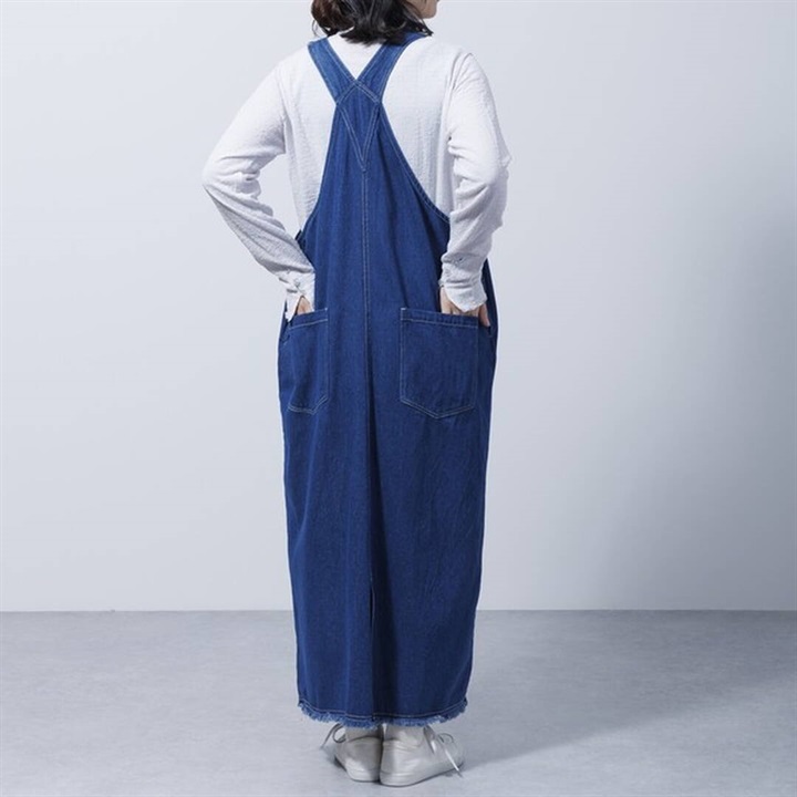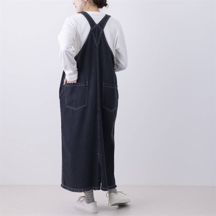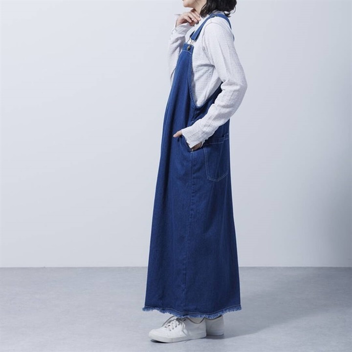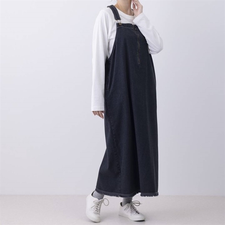 体のラインを拾わないラインシルエットのデニムジャンスカ。シンプルながらもフロントのファスナーや裾のフリンジがさりげないアクセントに。肩紐で長さ調節ができるので幅広い世代の方に着ていただけます。合わせるトップス次第でオールシーズン着回せる万能アイテムです。