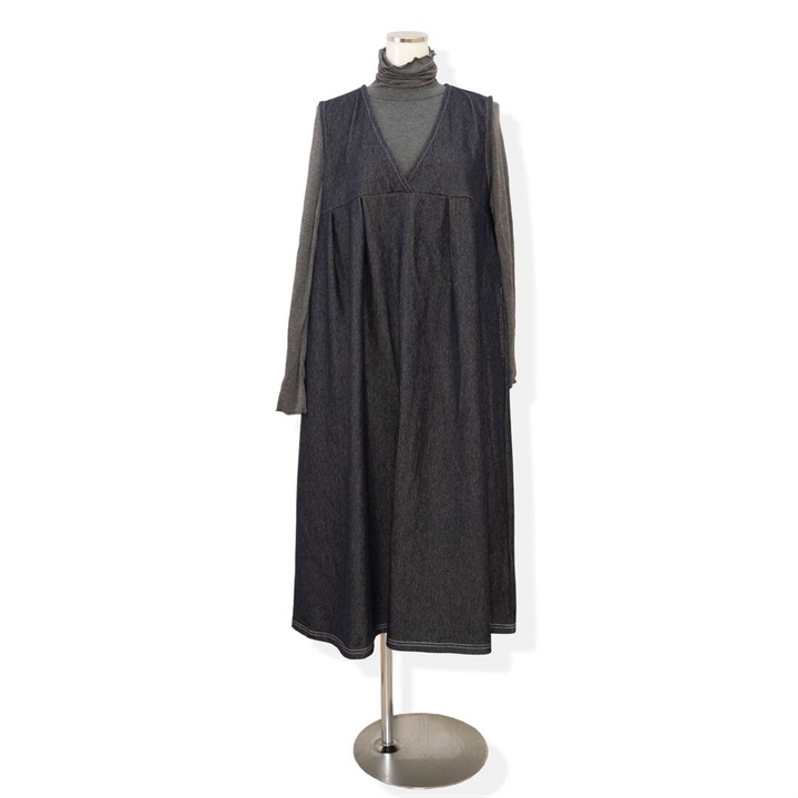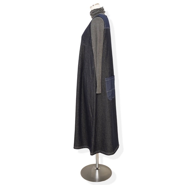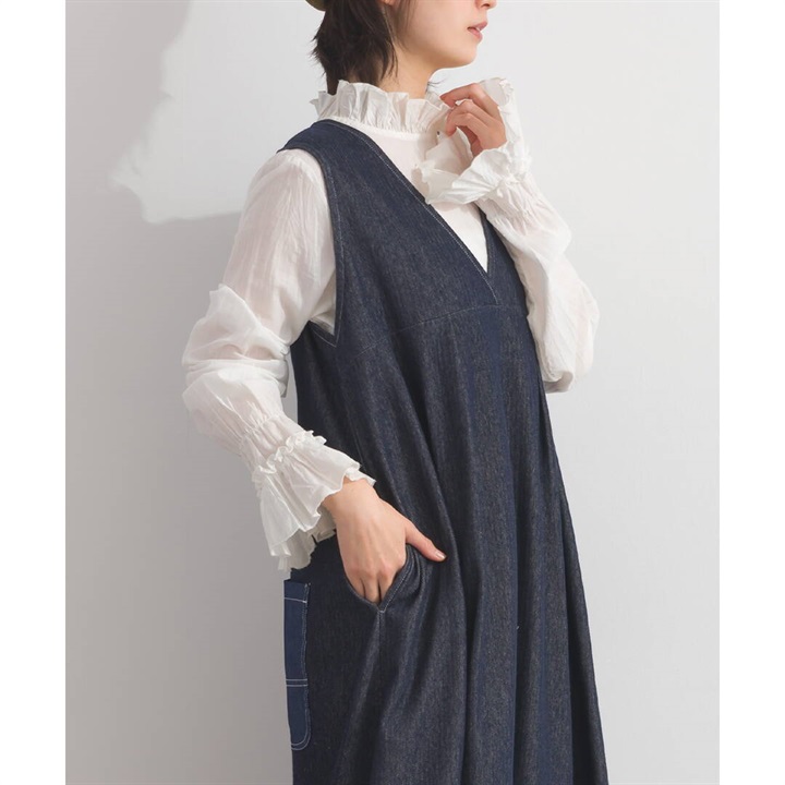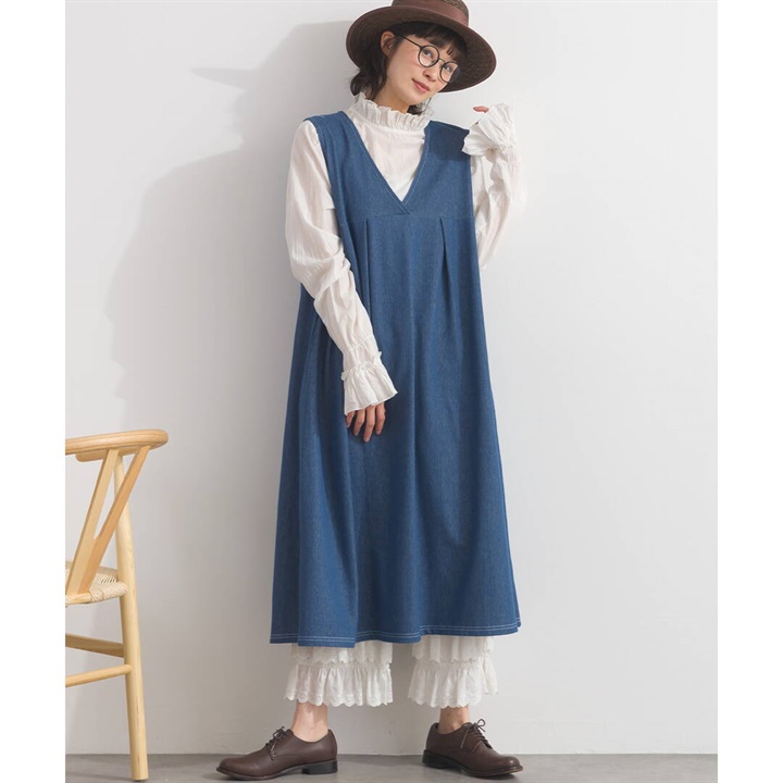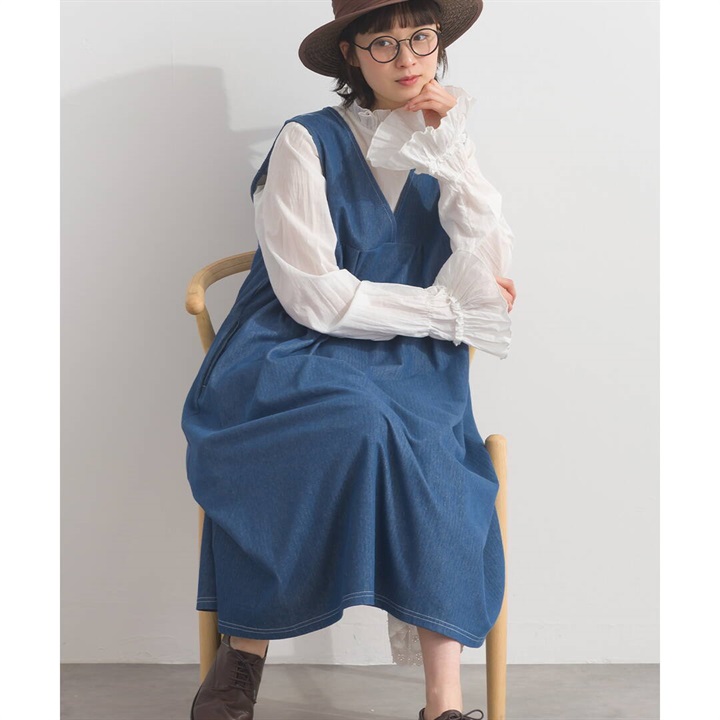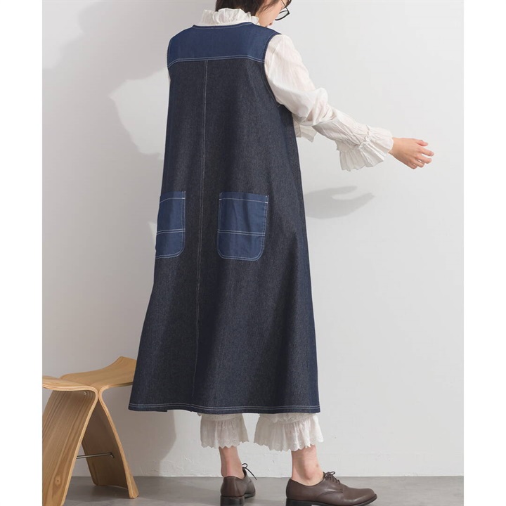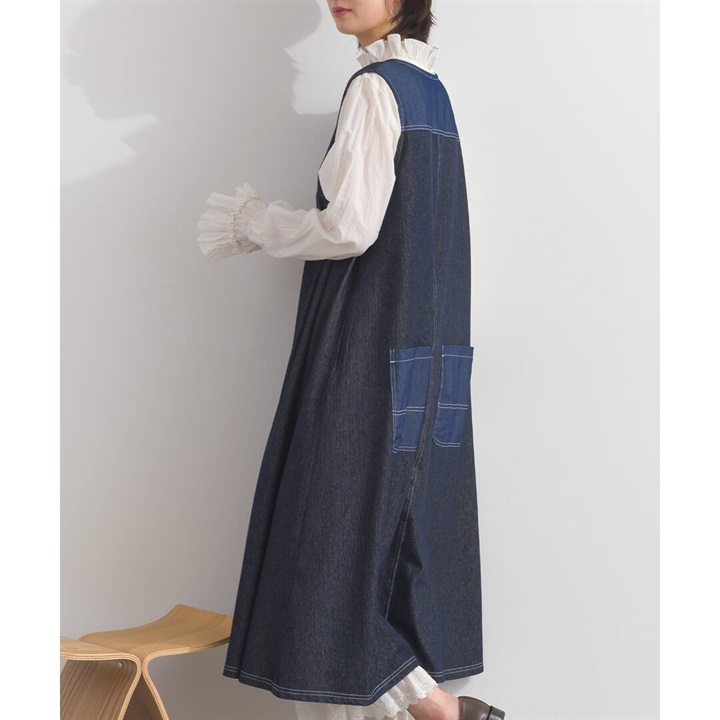 身体のラインを拾わないデニムジャンパースカート。合わせるインナー次第でロングシーズン活躍するアイテムです。前面はシンプルで、Vネックですっきりと。バックデザインは他配色のデニム切り替えがポイント♪サイドポケット付きで日常使いにぴったり!