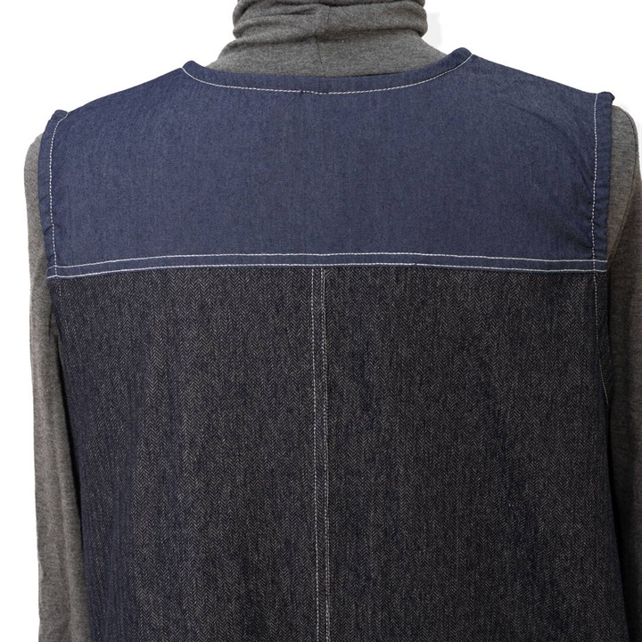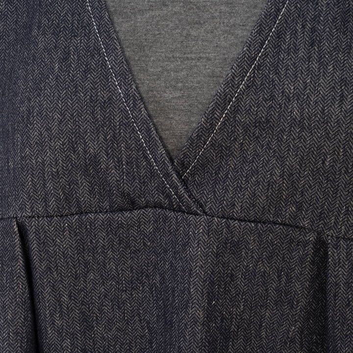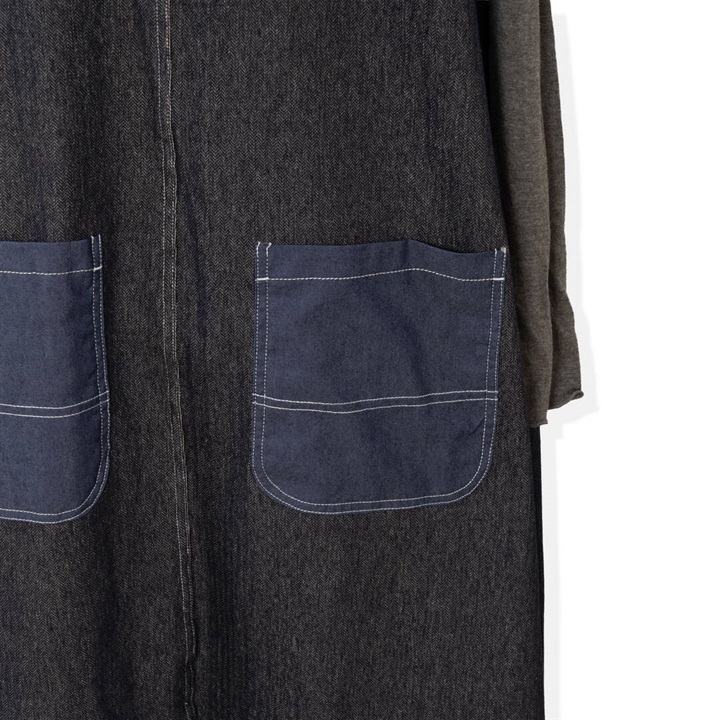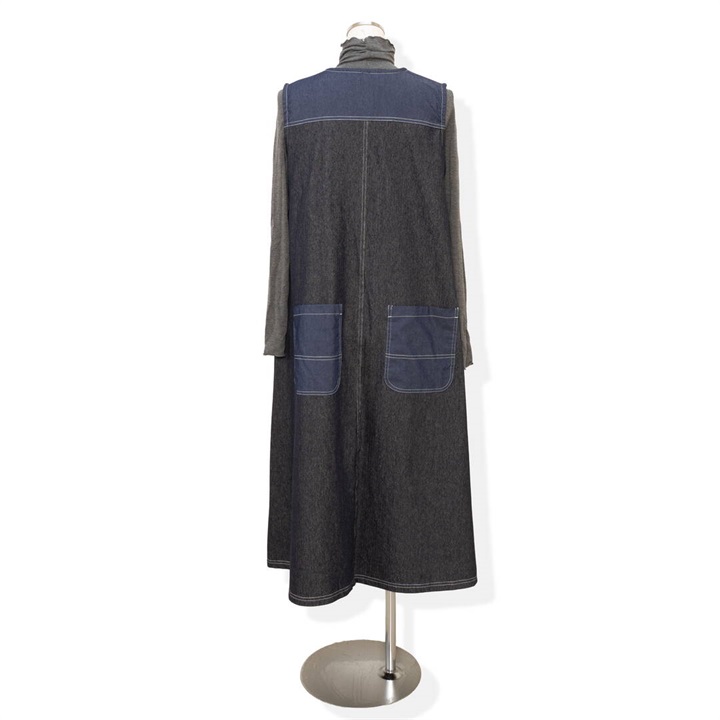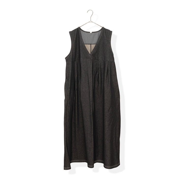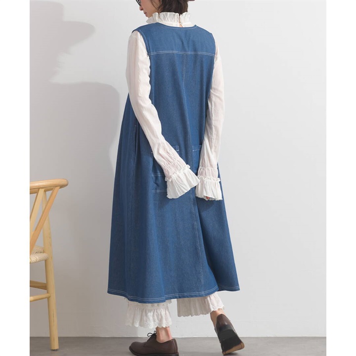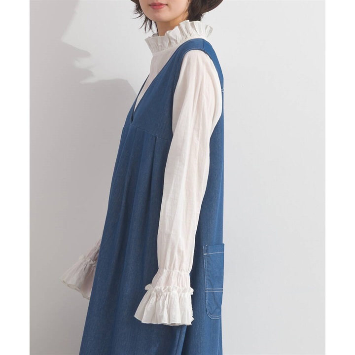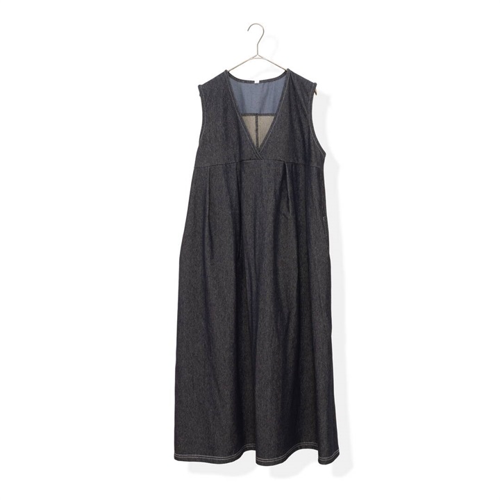 身体のラインを拾わないデニムジャンパースカート。合わせるインナー次第でロングシーズン活躍するアイテムです。前面はシンプルで、Vネックですっきりと。バックデザインは他配色のデニム切り替えがポイント♪サイドポケット付きで日常使いにぴったり!