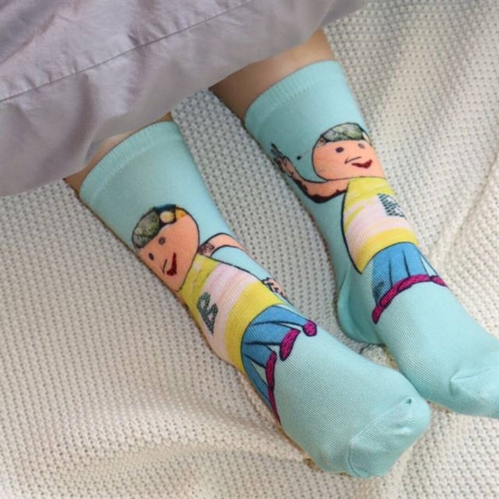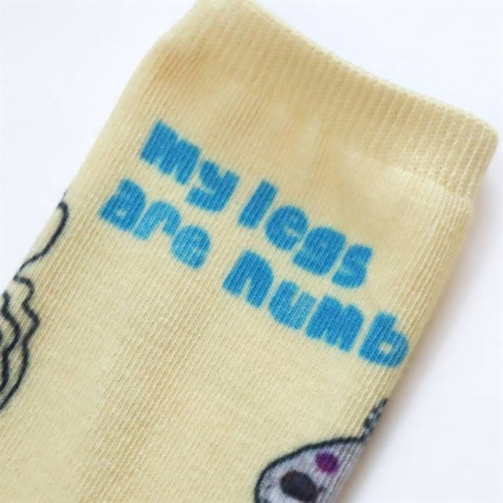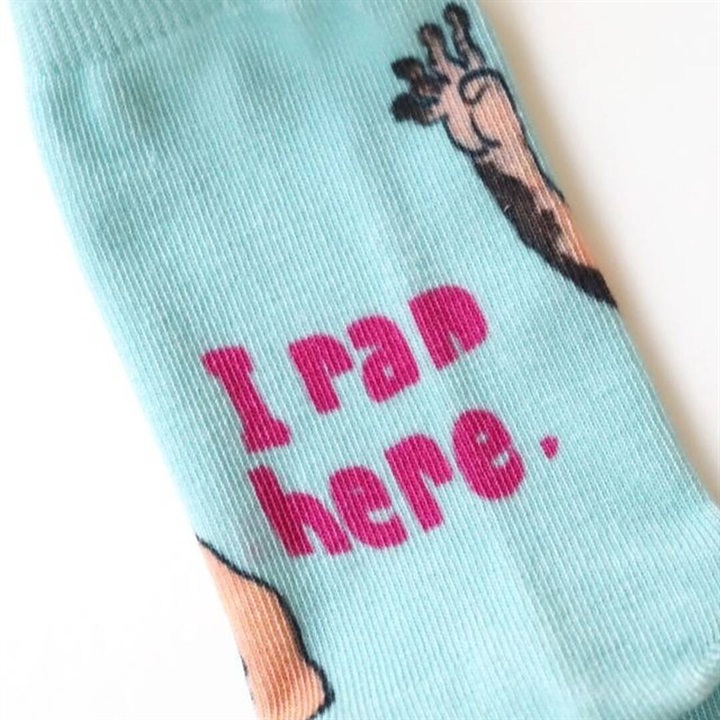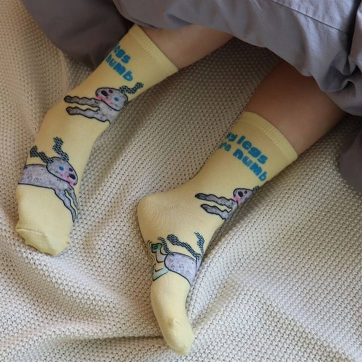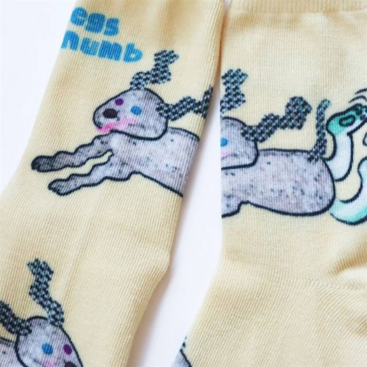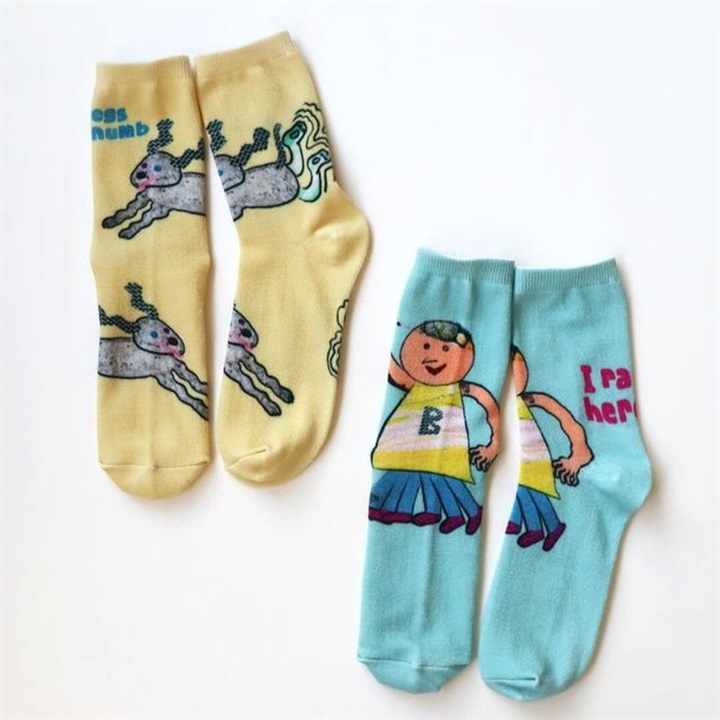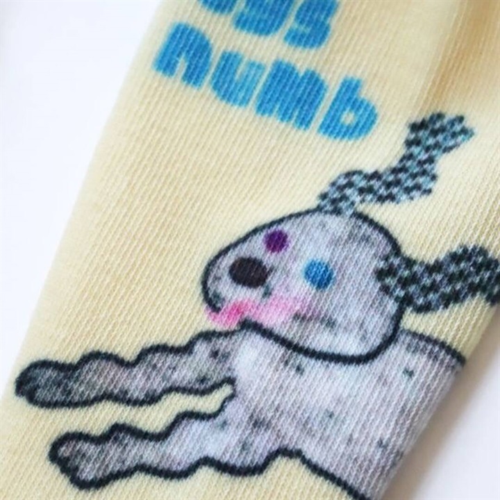 『いま何してる?』おとこのこ『I ran here. (走ってきました)』ワンちゃん『My legs are numb. (足が痺れています)』コラージュイラストをプリントしたソックスです。コラージュなので、男の子の肌の部分は壁の写真を切り抜いて使っていたりします。同様に、ワンちゃんの体は石の写真を使っていますよ!プリントならではの表現がユニークなソックスです♪