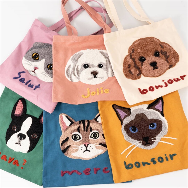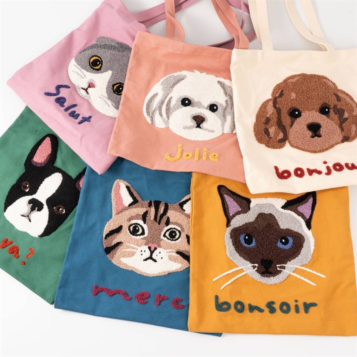 贅沢な犬猫サガラ刺しゅうが心くすぐるトートバッグ。フランス語で描かれた手書き風のロゴもアクセントに。大人かわいデザインなので、どんな方でも持ちやすく、犬猫好きさんへのプレゼントにもおすすめです♪セカンドバッグや、サブバッグとしても◎ ▼プレゼント用のラッピングバッグはこちら