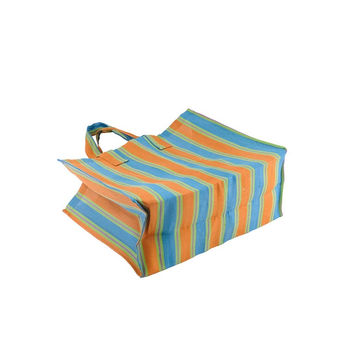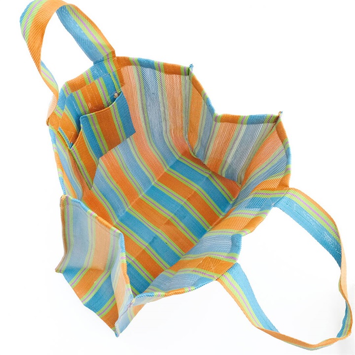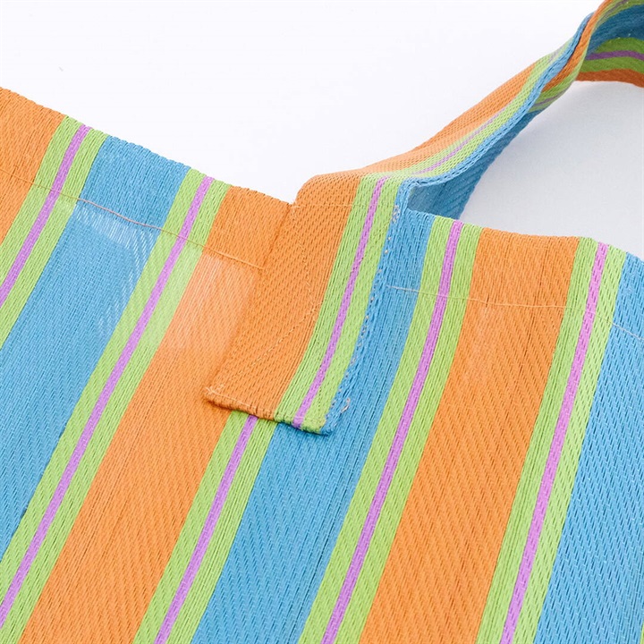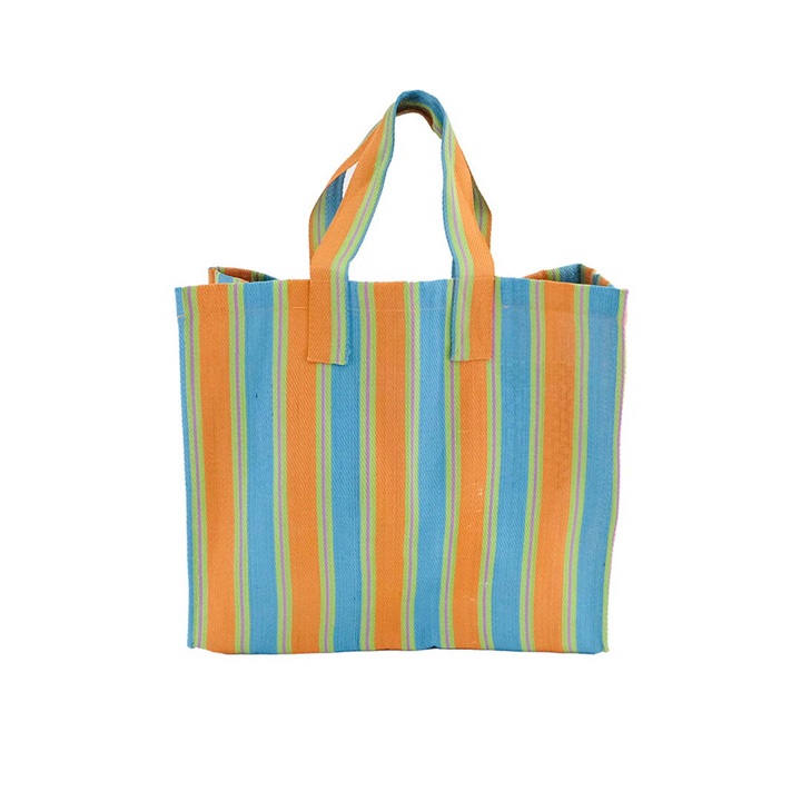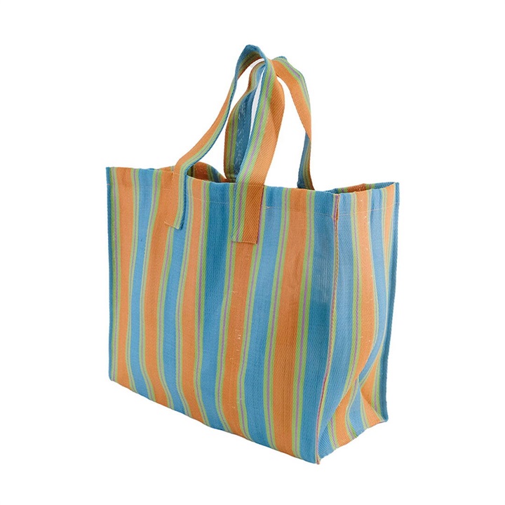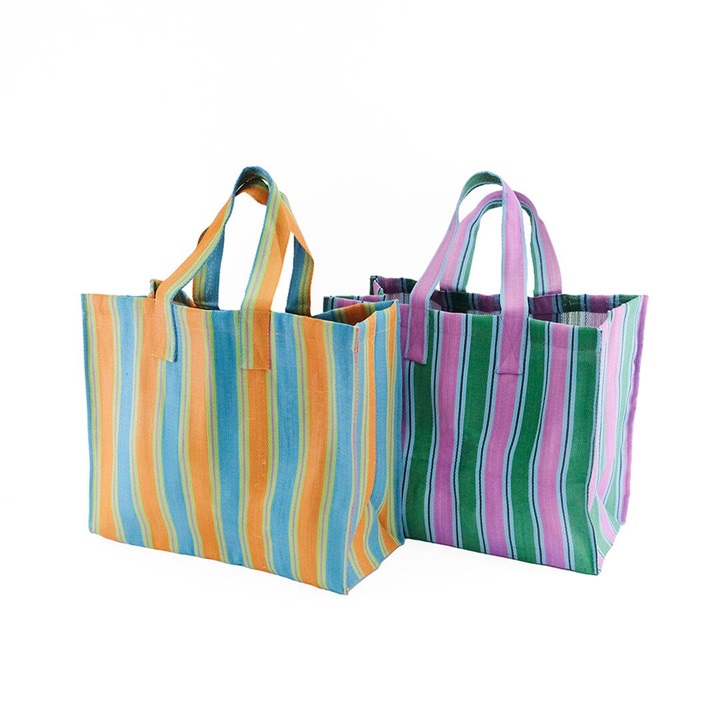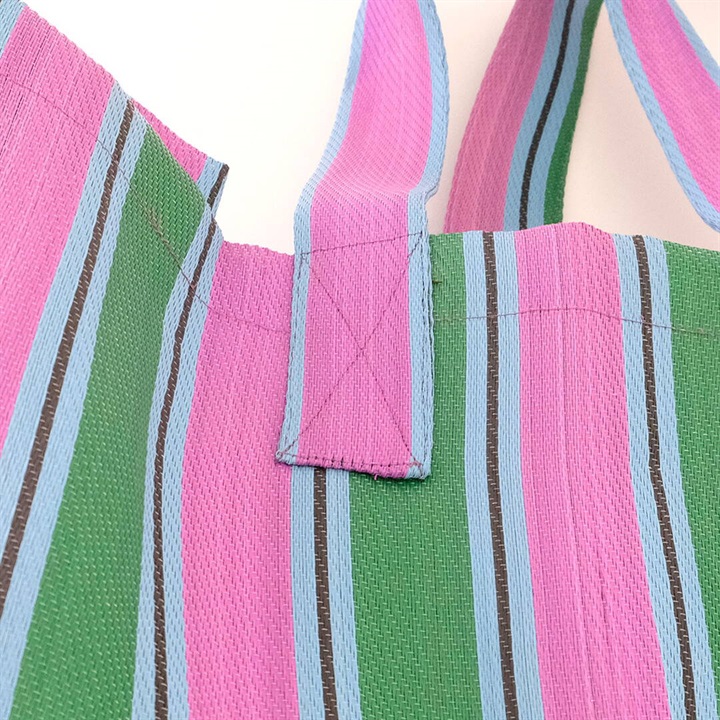 廃棄されたペットボトルやポリ袋を再利用して作られた、リサイクル素材を使用したストライプ柄のバッグ。