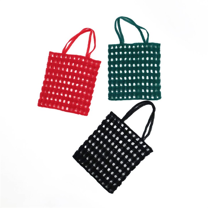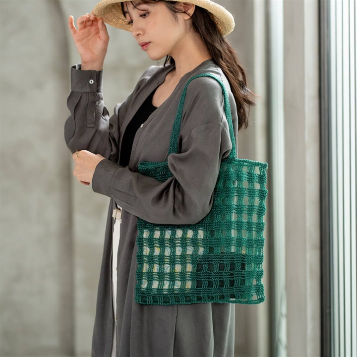 色違いで欲しくなるチェック柄のクロシェ編みが目を引くバッグは、軽量で水に強いポリエチレン素材を使用しています。