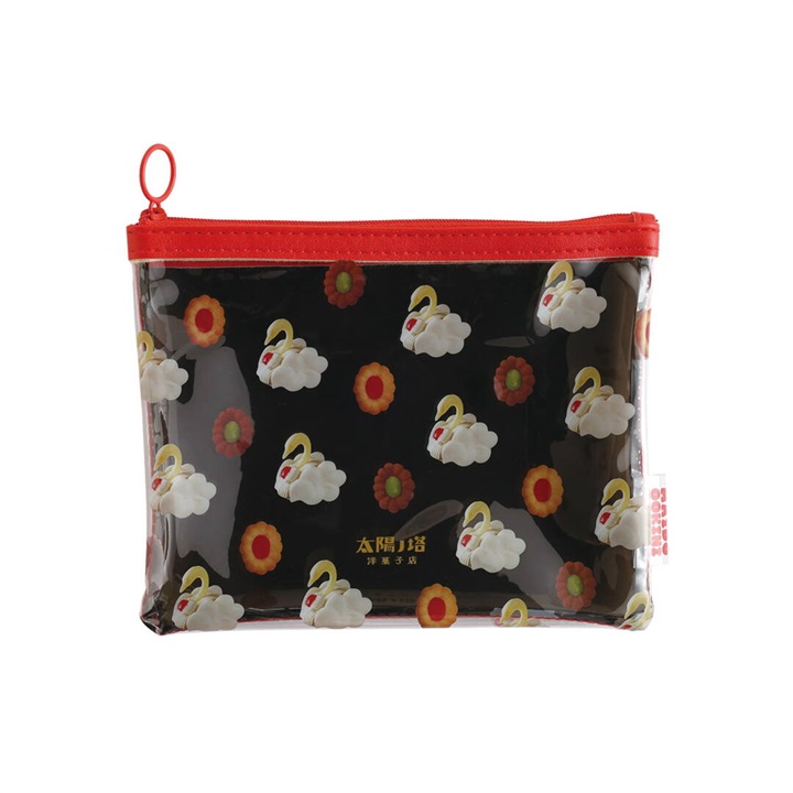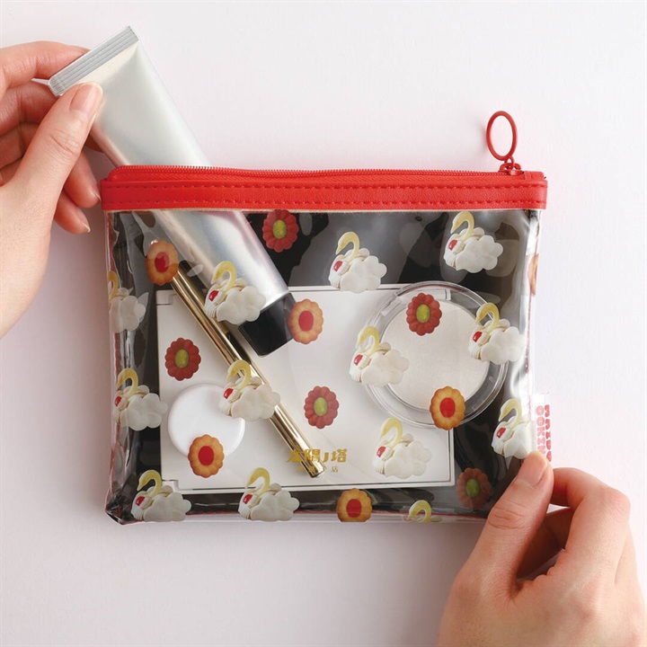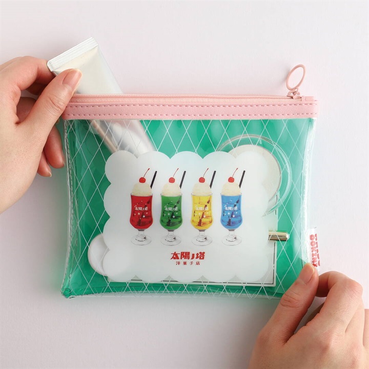 太陽ノ塔洋菓子店の世界観がぎゅっと詰め込まれたPVCポーチ。コスメやモバイルバッテリーなども持ち運びできる、程よいサイズ感です。