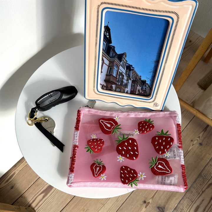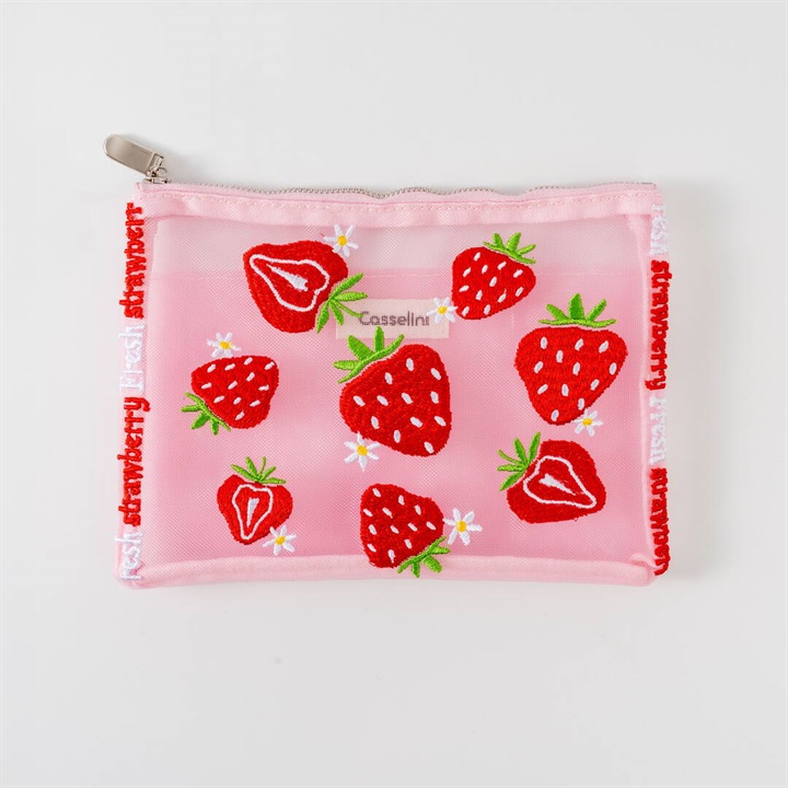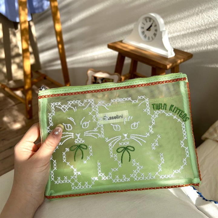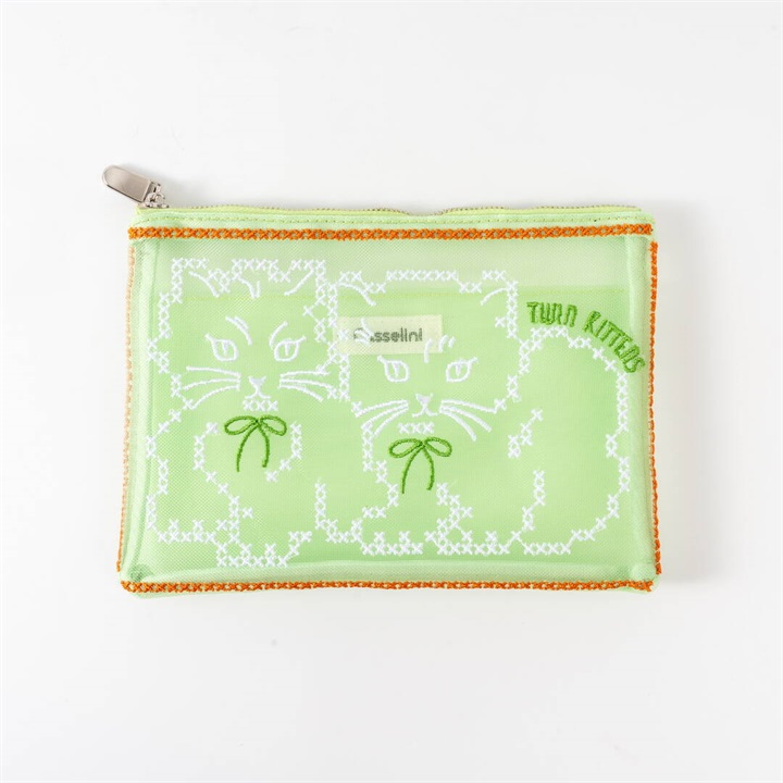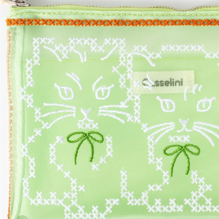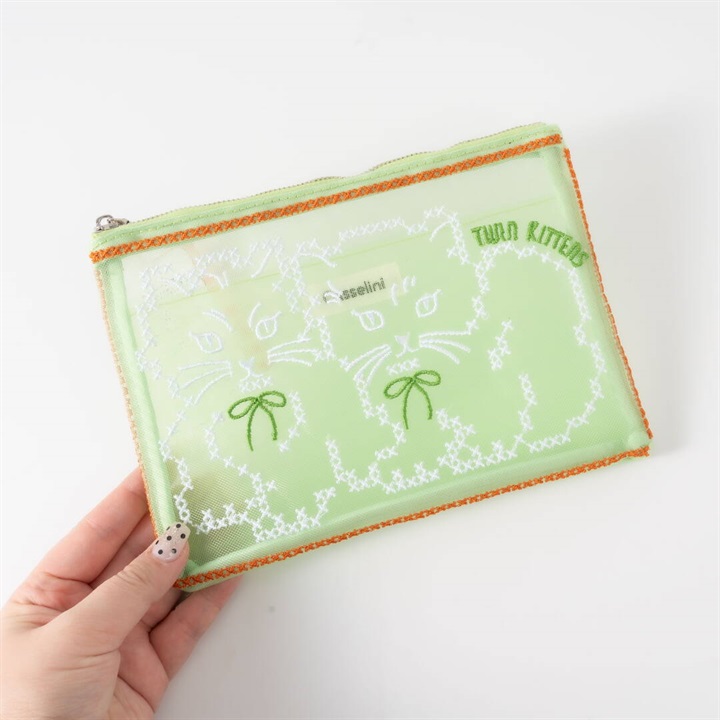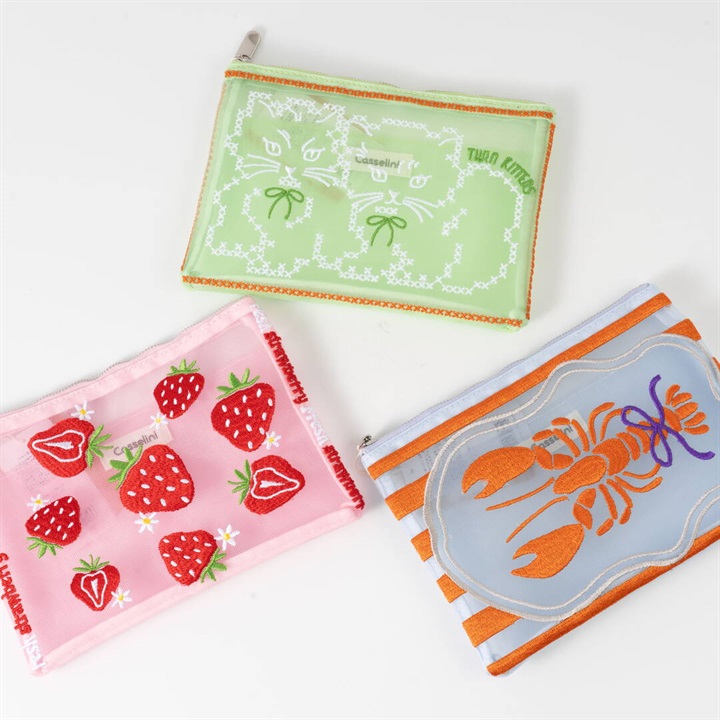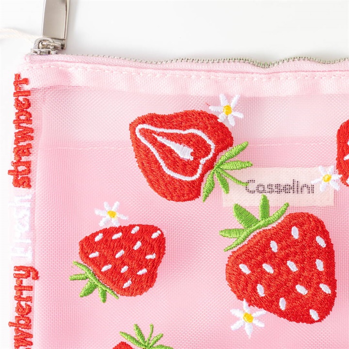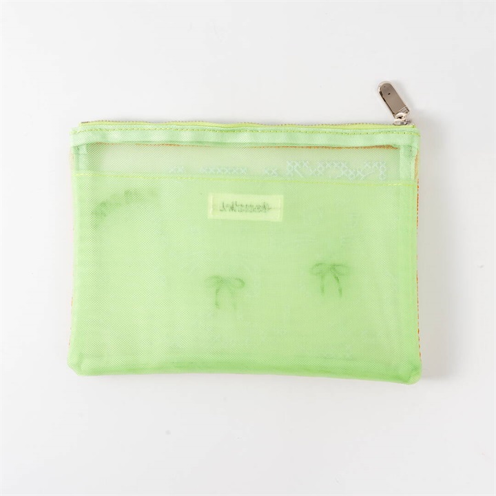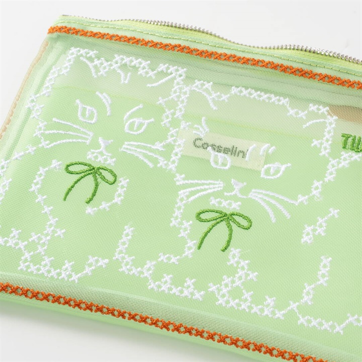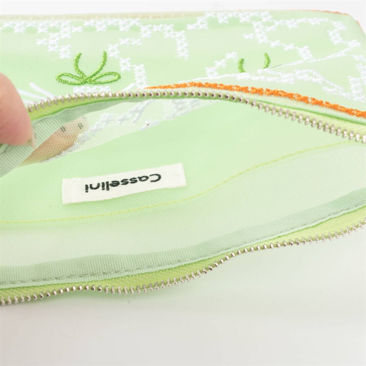 キャセリーニ定番のチュール刺繍ポーチです。大容量且つ中にはポケットも付いているため、収納のしやすさも◎普段、色物を持たない方でも、チュールだと挑戦しやすく、クリアバッグに入れて見せて使うのもおすすめです。透ける生地ですが、柄が大きくインパクト大なので、中身が見えにくく気兼ねなく使える仕様です。