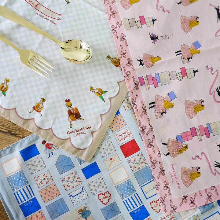 懐かしく、温かみのあるイラストが人気のイラストレーターくらはしれいさんのハンカチシリーズ。レトロなデザインが海外絵本のようで心ときめきます。乙女心くすぐる柔らかなカラーリングで、ささやかなギフトにもぴったりです。